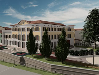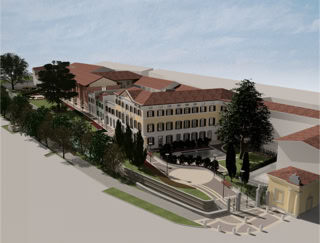 The intervention of building substitution refers to the new building designed for the area of gardens and rustic buildings. The new architecture, by its composition, typology and construction technology interprets and embodies the “spirit of the place”, and restores an inclusive rather than an exclusive relation with the “old” buildings. By completing the urban elevation along the Colleone wall it establishes a relation with the old palazzo through a construction of symmetry whose axis is represented by the axis of the existing little house of romantic overtones. The adjacent low volume, crowned with a balustrade, is of course reproposed, with some adaptations, of same dimensional and architectonic proportions. With this compositional process a dialog is introduced between the old and the new architecture. The conformation to the local area and the surrounding built environment dictates the arrangement of the new building plan.