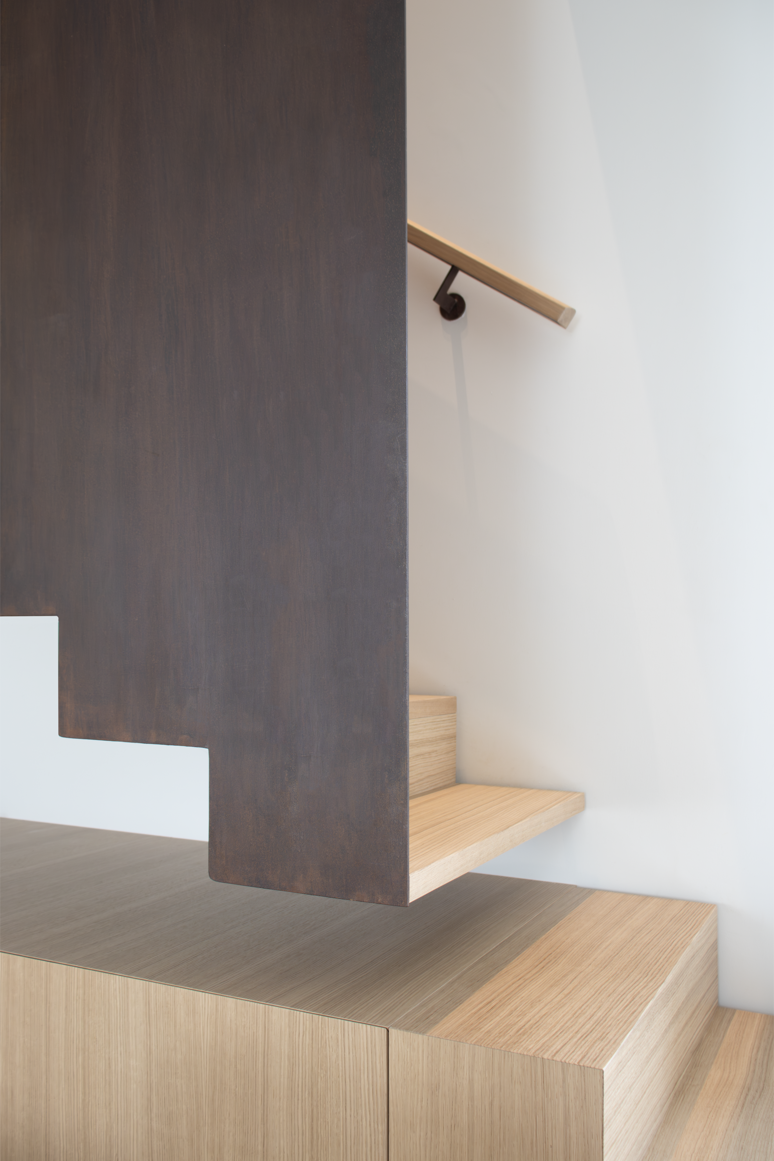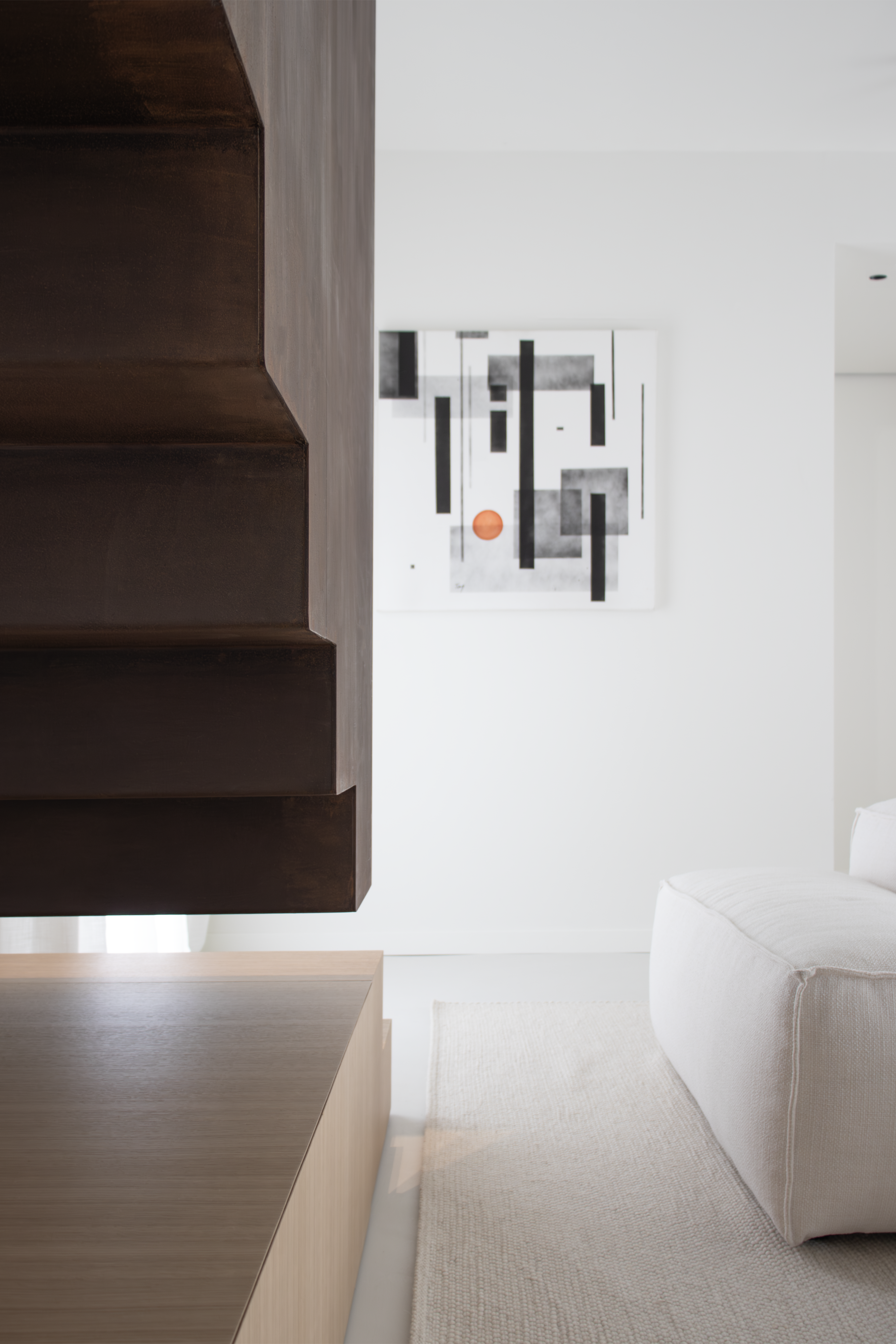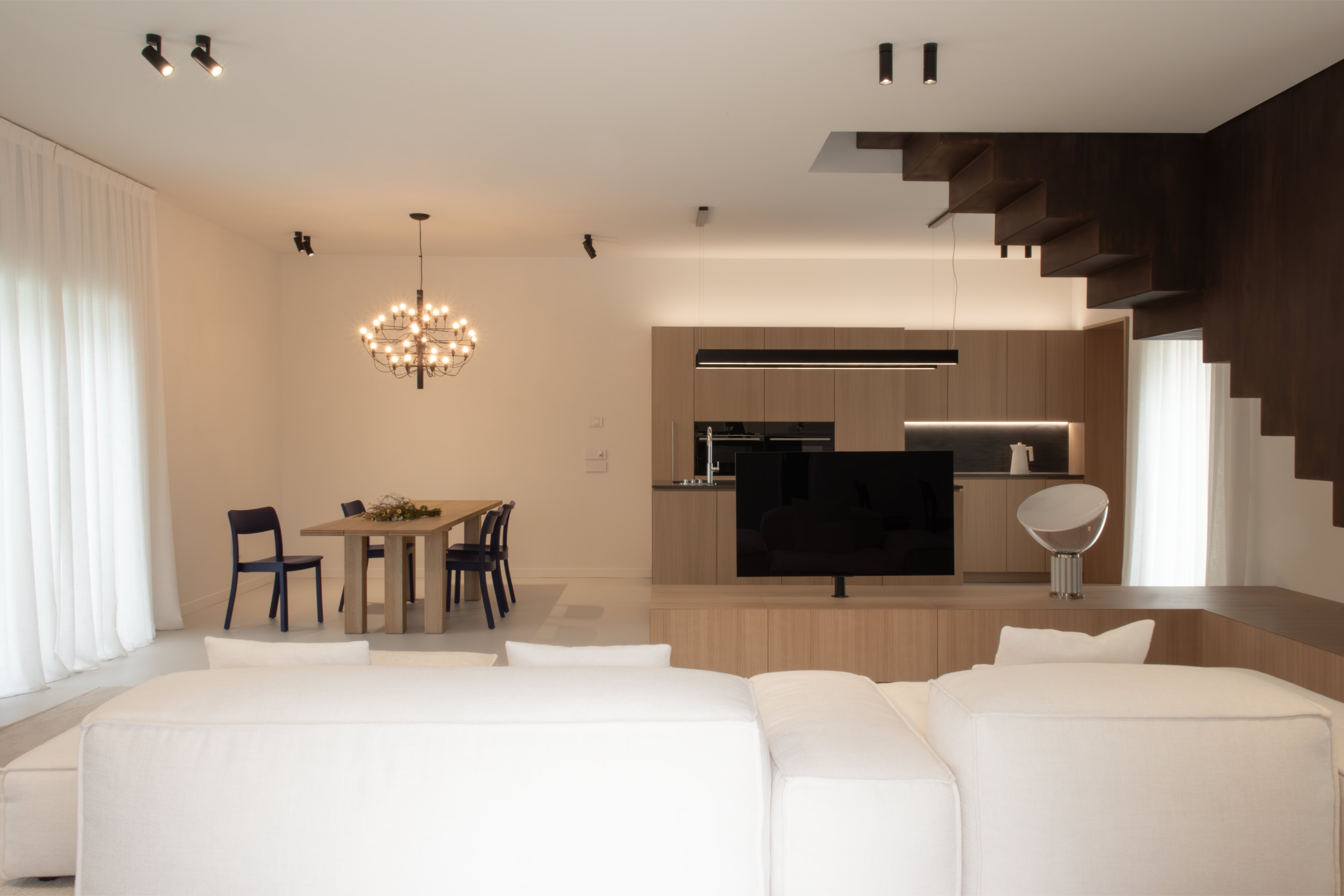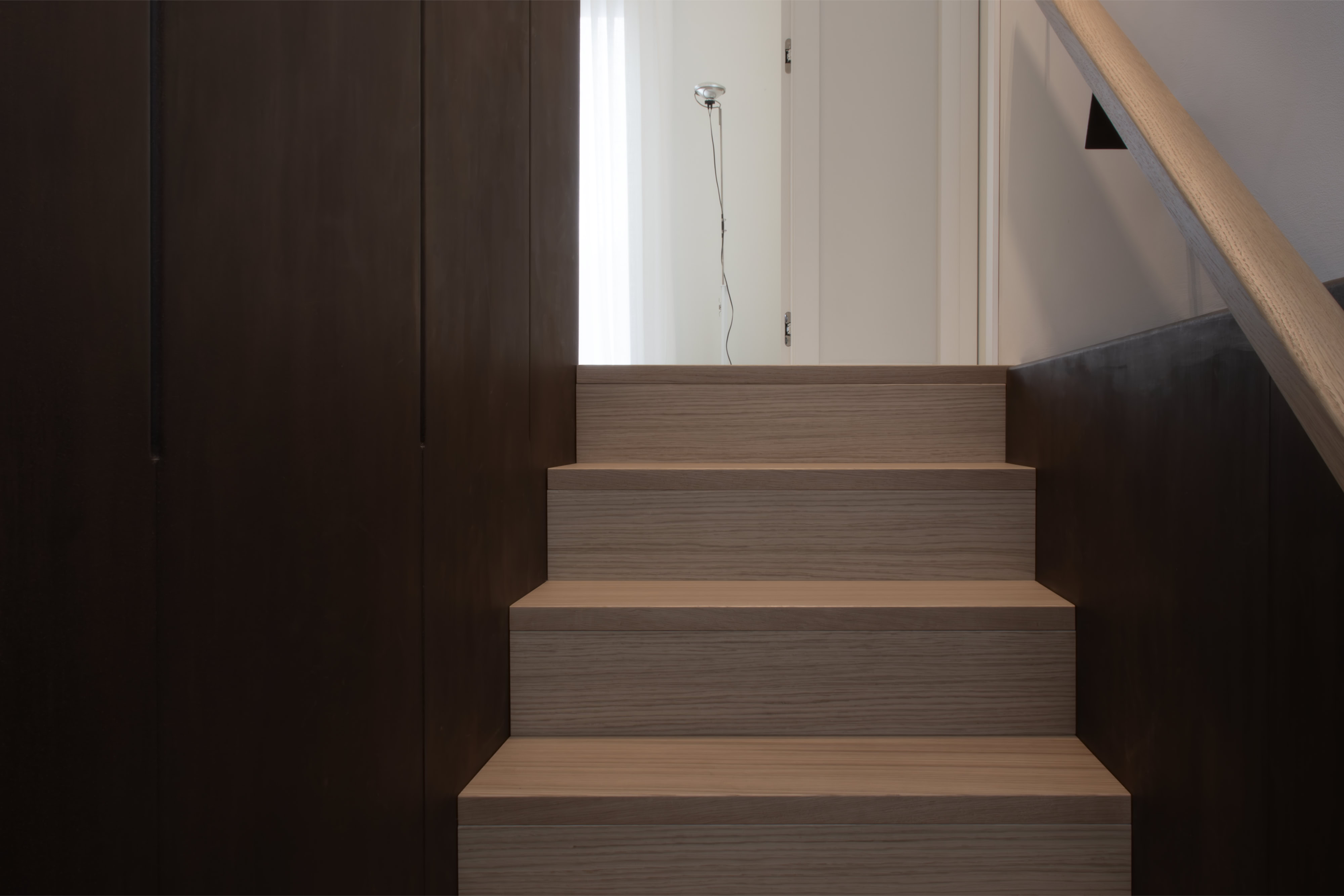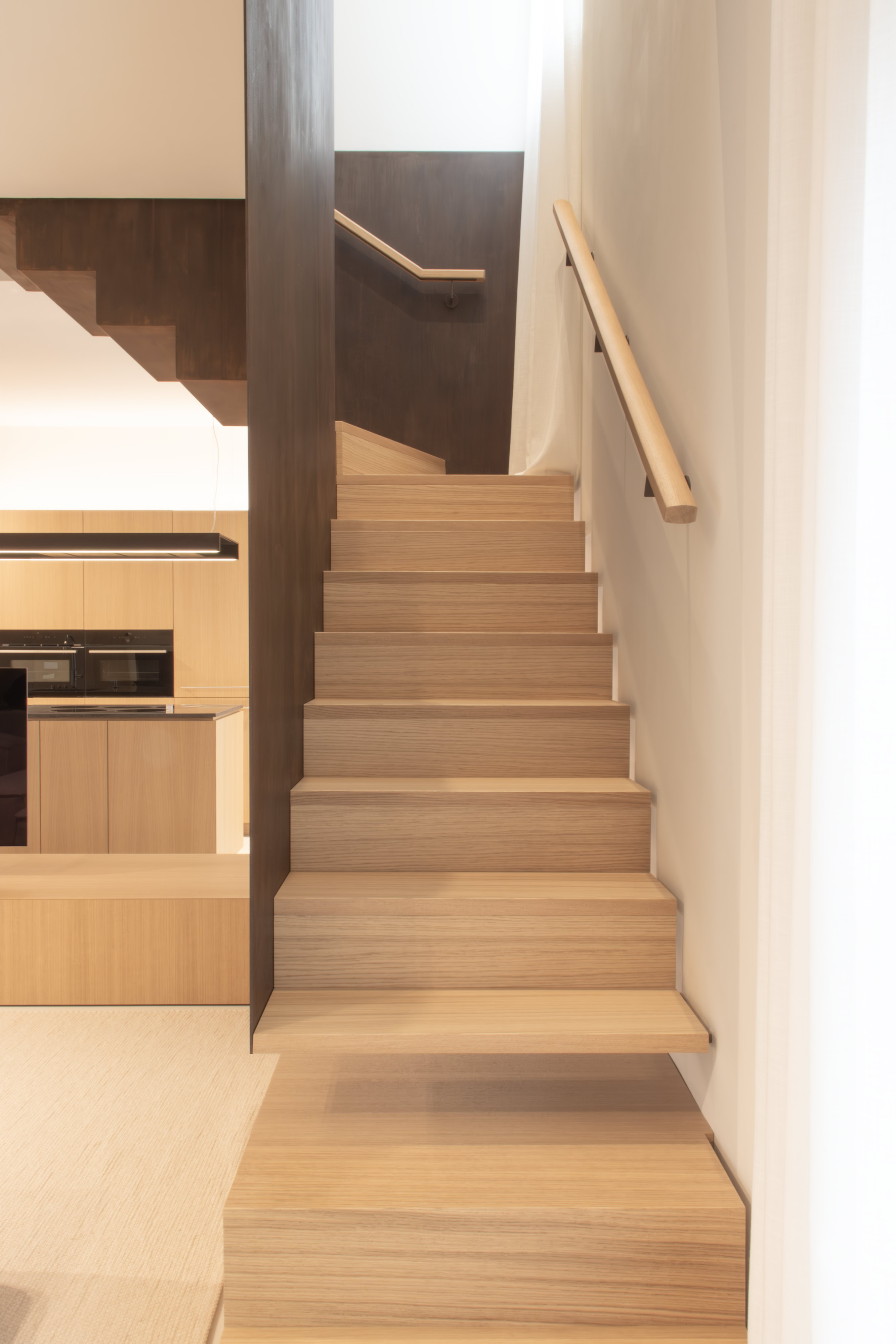 Fulcro di funzionalità e di fascino, la scala sospesa in ferro acidato e cerato introduce un deciso contrasto tonale e collega la zona giorno con il piano superiore.