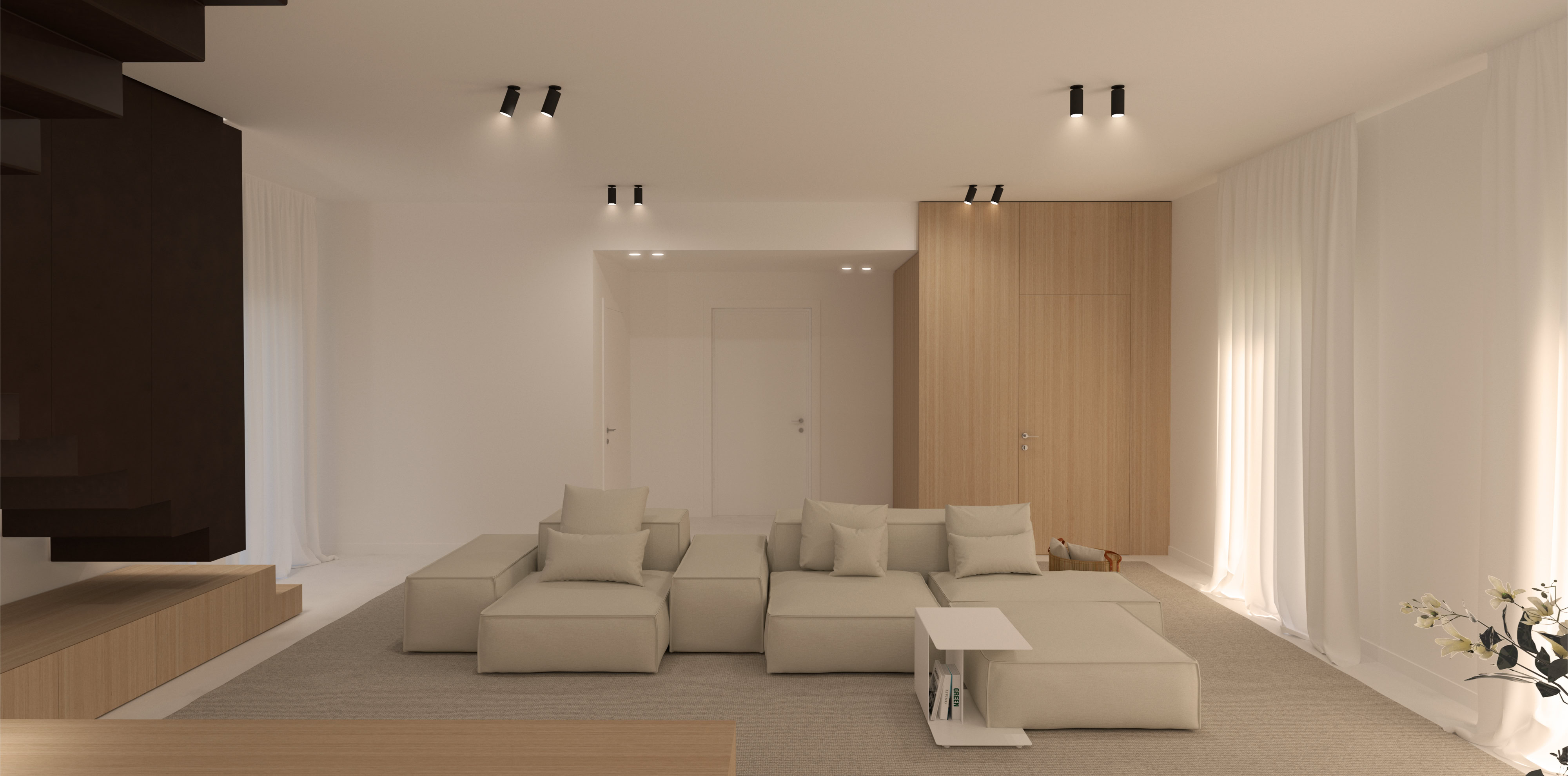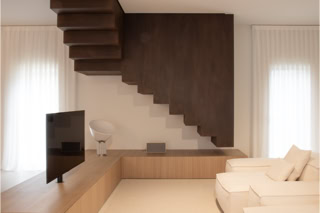 Al piano terra, la zona giorno open space si caratterizza per un allestimento su misura in legno di rovere, un pavimento in resina color sabbia e texture delicate.