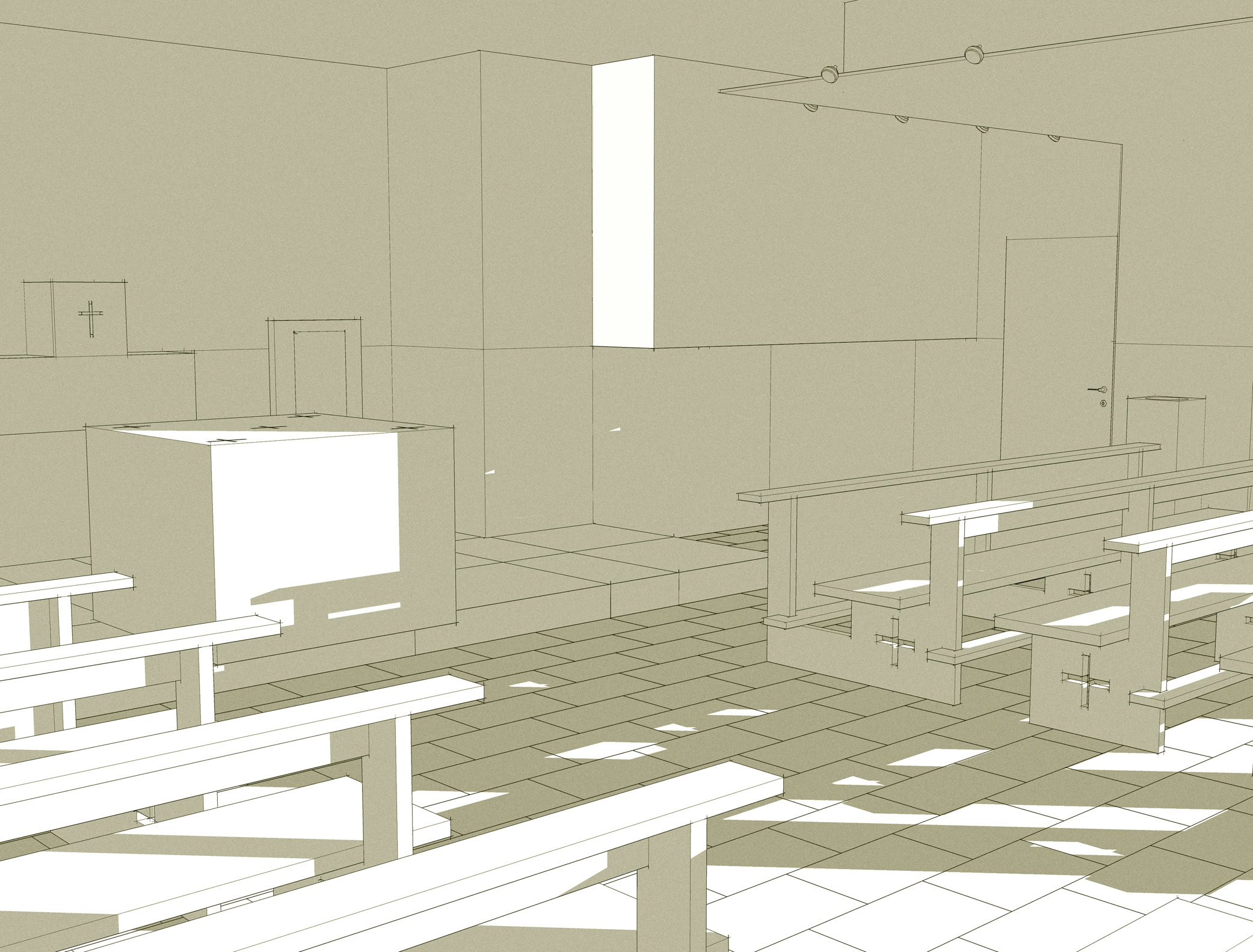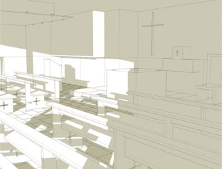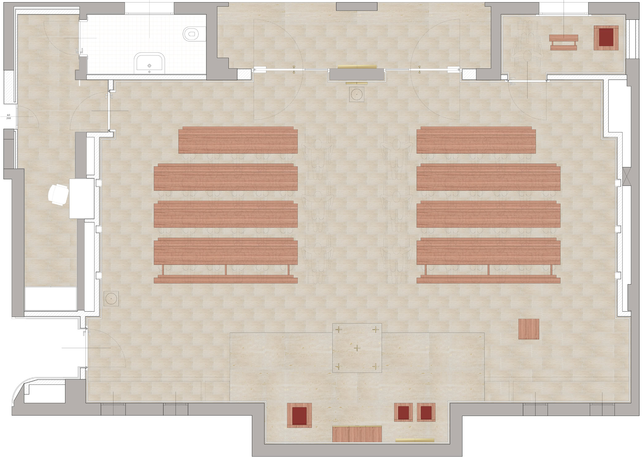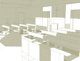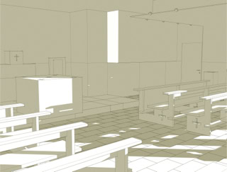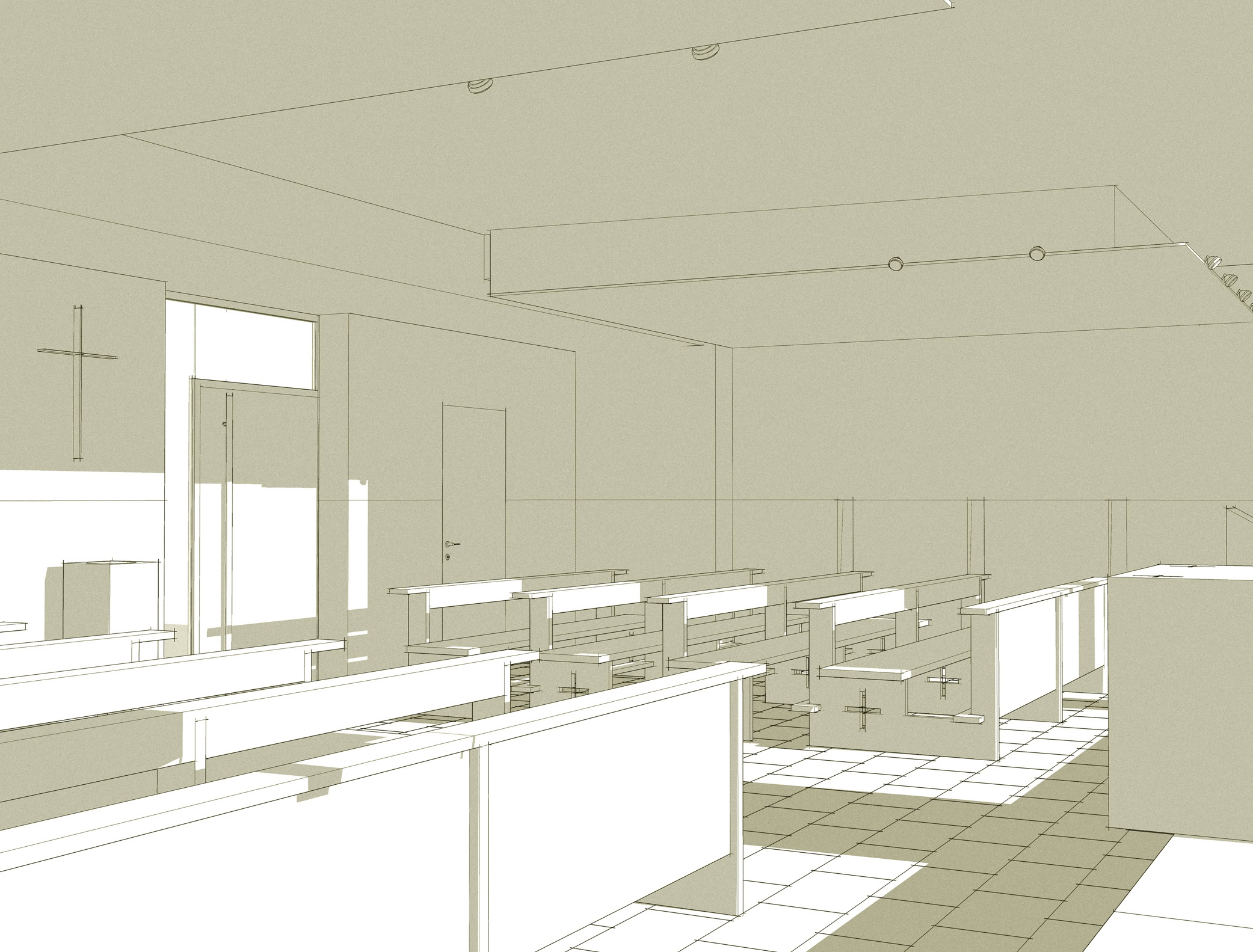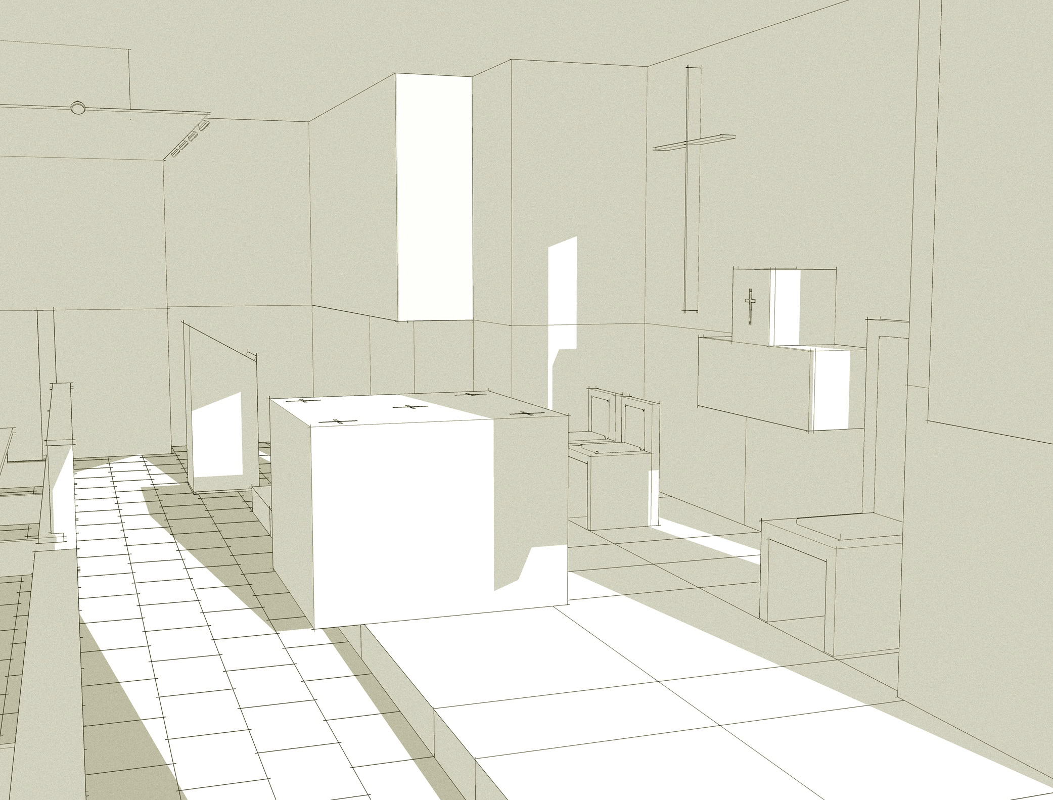 Il progetto si adegua alle caratteristiche degli ambienti al piano seminterrato dedicati allo spazio sacro della chiesa, individuando nelle indicazioni del Concilio Vaticano II e nei recenti studi sull’evoluzione dello spazio liturgico, i principi per la sua definizione.