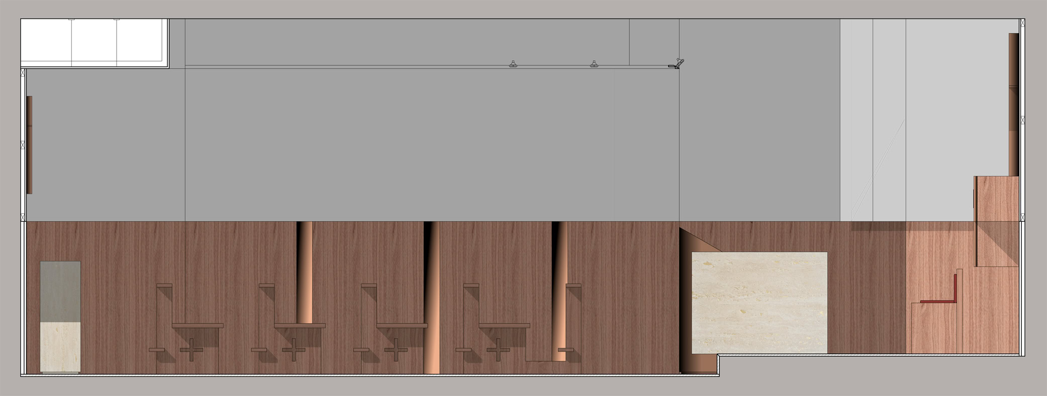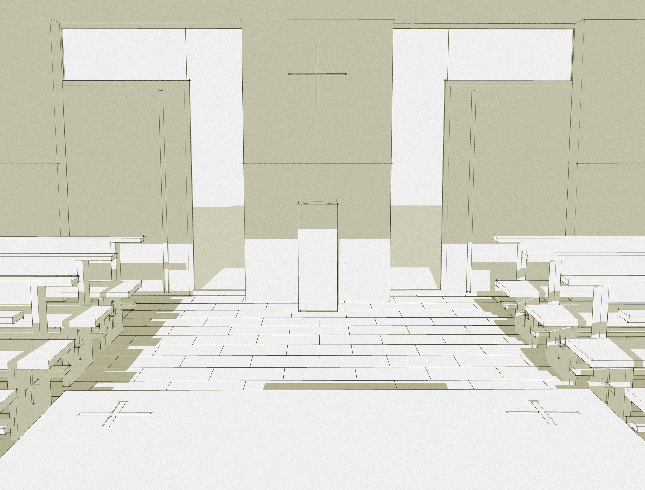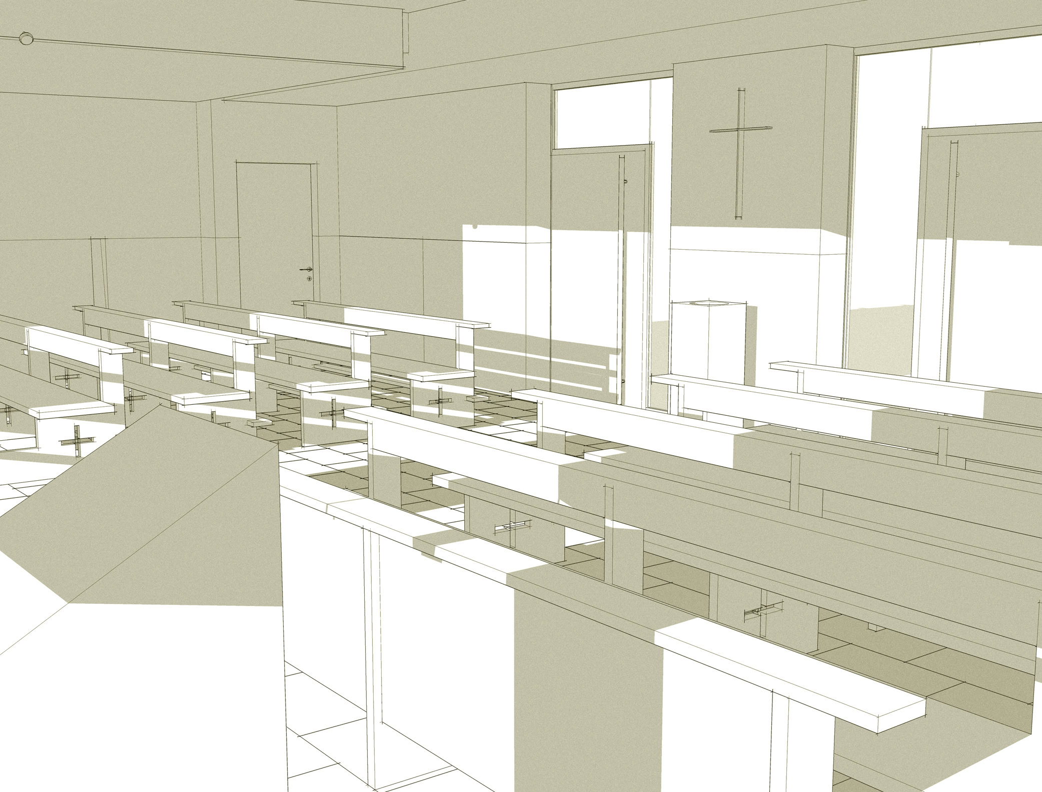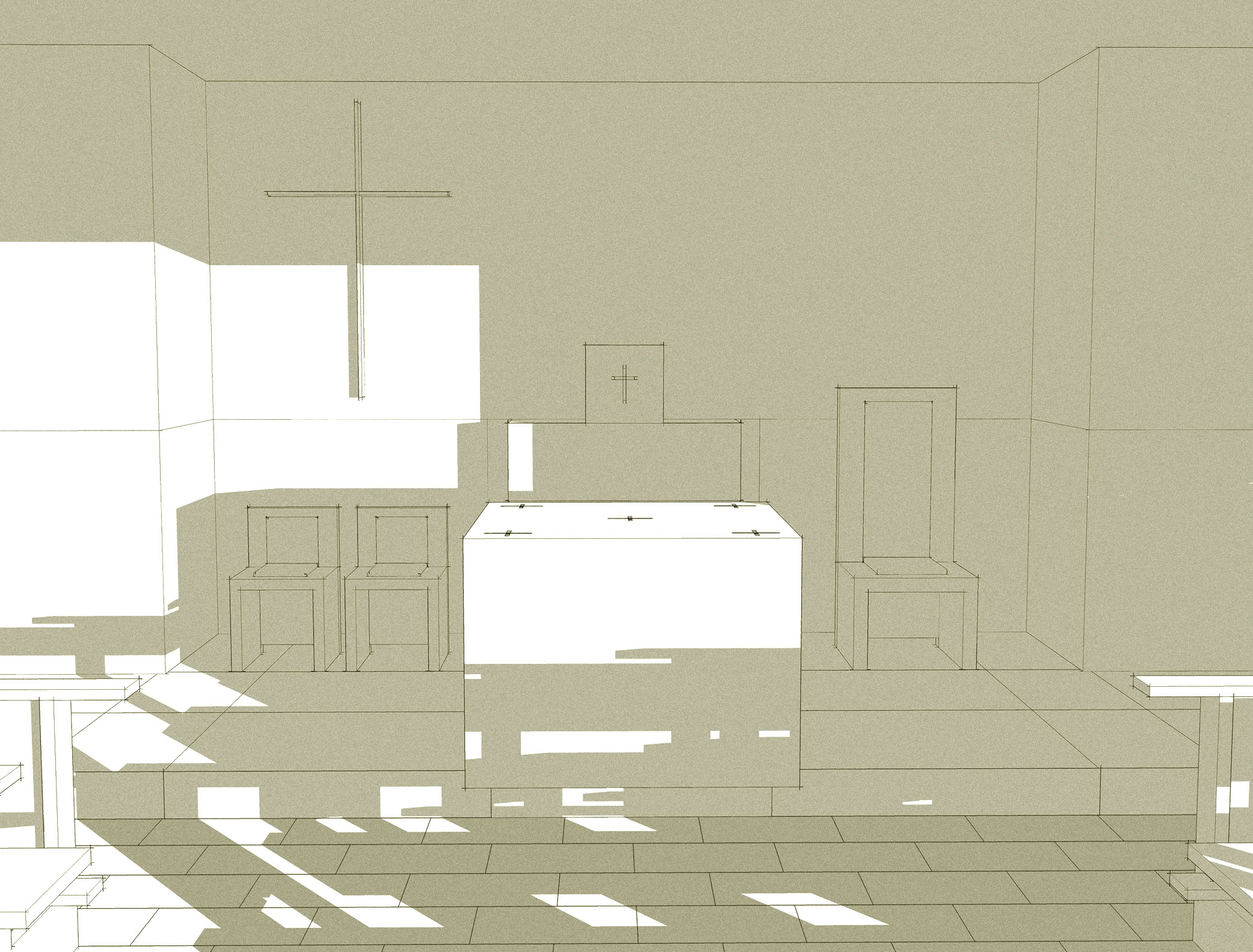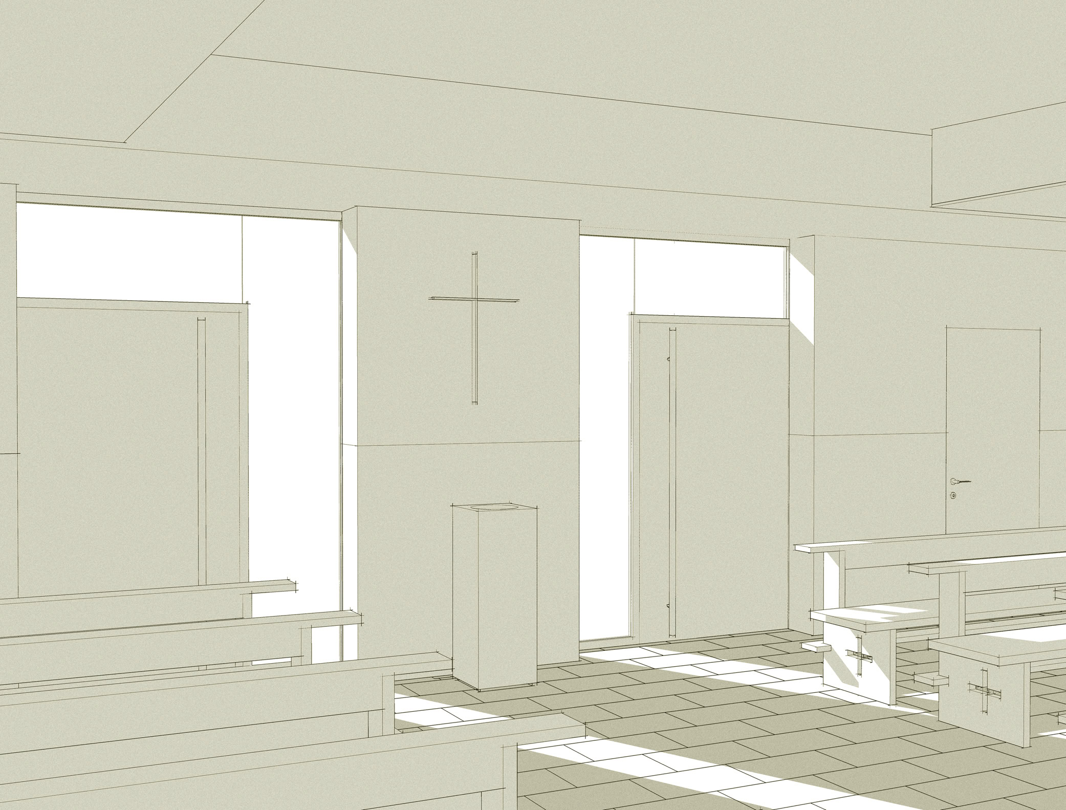 Il progetto si adegua alle caratteristiche degli ambienti al piano seminterrato dedicati allo spazio sacro della chiesa, individuando nelle indicazioni del Concilio Vaticano II e nei recenti studi sull’evoluzione dello spazio liturgico, i principi per la sua definizione.