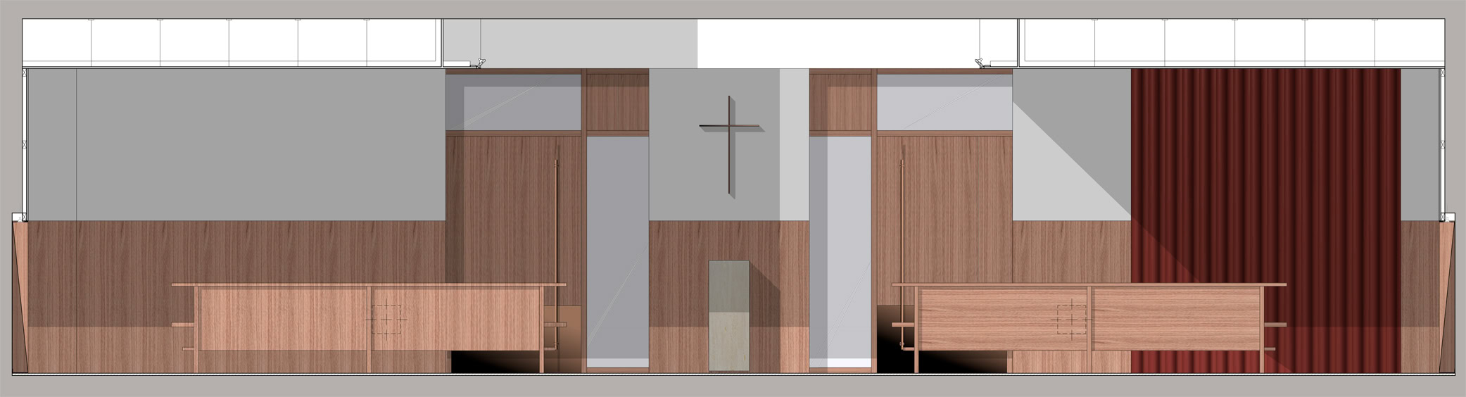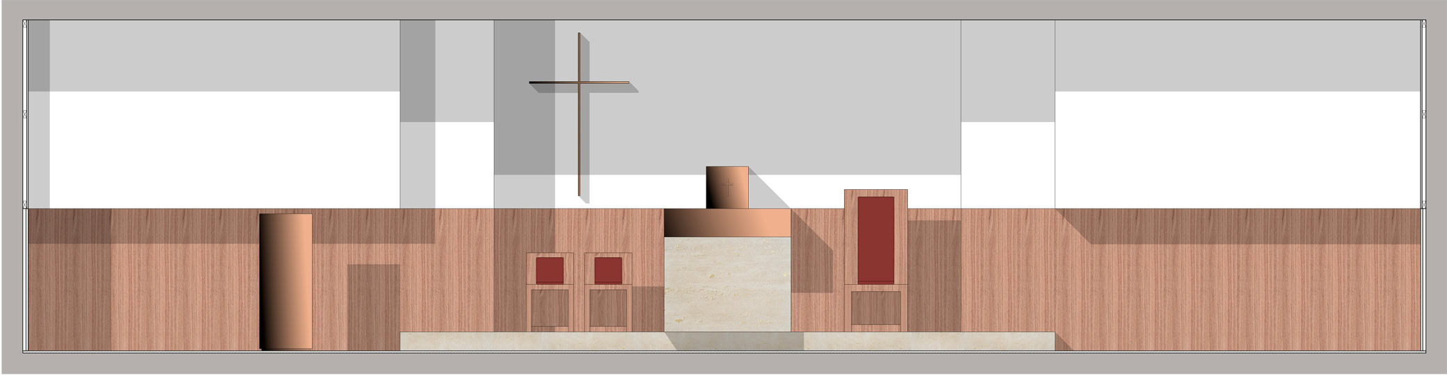 Questa proposta prevede la collocazione del tabernacolo all’interno di un moderno retablo posizionato dietro l’altare, quale fondale del presbiterio.