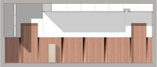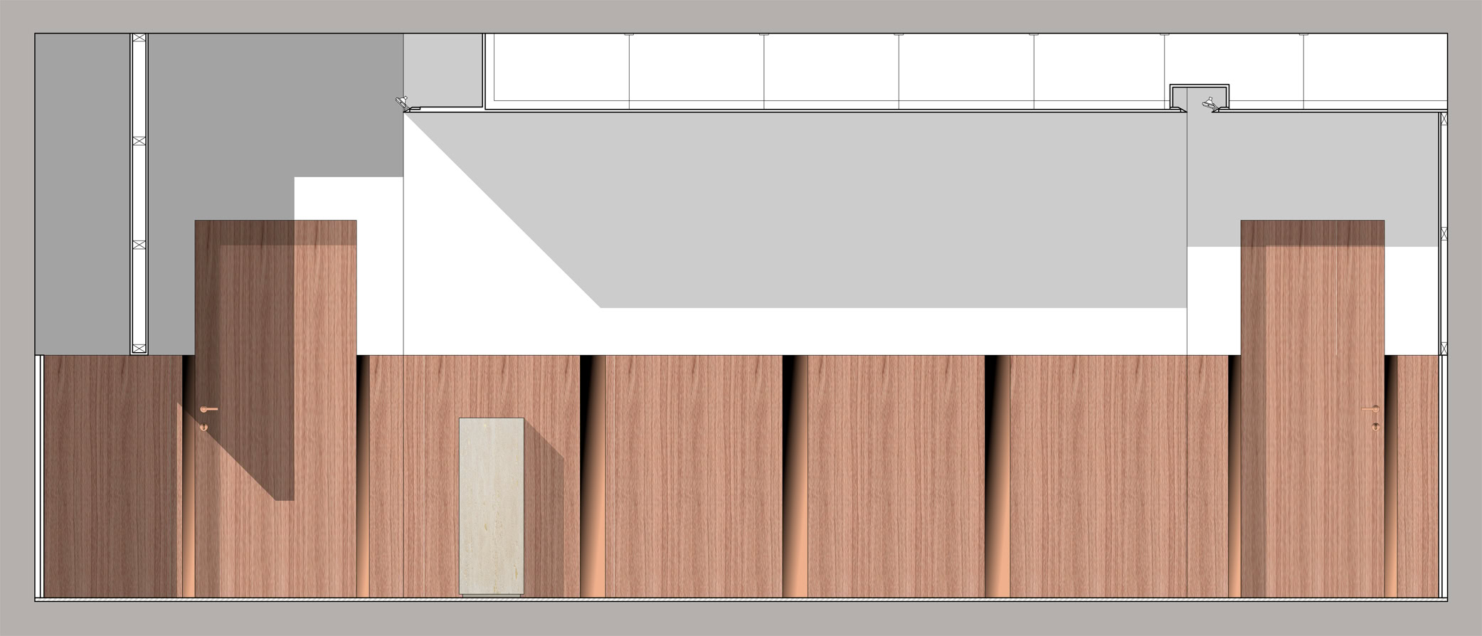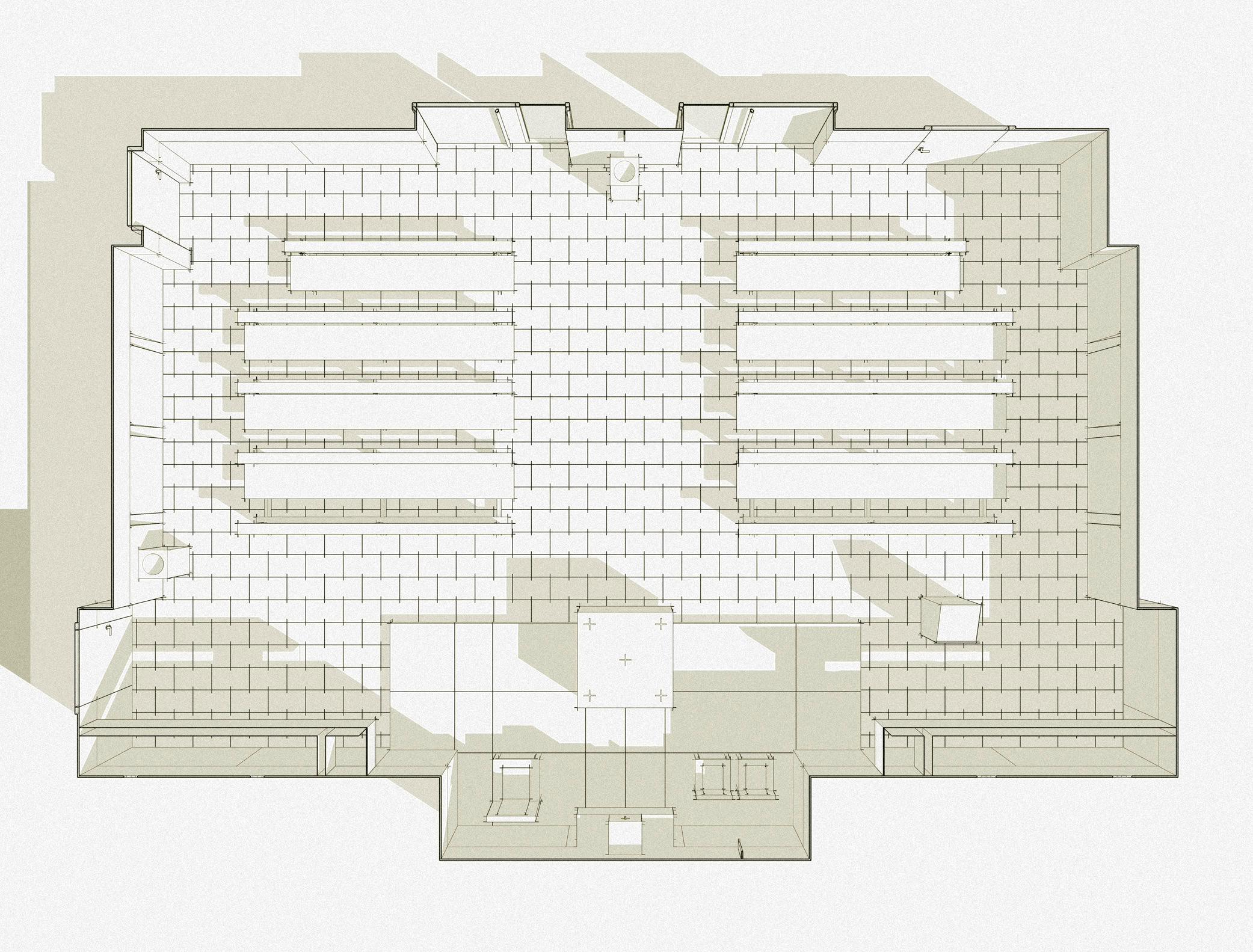 La struttura del soffitto è piana, ma questo è articolato con controsoffittature atte ad accogliere gli impianti di condizionamento dell’aria ed i corpi illuminanti.