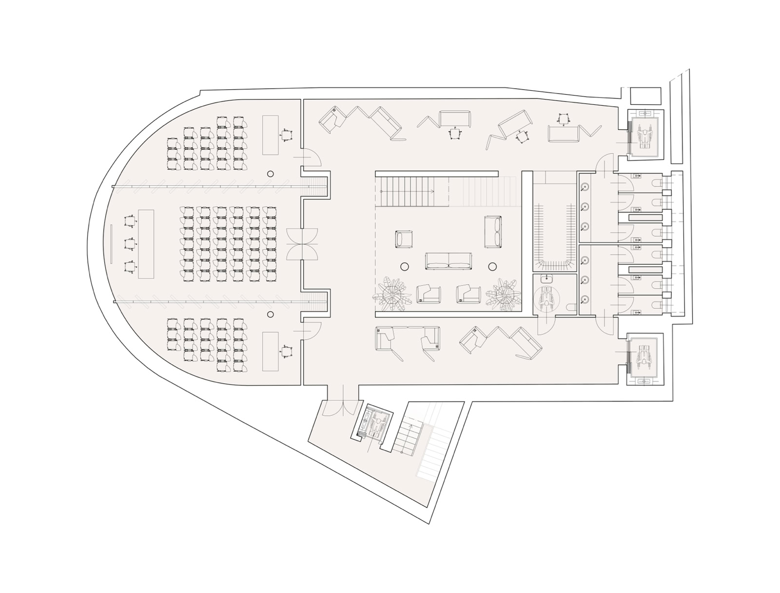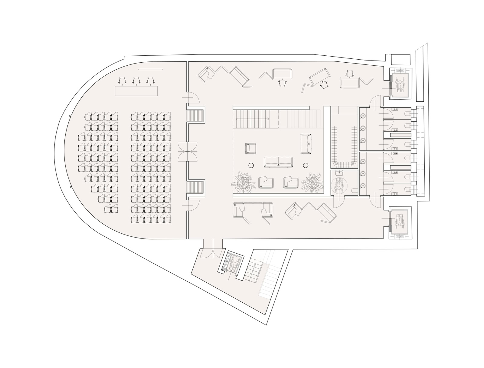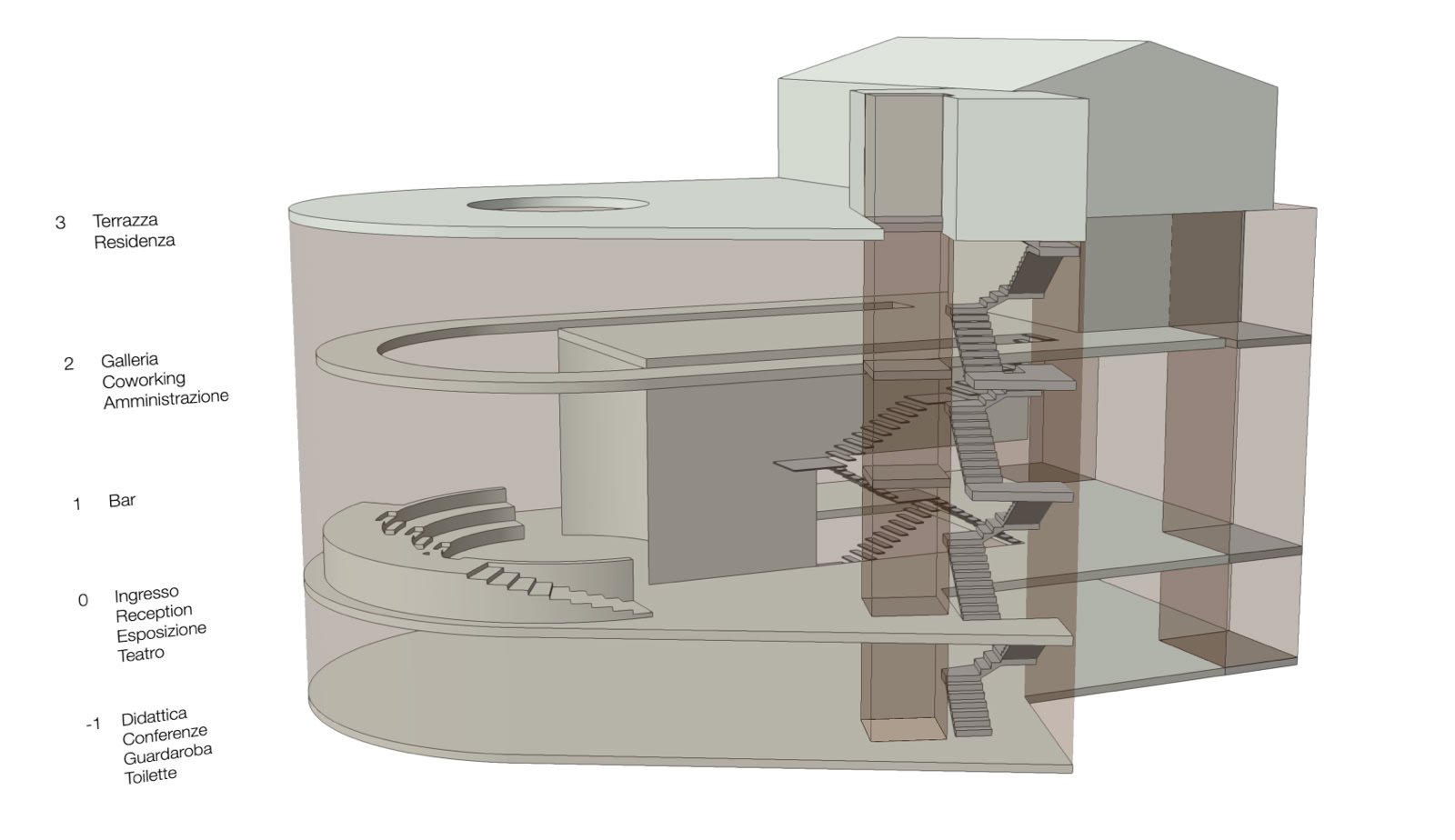 ⁃ piano terra: ingresso - reception - esposizione - teatro;