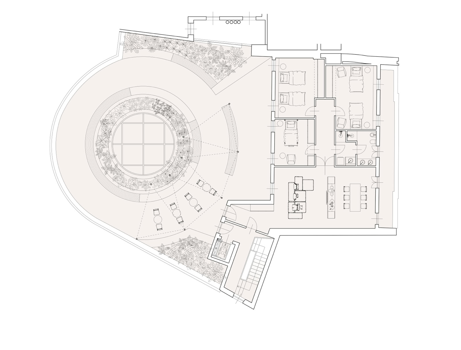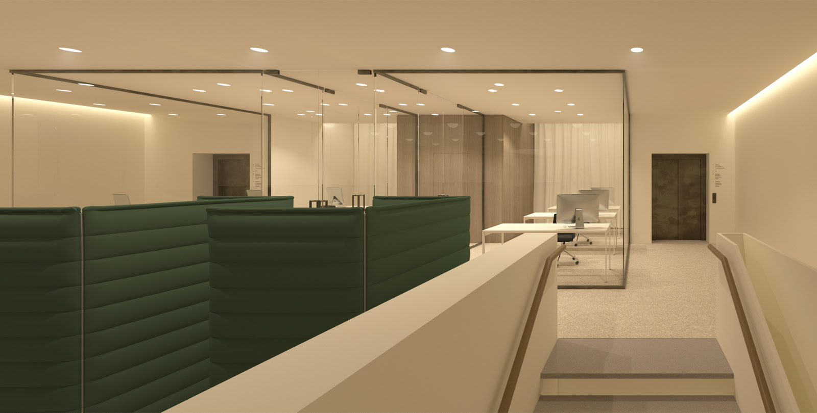 La hall d’ingresso, concepita come spazio di accoglienza con reception, rivela fin da subito la maestosità dell’altezza interna e l’articolazione plastica del nuovo volume centrale, scandito da pieni e vuoti che offrono visuali calibrate sui diversi livelli. Ai lati si collocano due ascensori che servono l’edificio fino al primo piano, mentre la residenza e il roof garden dell’ultimo livello sono accessibili dal vano scala adiacente via del Garofolino, anch’esso dotato di ascensore.