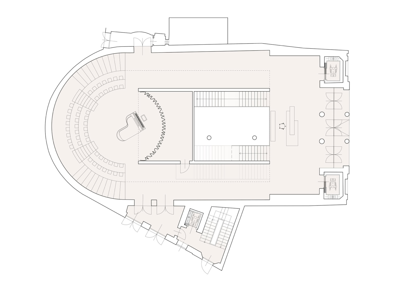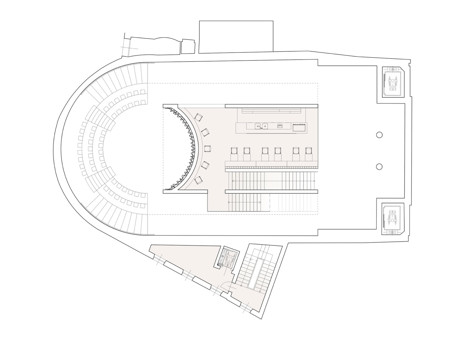 Dalla hall prende avvio un percorso espositivo che corre lungo il perimetro, seguendo a Ovest la geometria ad emiciclo dell’edificio. Qui trova posto lo spazio teatrale, concepito come luogo ibrido e flessibile per performance artistiche e rappresentazioni contemporanee: una messa in scena centrale circolare fronteggiata da un pubblico di 105 persone su gradonate lignee a emiciclo e schermata da una tenda a doppia altezza che cela il retroscena. A questo livello sono garantite le uscite di sicurezza su via del Garofolino.