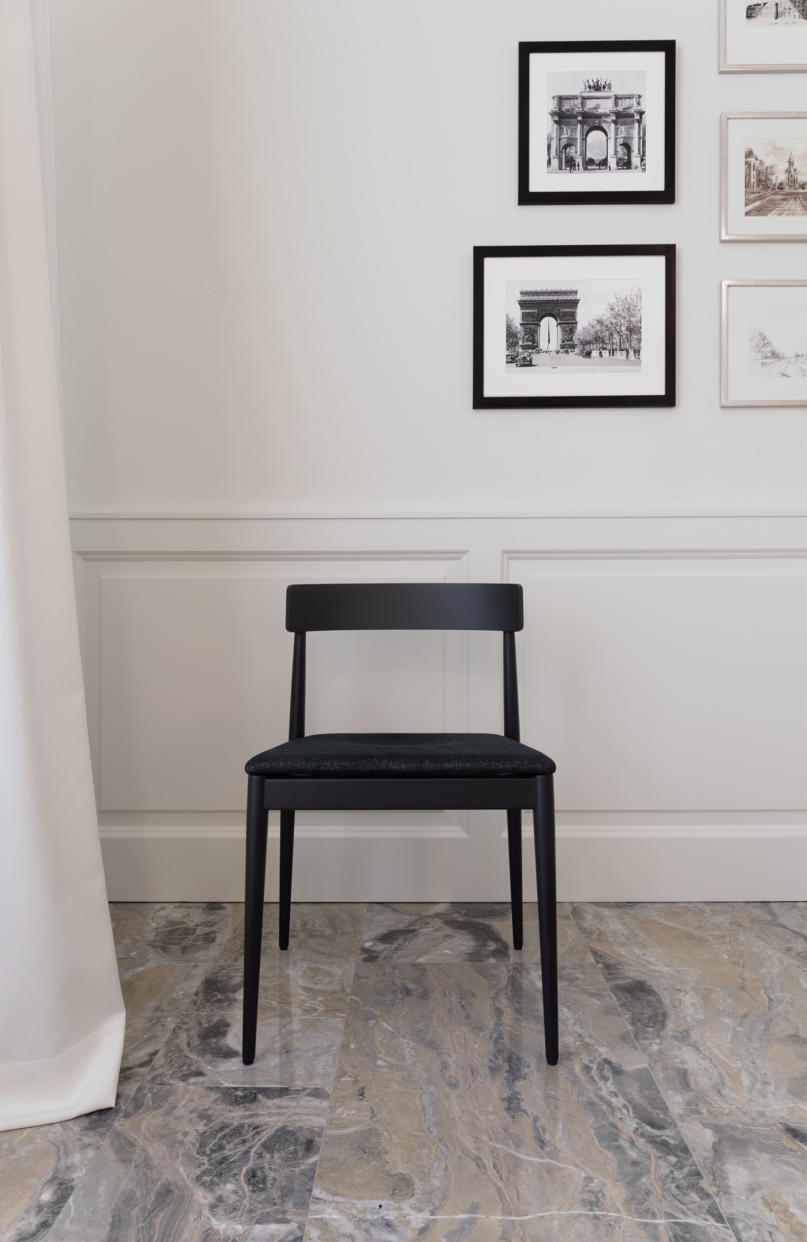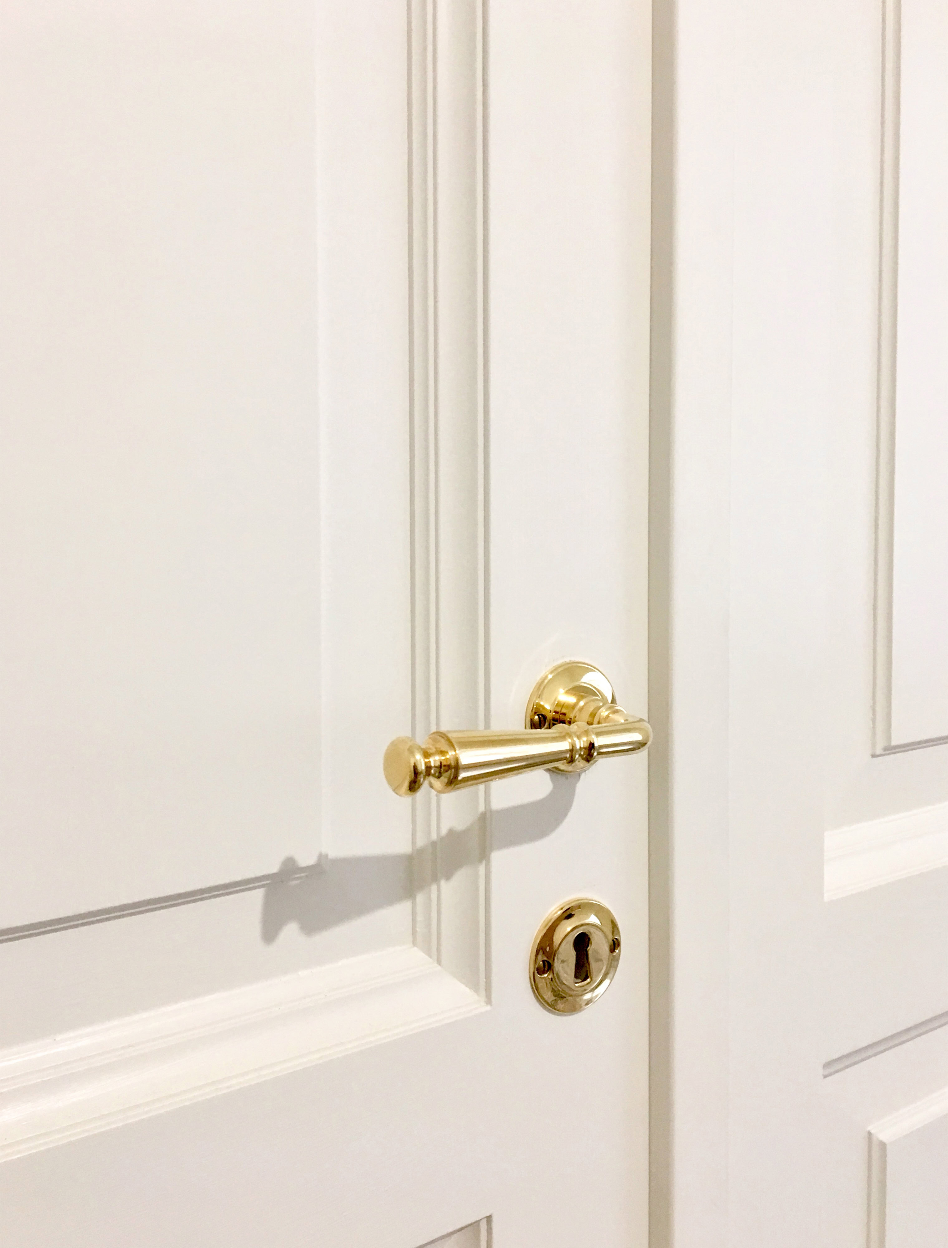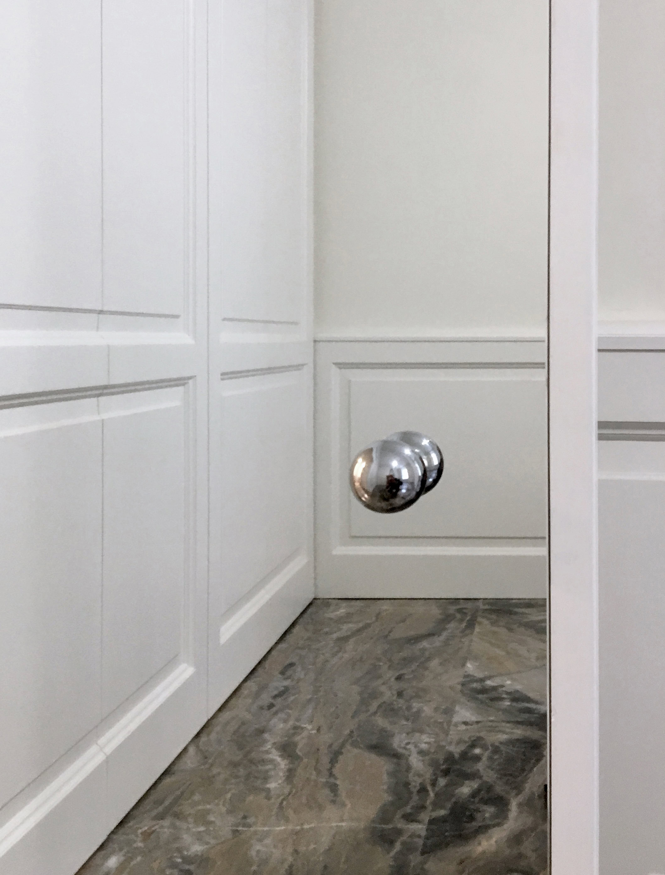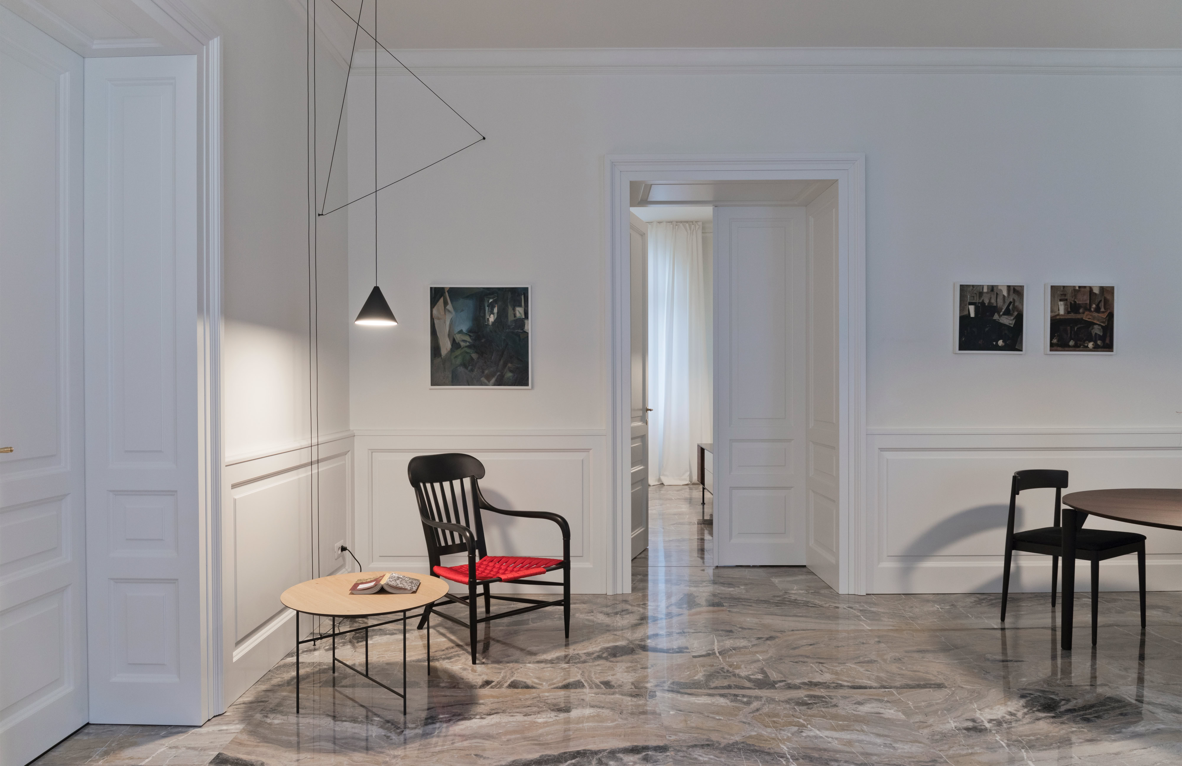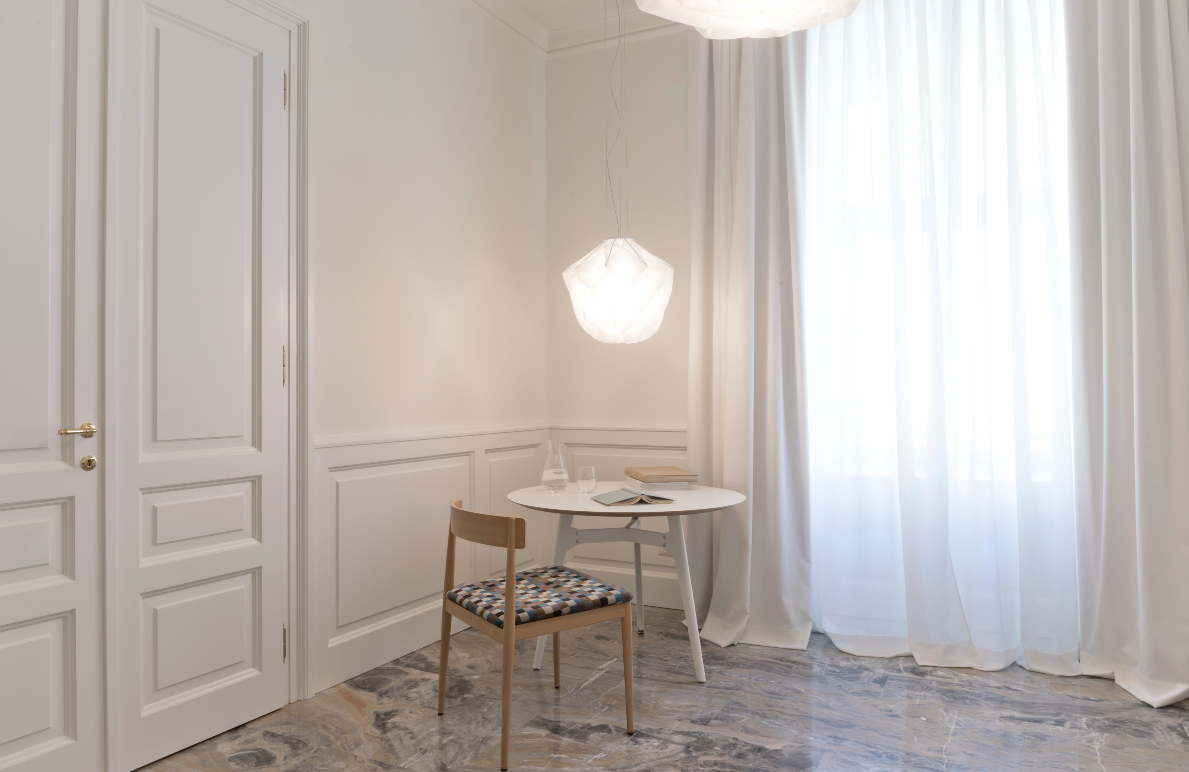 Le nuove porte interne sono state realizzate su modello delle preesistenti, con l’aggiunta di una boiserie che esalta la qualità dello spazio con la qualità delle lavorazioni dell’alta falegnameria artigianale.