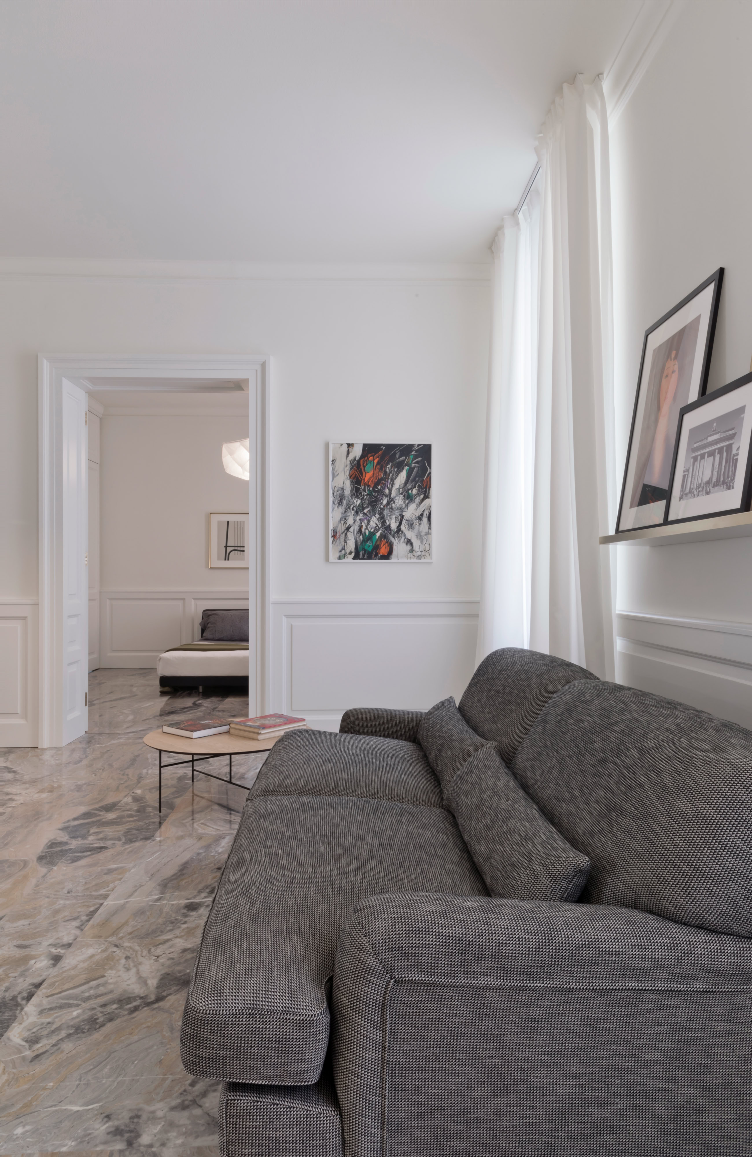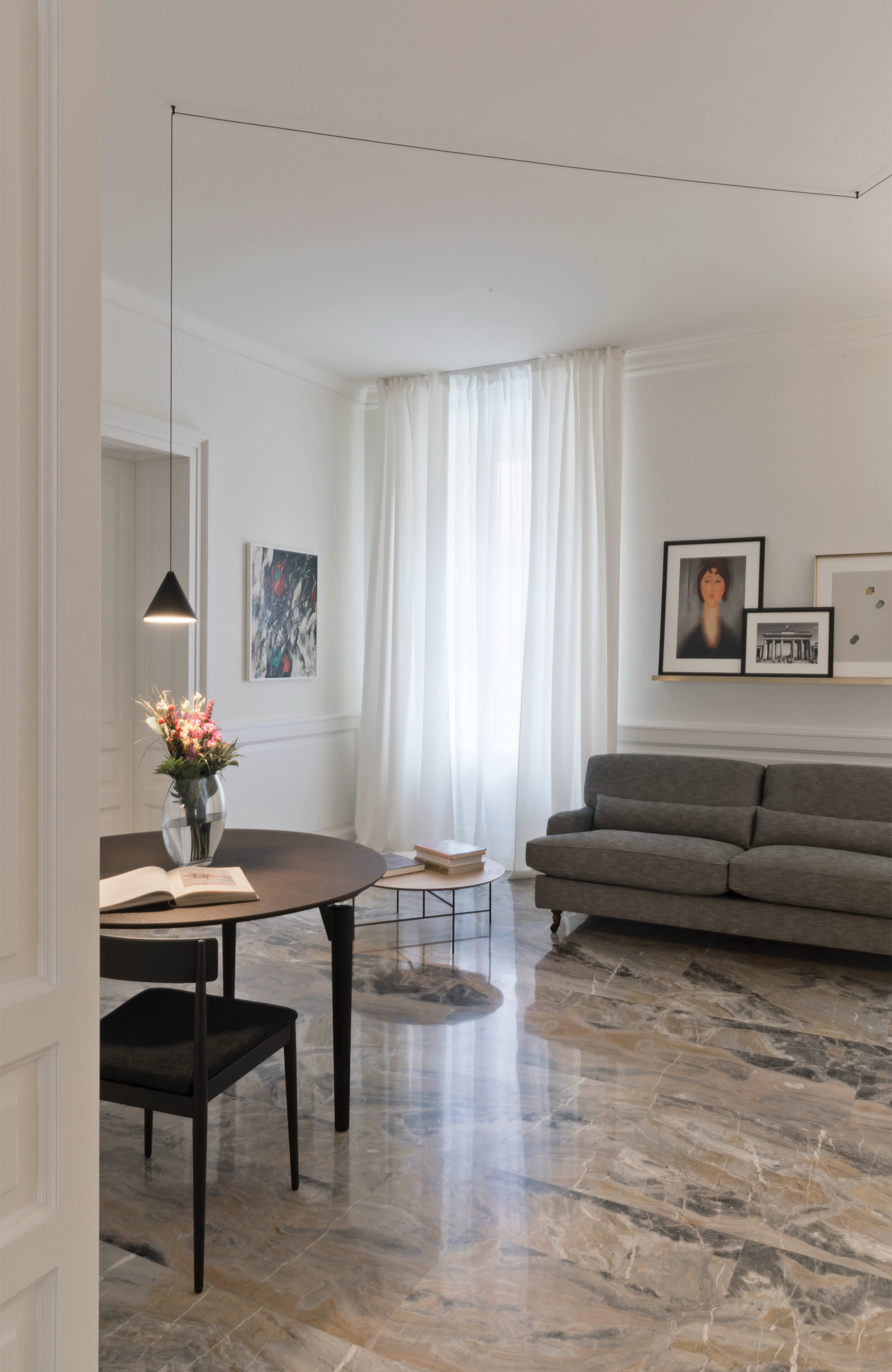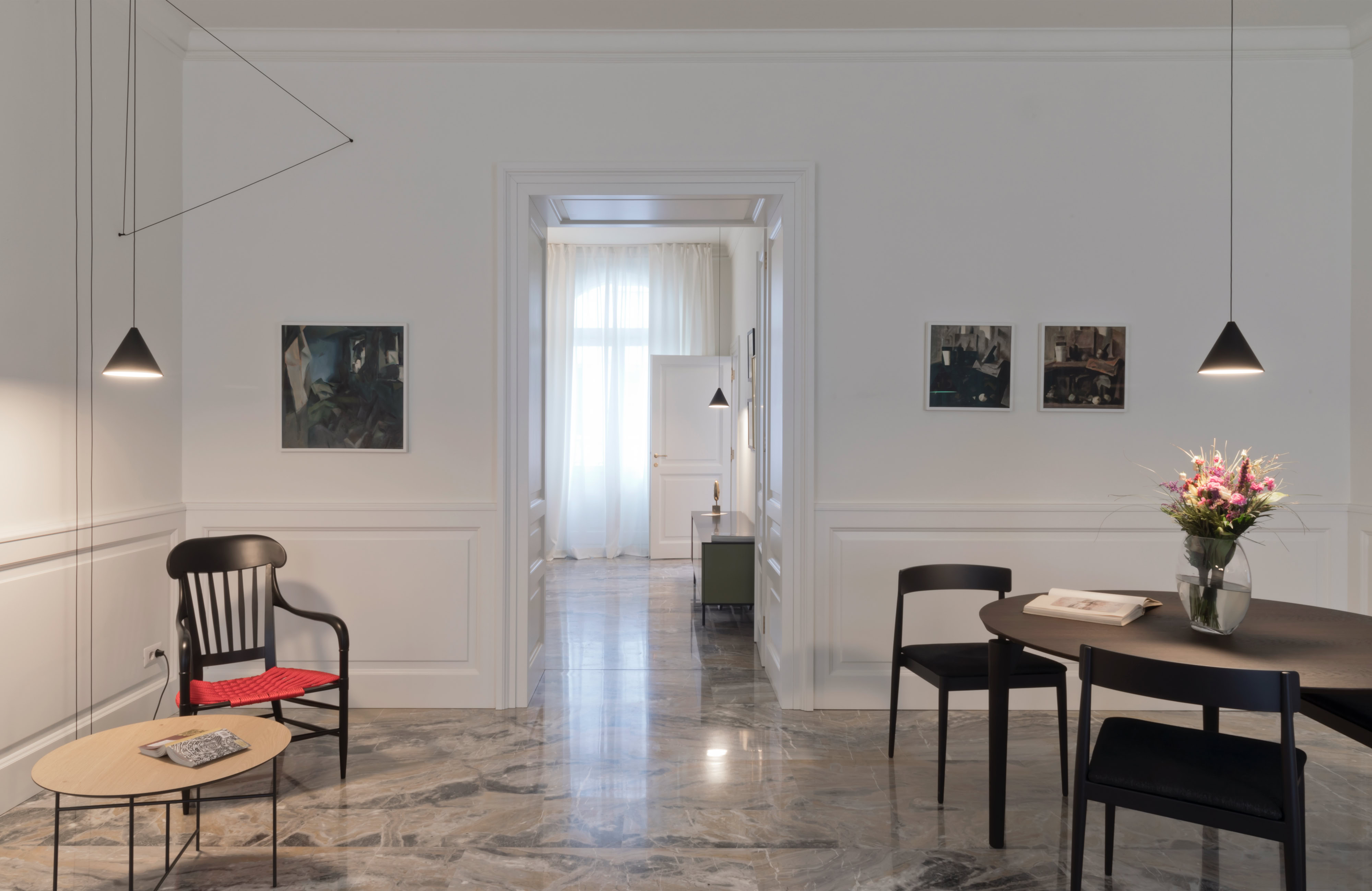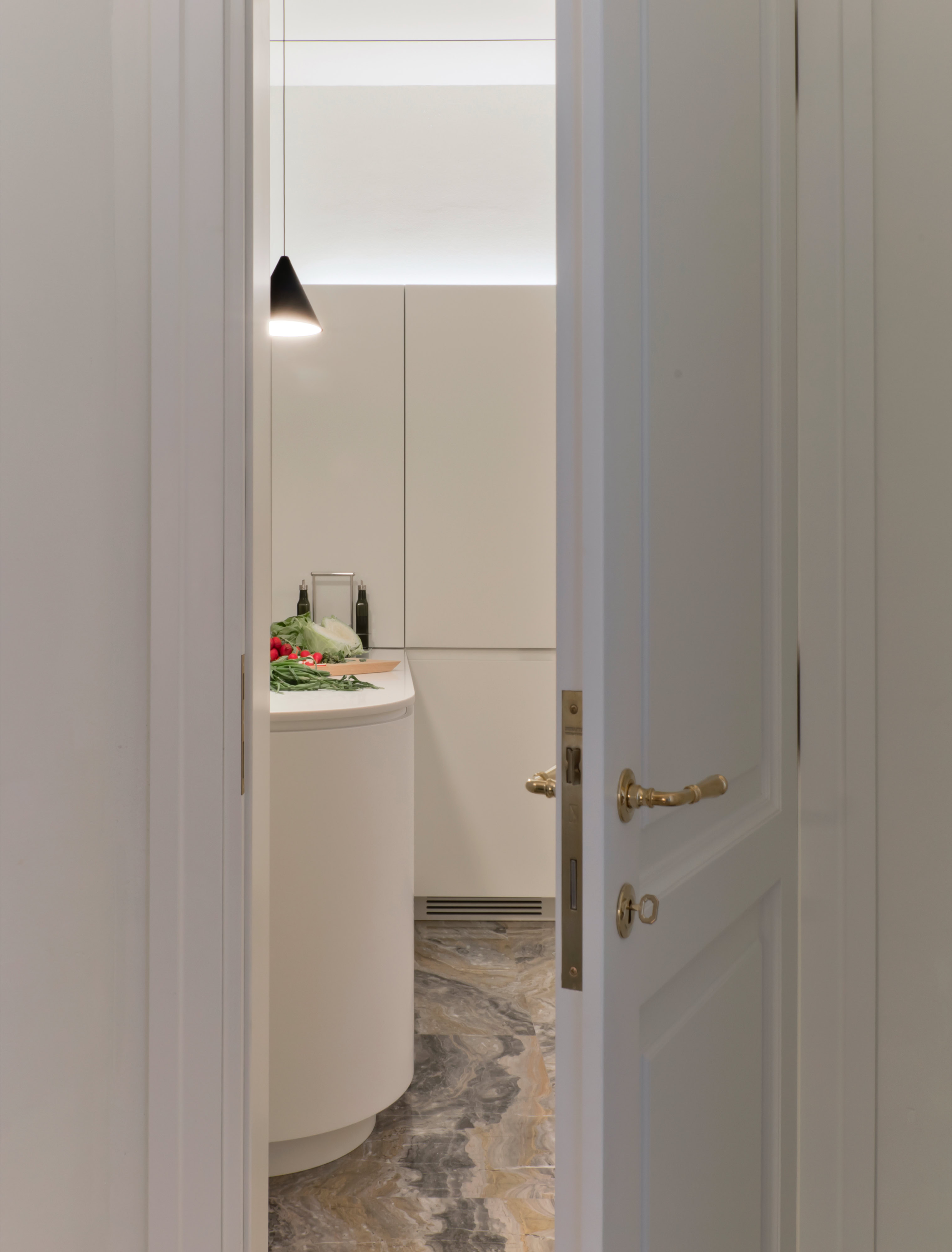 Un recupero dell’involucro edilizio, caratterizzato da grandi stanze bianche e alti soffitti con cornici, attraverso il rinnovo delle superfici ed il restauro dei serramenti originali.
