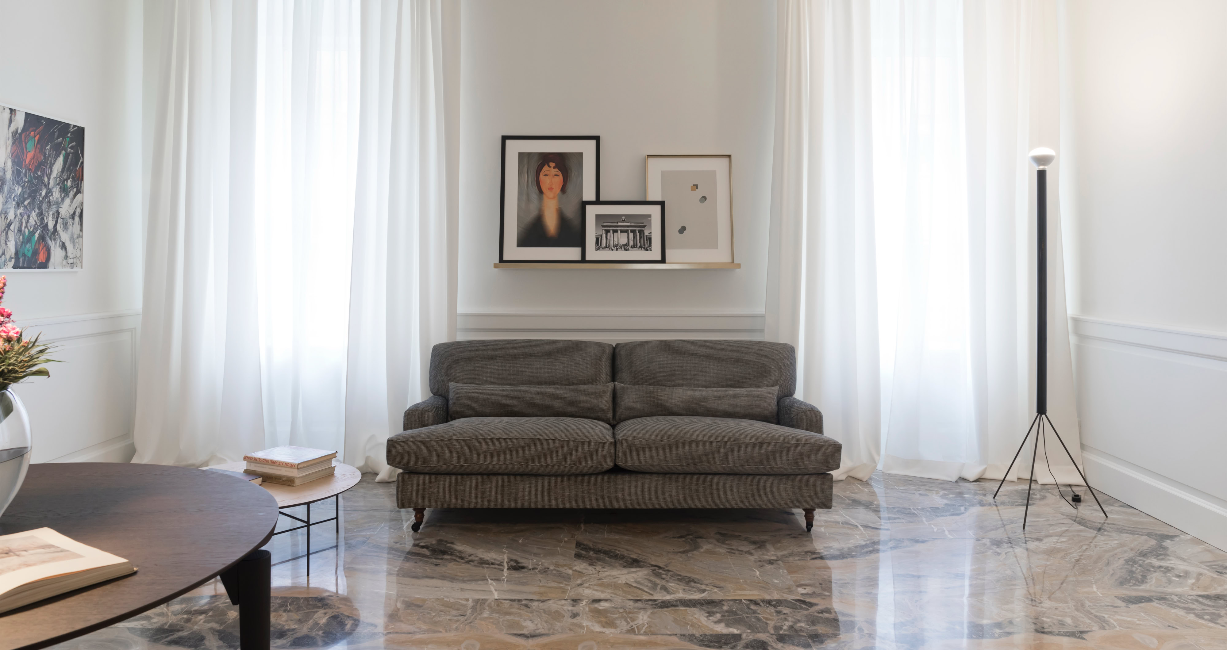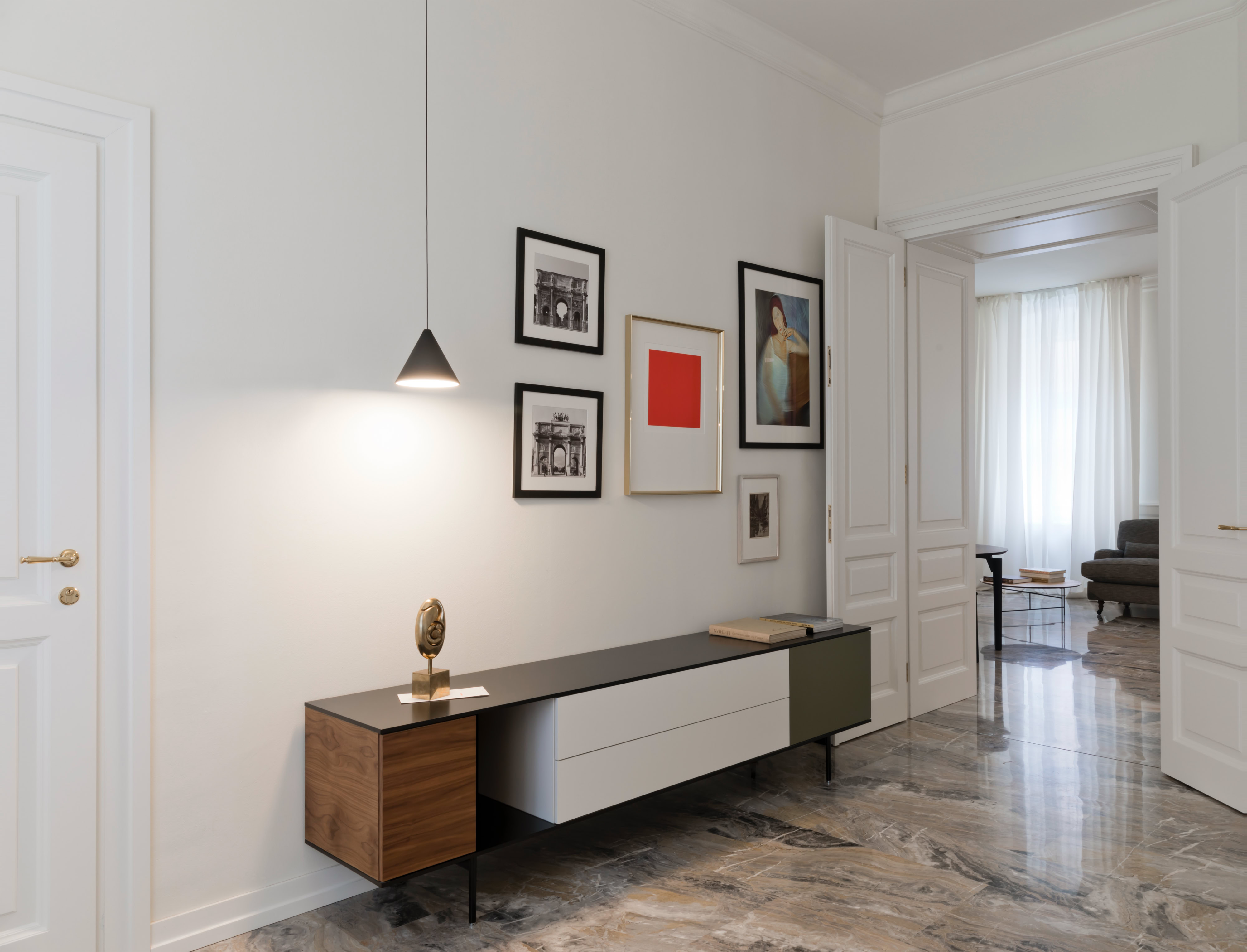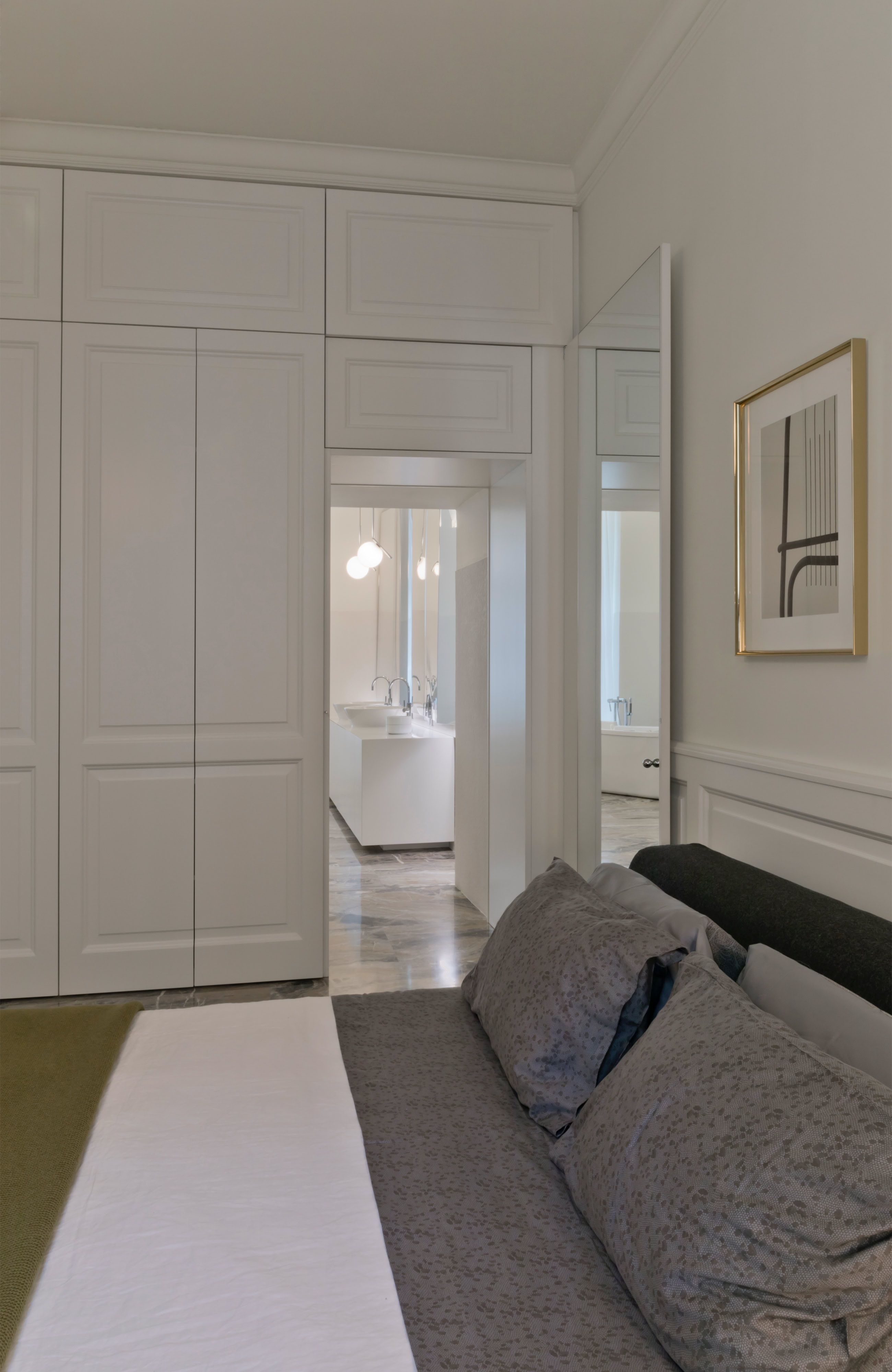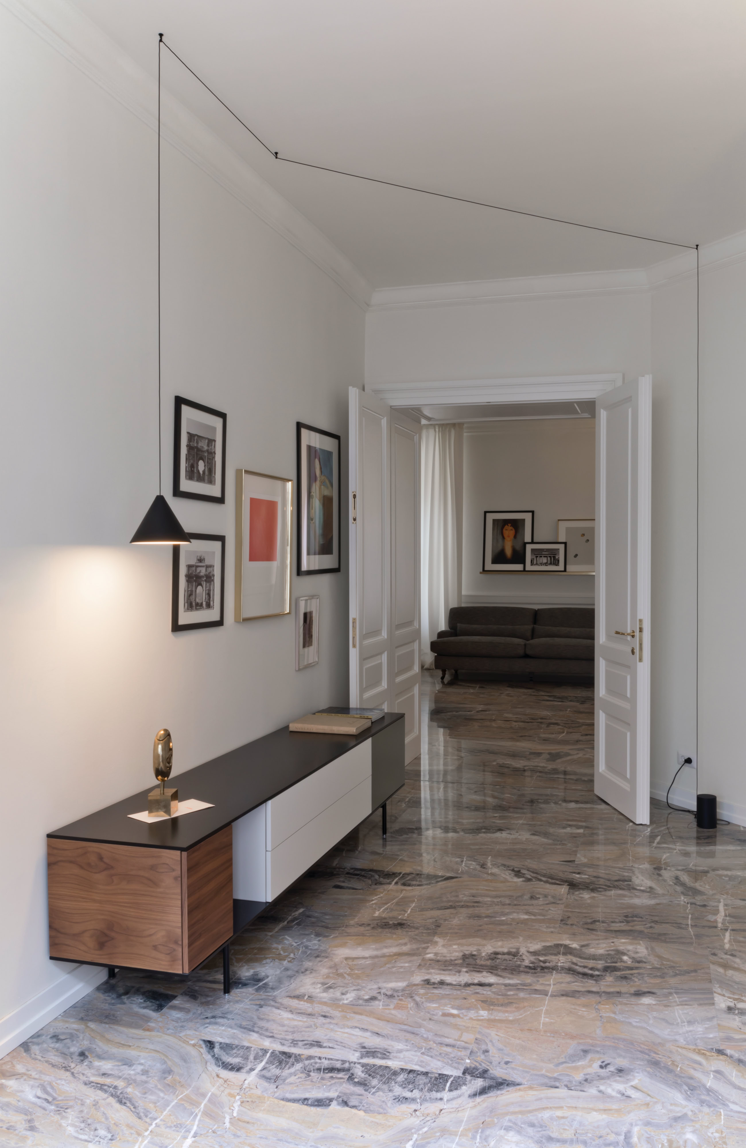 Un recupero dell’involucro edilizio, caratterizzato da grandi stanze bianche e alti soffitti con cornici, attraverso il rinnovo delle superfici ed il restauro dei serramenti originali.
