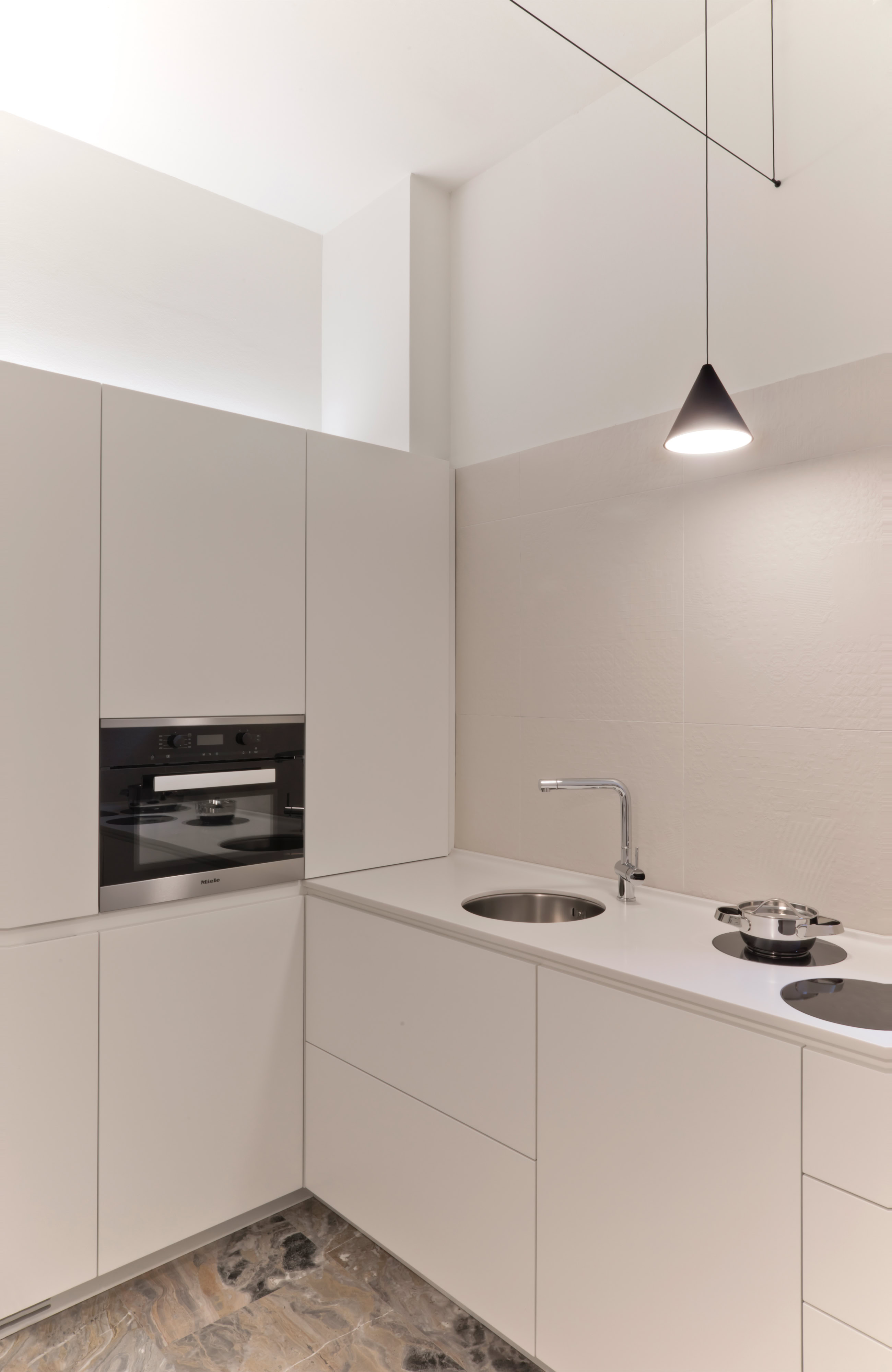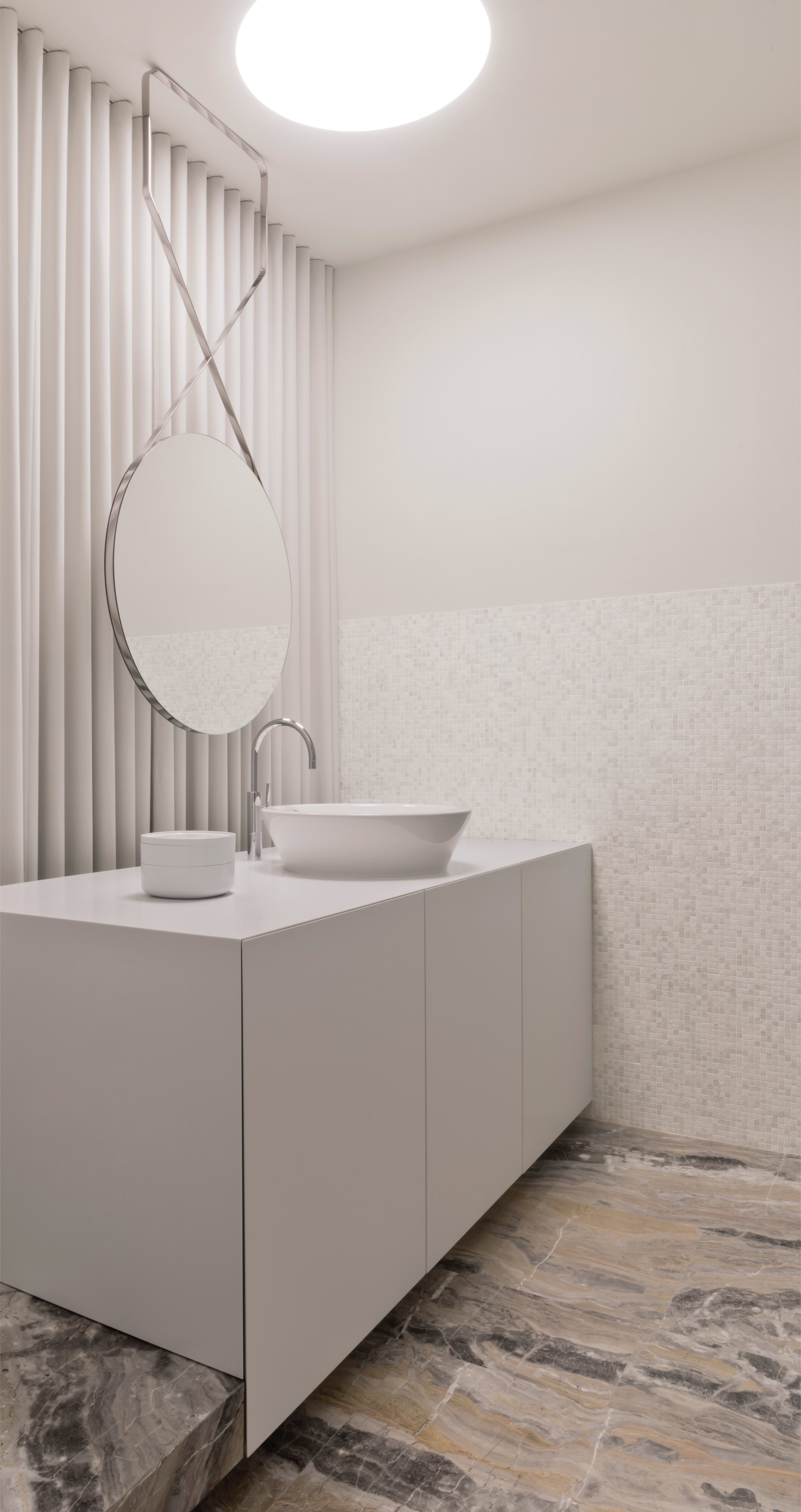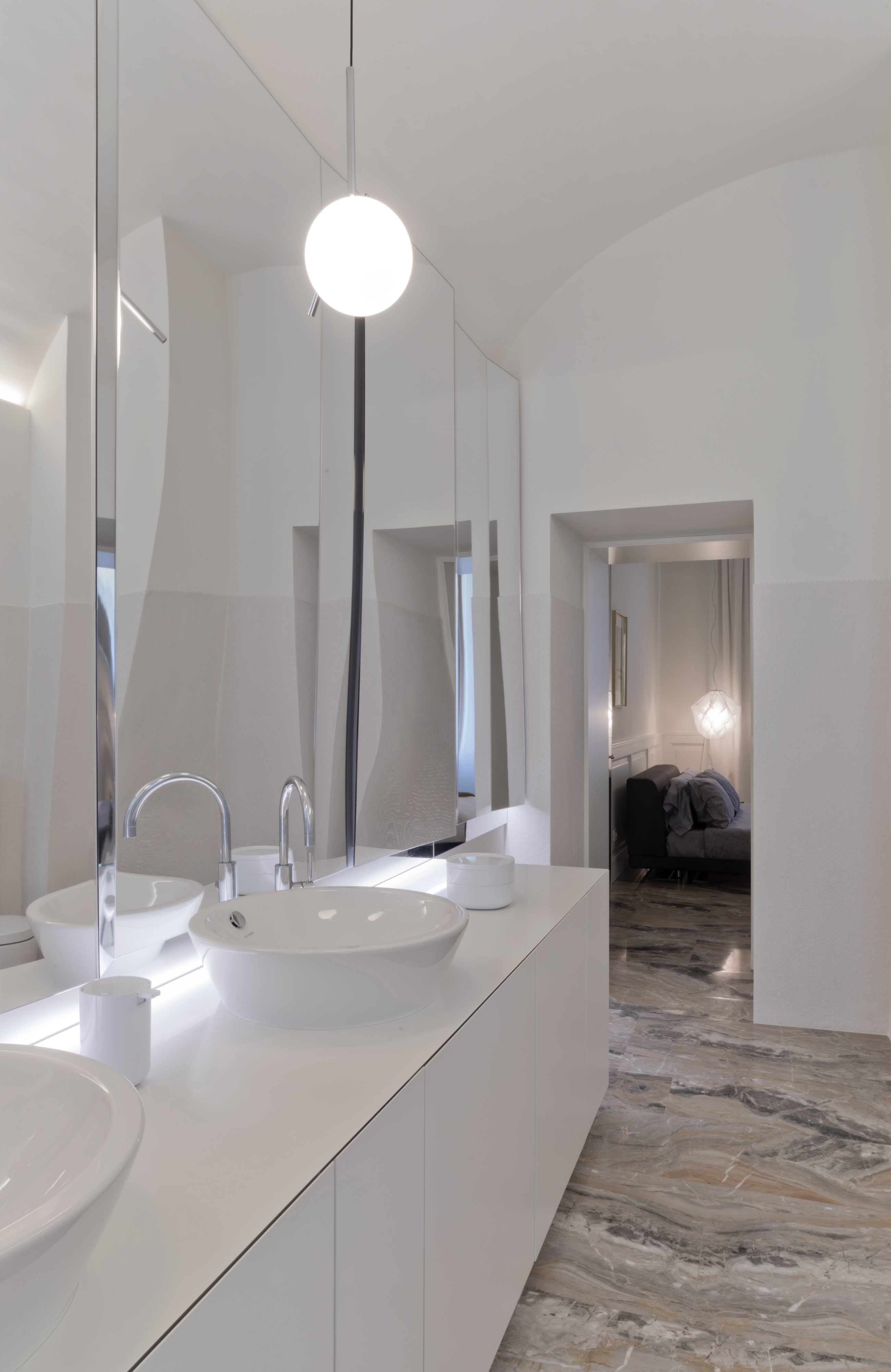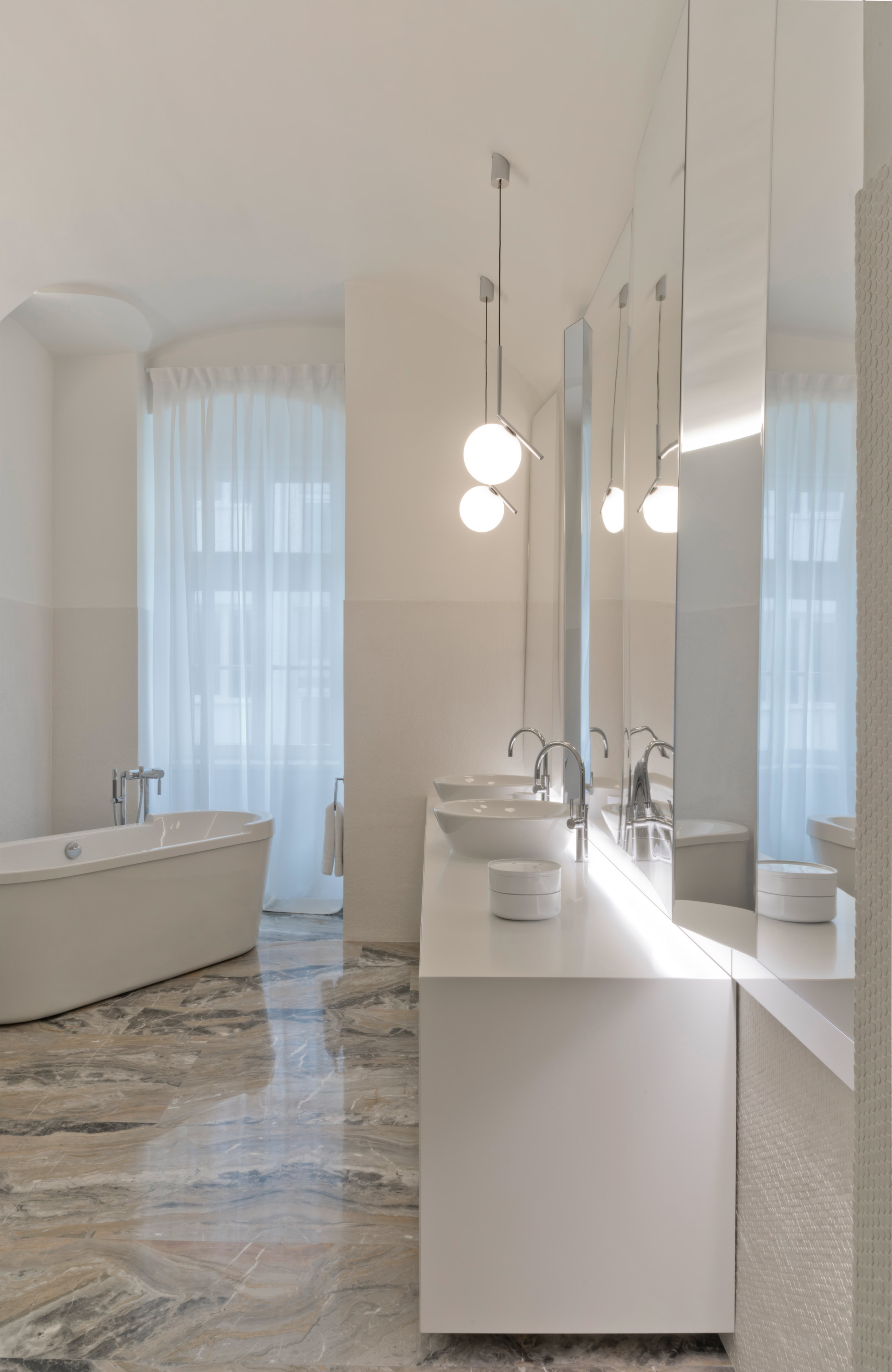 Leitmotiv il colore bianco declinato ai vari elementi e materiali di pareti e soffitti, contrapposto ad un ricco tappeto di pietra dai colori e dai disegni naturali inimitabili dell’arabescato orobico. Prestigioso marmo italiano nella varietà cromatica grigio-rosa. Una pietra cavata da più di cento anni in alta Valle Brembana, in Provincia di Bergamo.