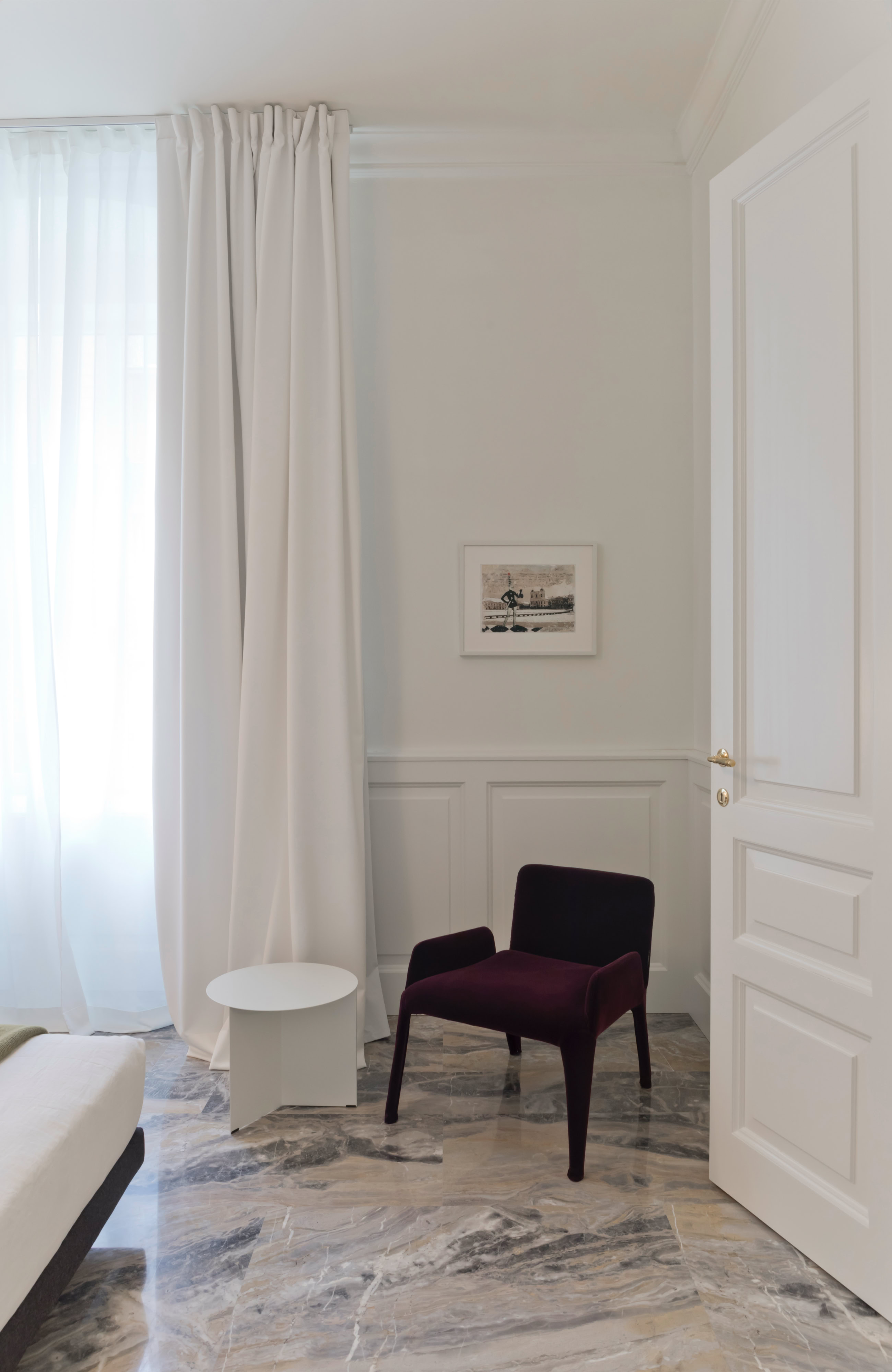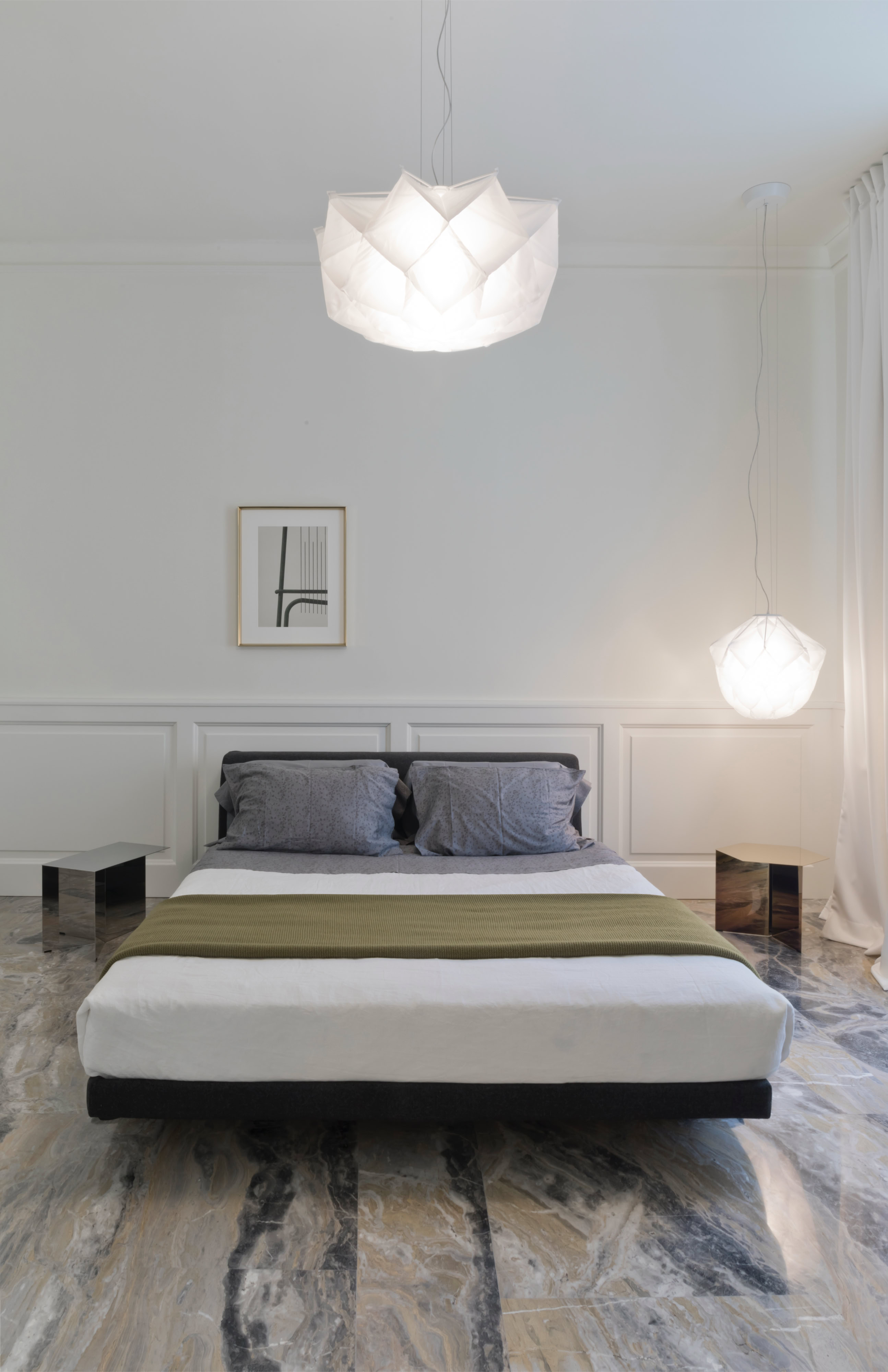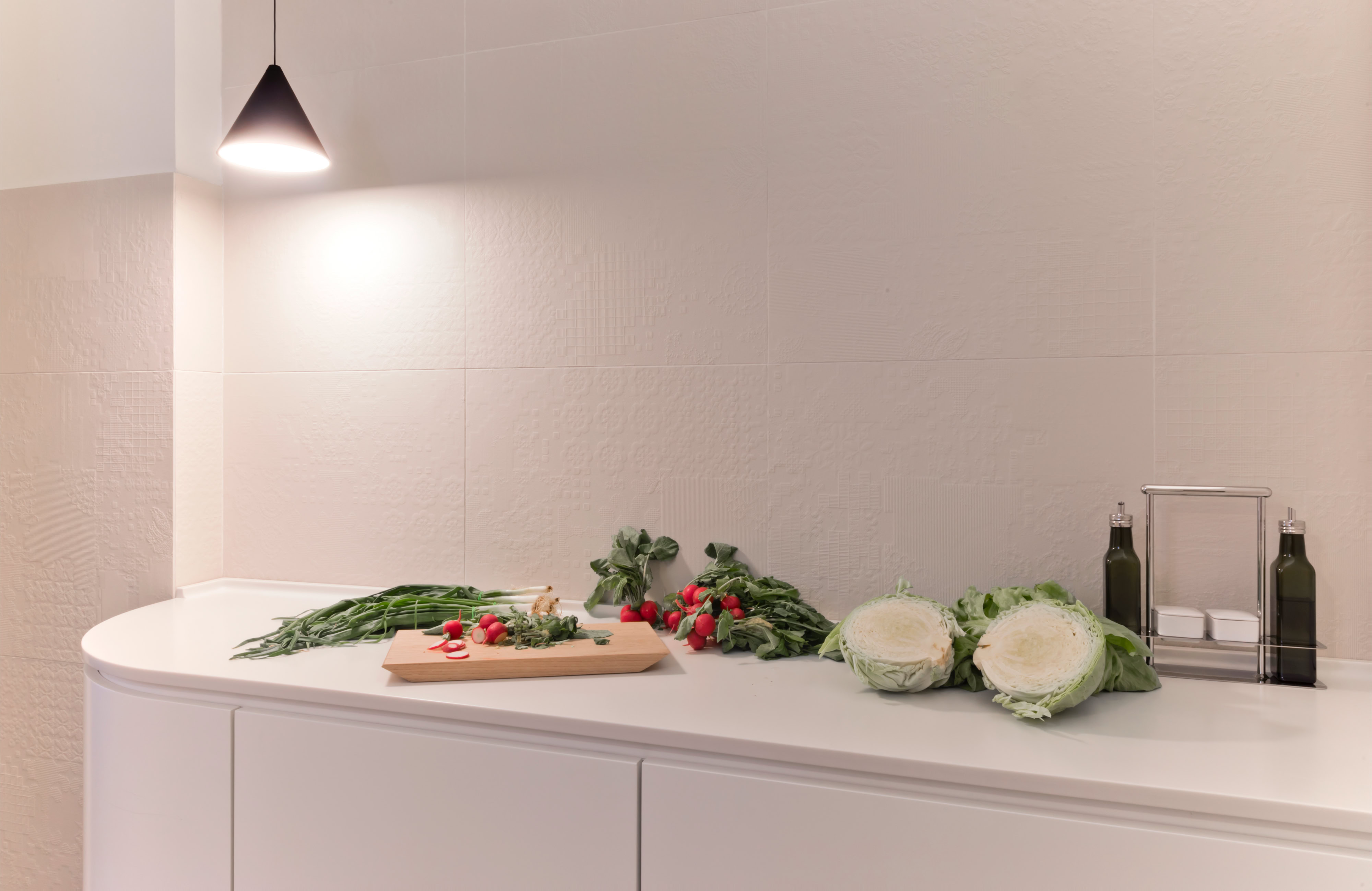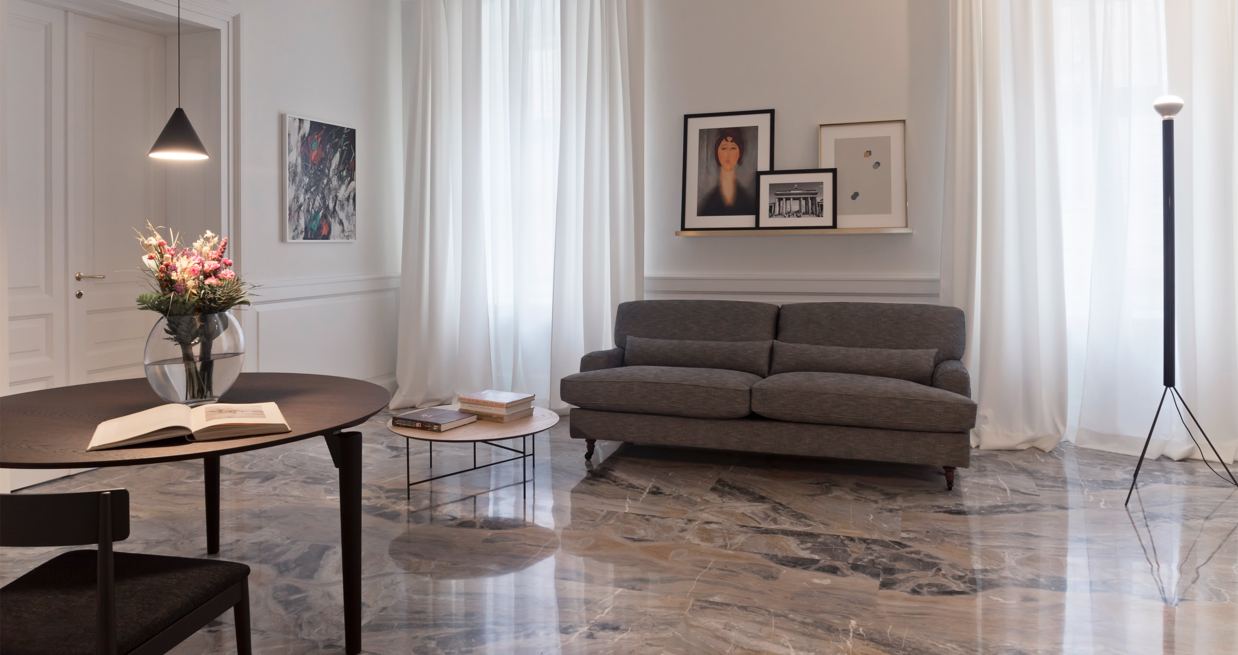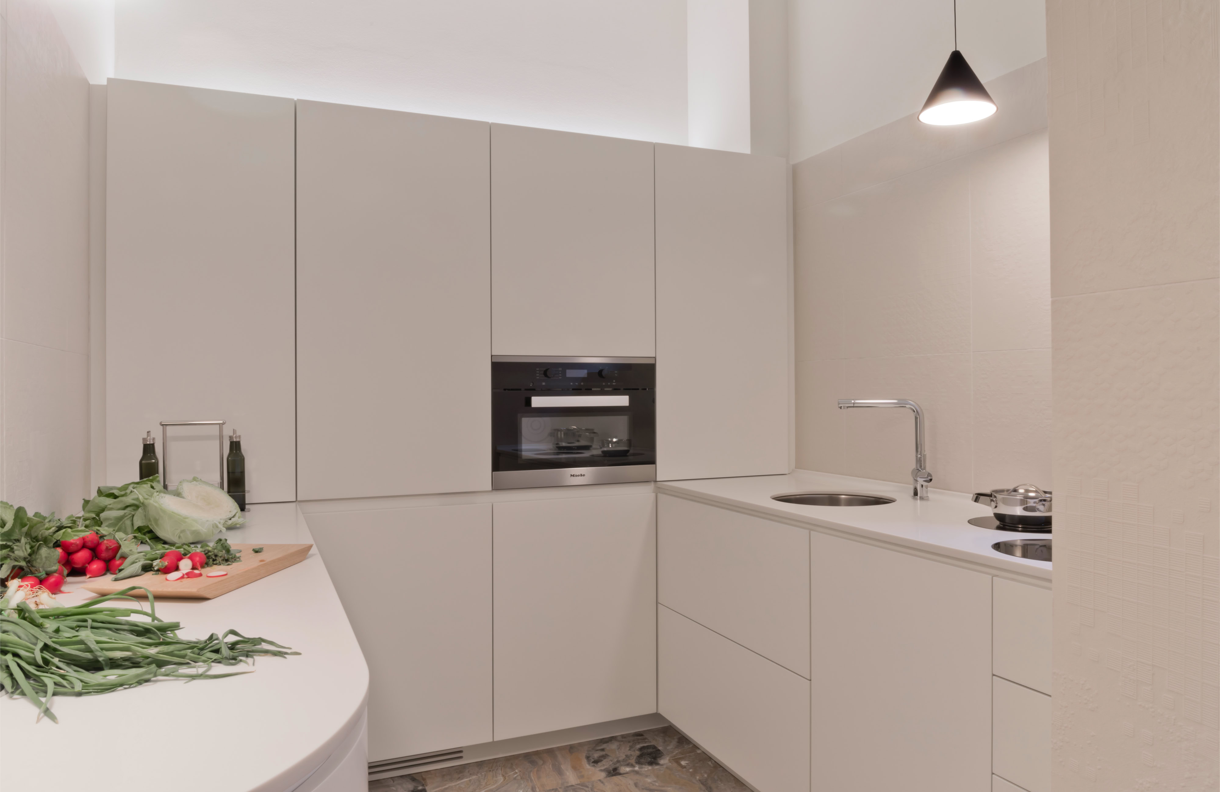 Leitmotiv il colore bianco declinato ai vari elementi e materiali di pareti e soffitti, contrapposto ad un ricco tappeto di pietra dai colori e dai disegni naturali inimitabili dell’arabescato orobico. Prestigioso marmo italiano nella varietà cromatica grigio-rosa. Una pietra cavata da più di cento anni in alta Valle Brembana, in Provincia di Bergamo.