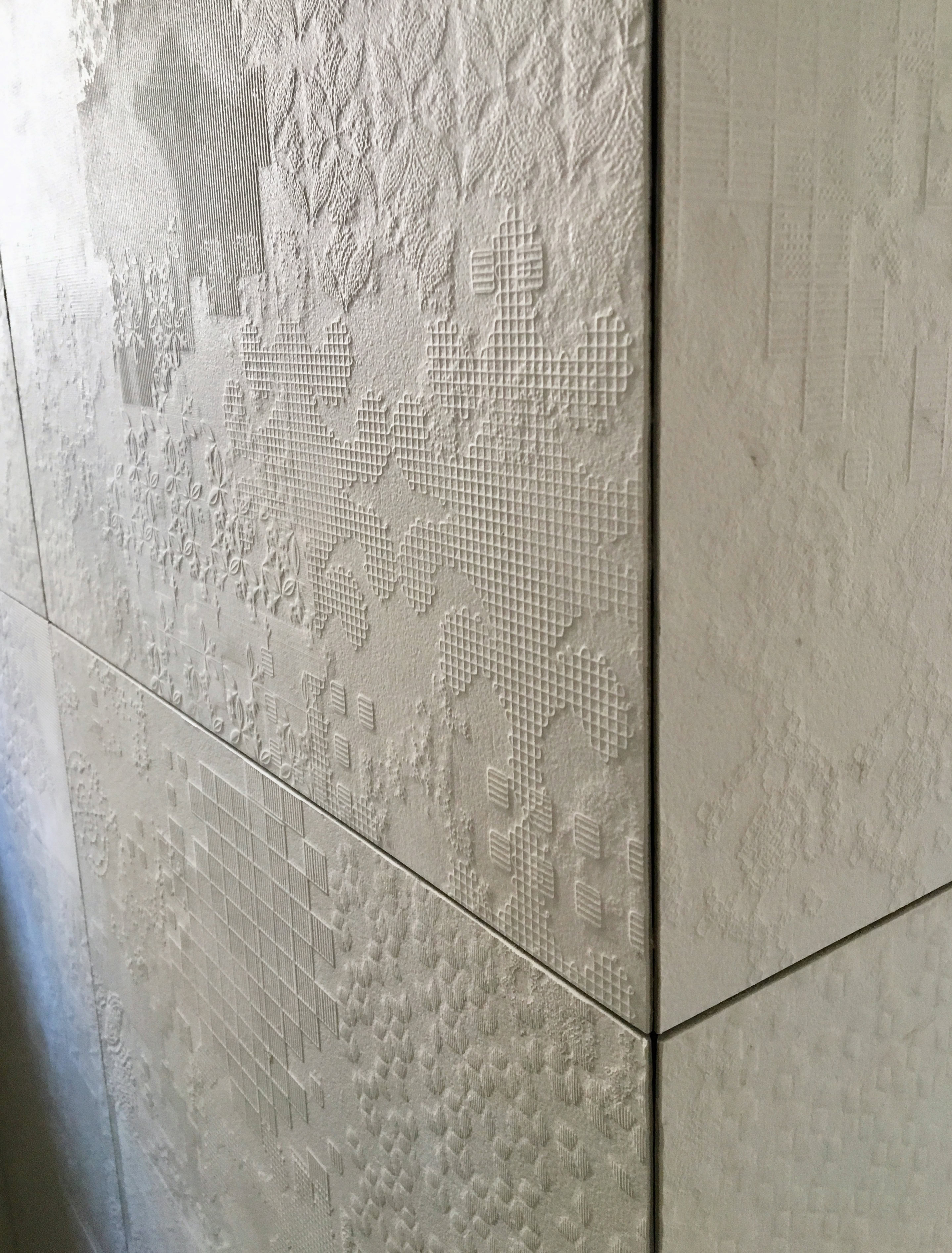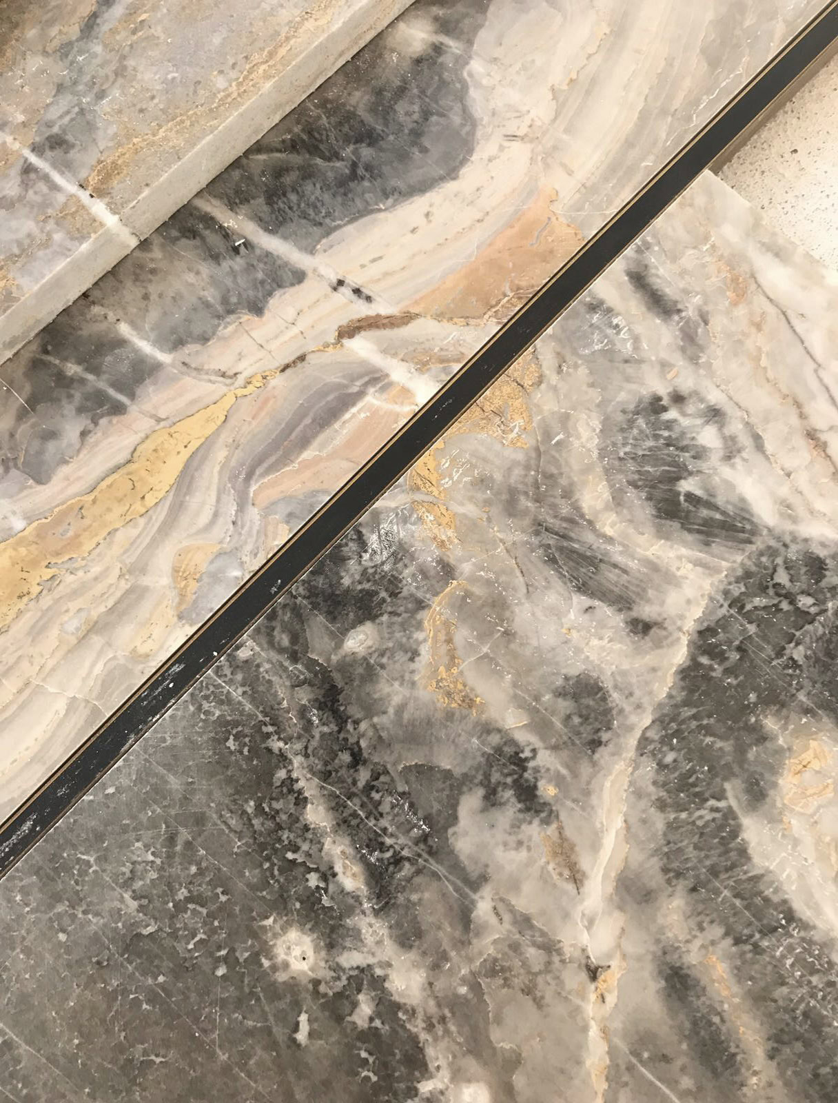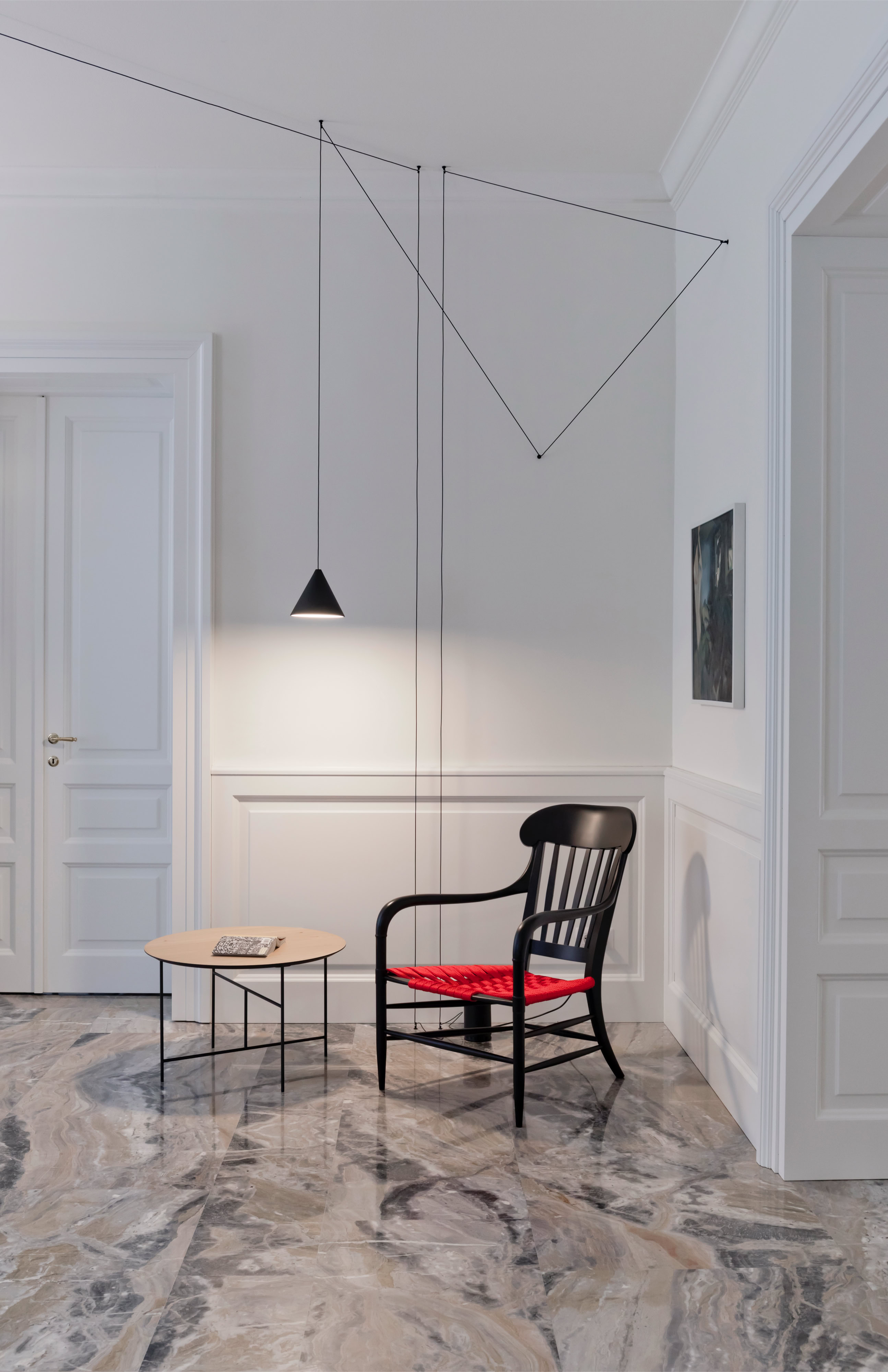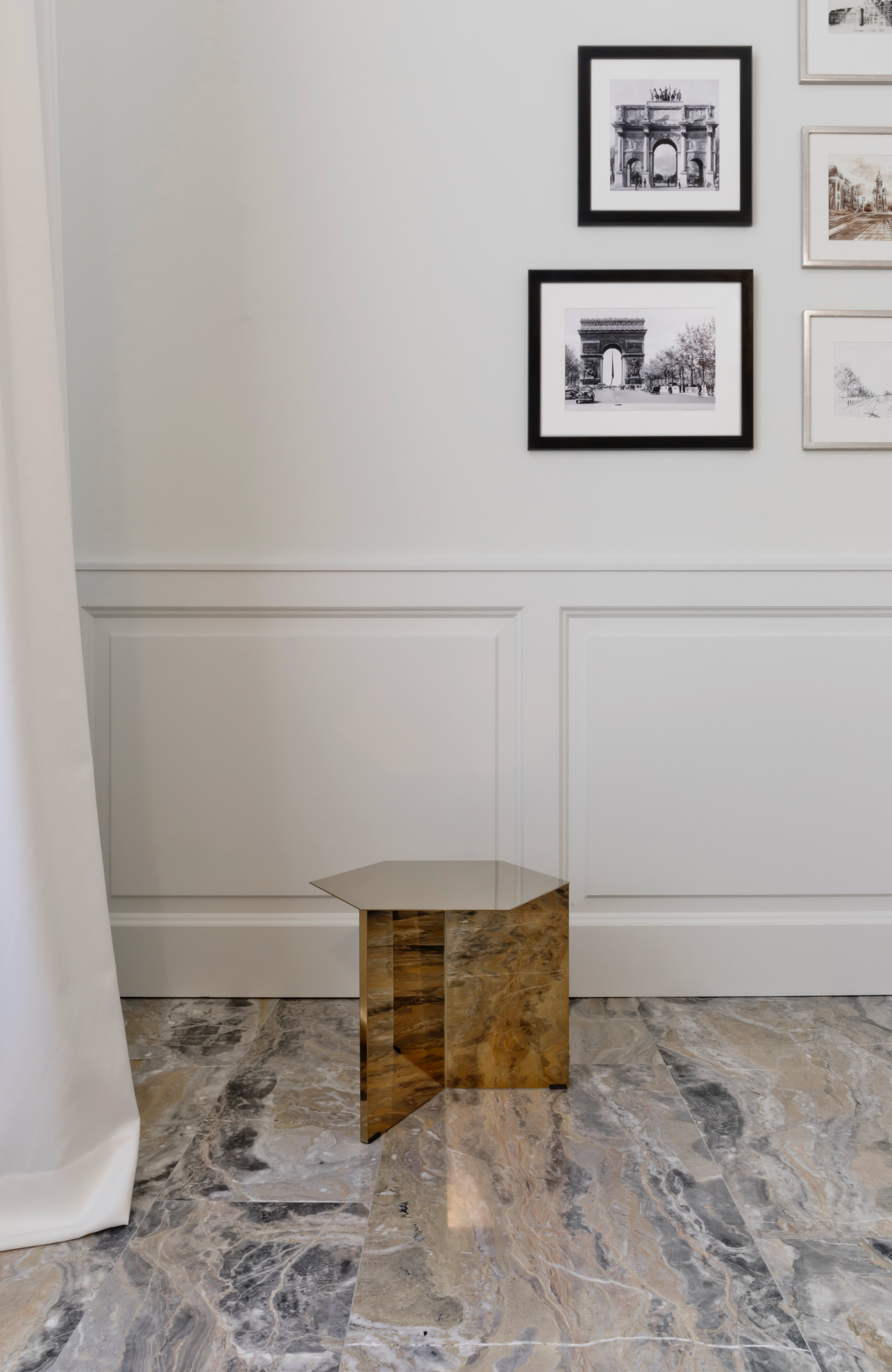 Leitmotiv il colore bianco declinato ai vari elementi e materiali di pareti e soffitti, contrapposto ad un ricco tappeto di pietra dai colori e dai disegni naturali inimitabili dell’arabescato orobico. Prestigioso marmo italiano nella varietà cromatica grigio-rosa. Una pietra cavata da più di cento anni in alta Valle Brembana, in Provincia di Bergamo.