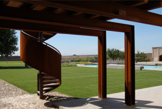 Furthermore, the project comprises a new terrace that people can enter from the first flat of the house and that is provided with stairs connecting to the outdoor area. The new building, that is completely detached and independent from the farm, is built with a corten steel framework and with a scaffold made out of wood and reinforced pilling. Parapets are made out of glass sheets supported by corten steel columns.