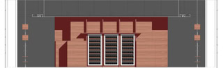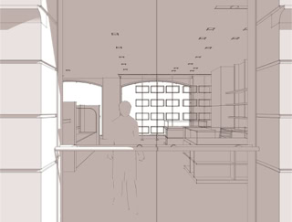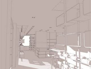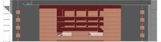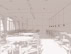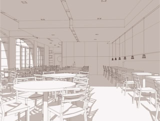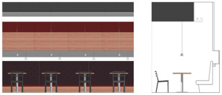 The third ambient is represented by the restaurant hall where the configuration of seating is proposed in a flexible manner, with tables of convenient dimensions, square or round in shape. The rigourous and characterising element of this ambient is the comfortable upholstered bench running the full length of the hall.