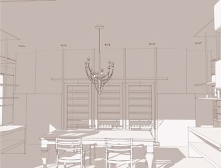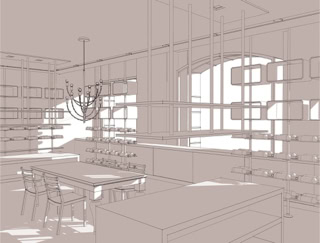 The kitchen is in open view so as to decisively contribute, by its seductive image, to the introduction to pleasures of the palate.