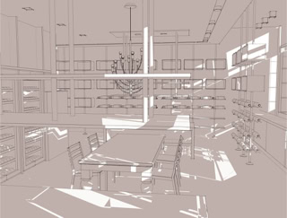 Adjacent to the gourmerie is the wine room, or enoteca one may say, characterised by the original display racks for bottles and other products, and the large central table of classical design for receptions and wine tasting. The large central chandelier is a Vico Magistretti design.