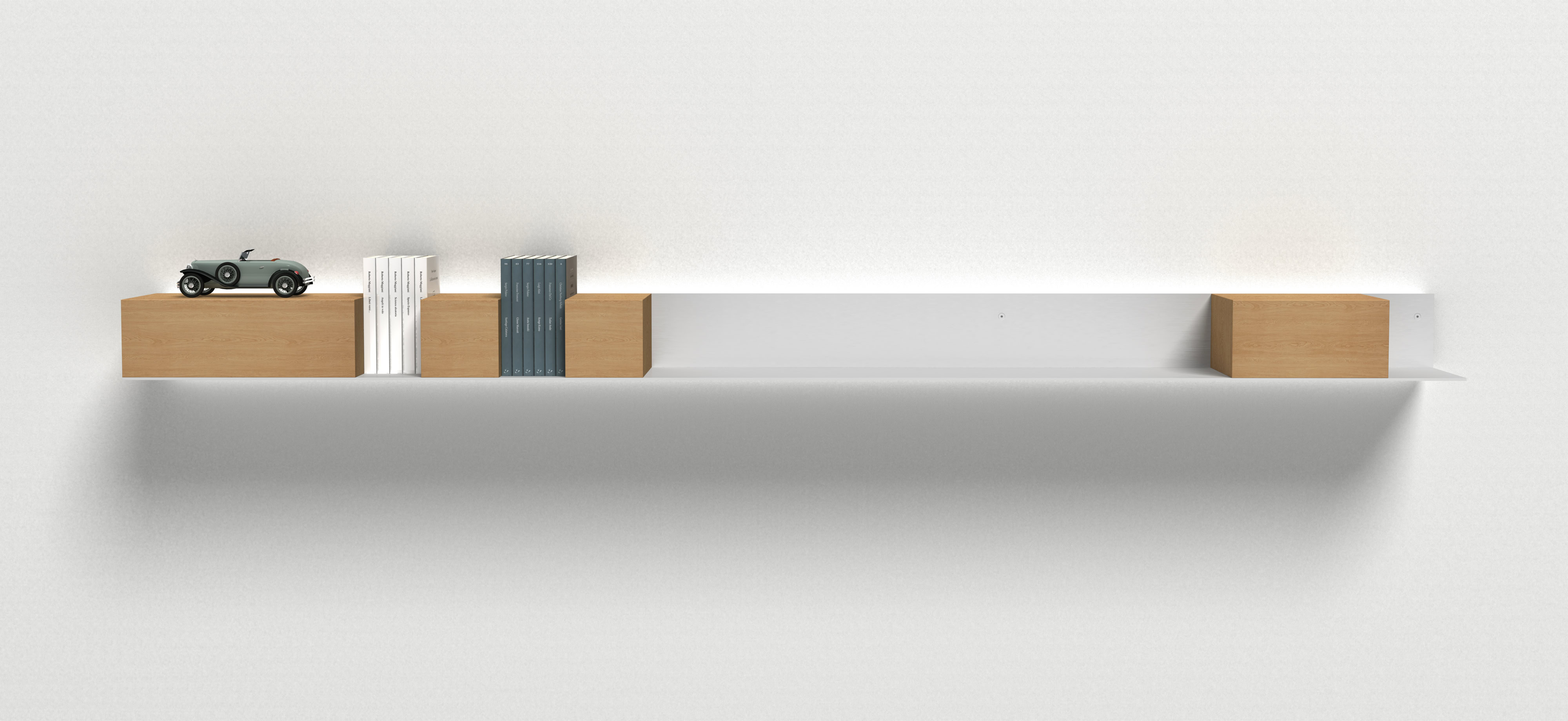 An independent shelf, yet combinable with more elements on the wall, even differently sized.