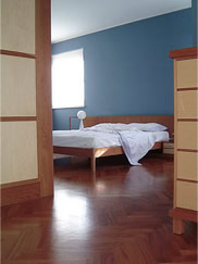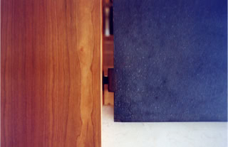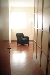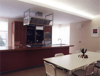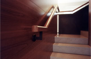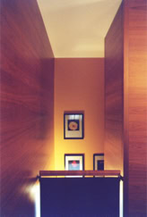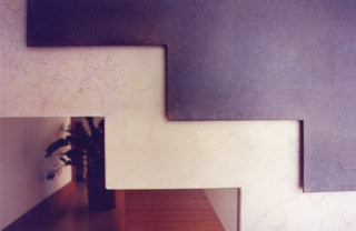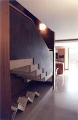 Enclosed by walls entirely lined in cherry wood, the stair in Trani marble constitutes the central element of the house and performs a double function as the vertical connection and as the screen between the areas of the home. All rooms on ground level are daylit through the openings that articulate the controlled views of the garden. The east wing of the house contains the utilities: bathroom, laundry, services room and the garage.