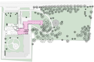 On the lower ground floor the building extension comprises the new gymnasium, change rooms, a surgery, the entrance area and storage spaces, the elevator shaft and the emergency stair.