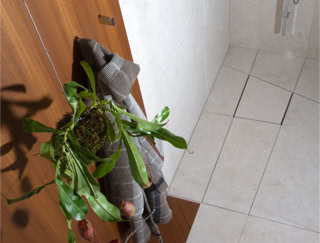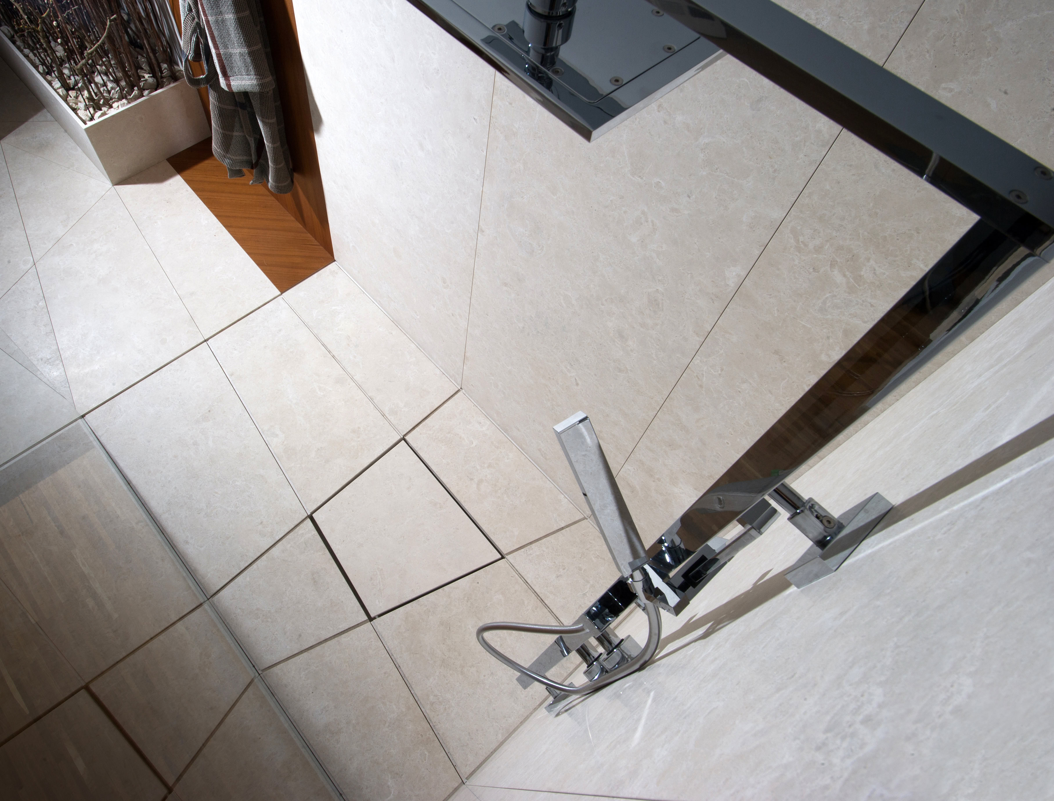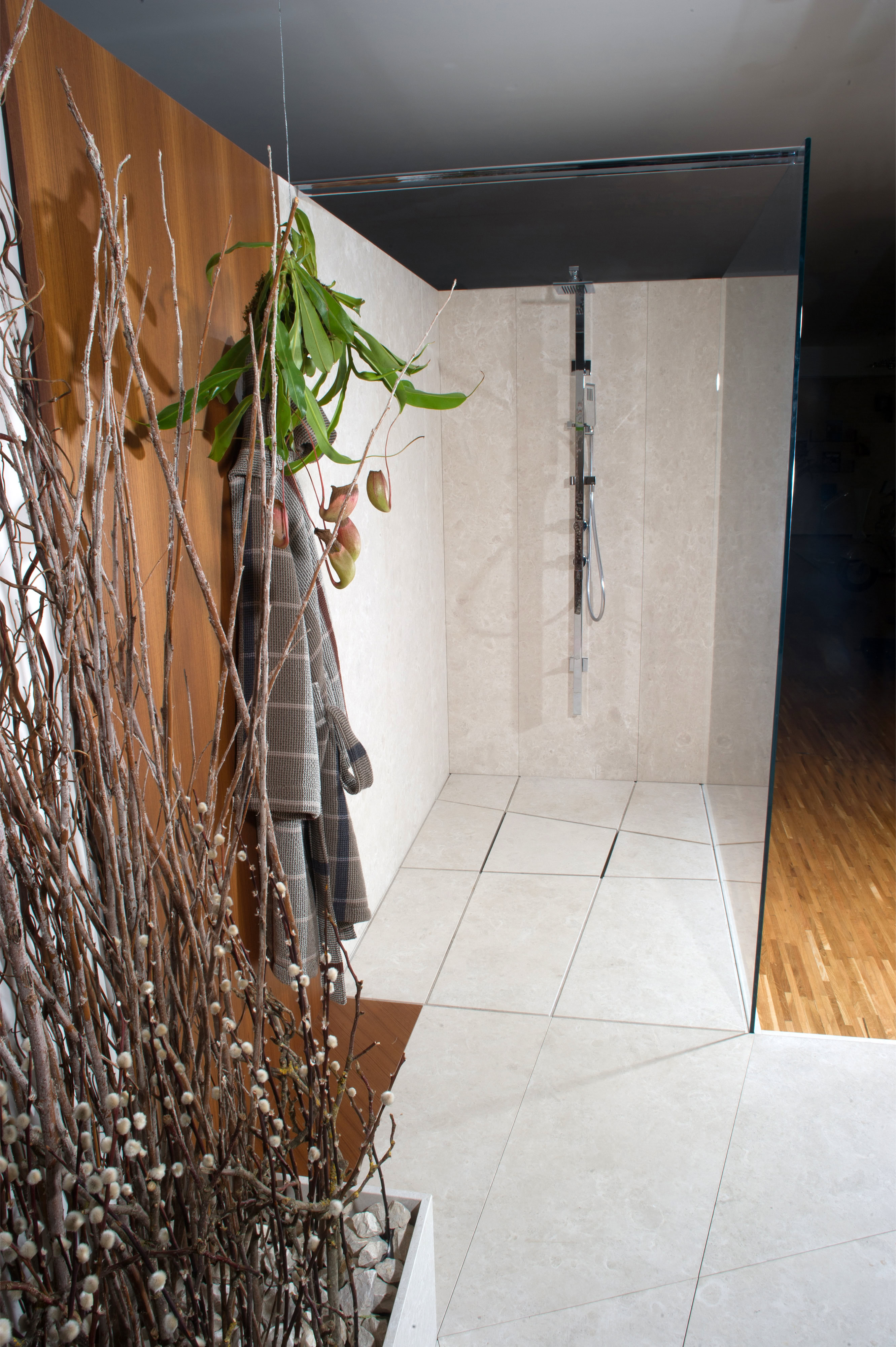 Funzionalità integrata: la piletta di scarico è celata da una lastra in pietra apribile, conservando così la continuità del pavimento.