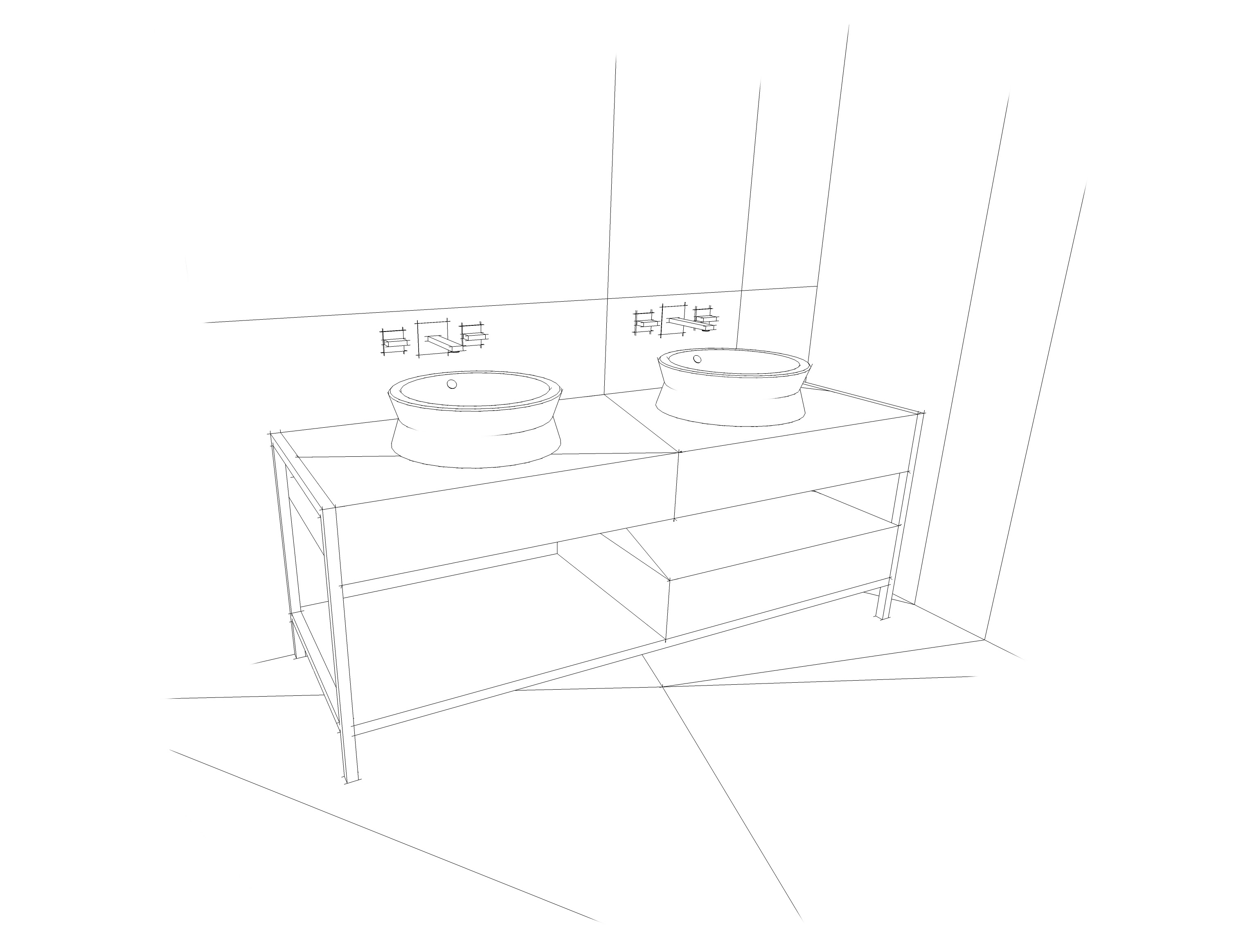 Un mobile su misura essenziale e seducente al tempo stesso, dotato di un piano di appoggio, cassetti e ripiani per accessori, cosmetici e salviette.