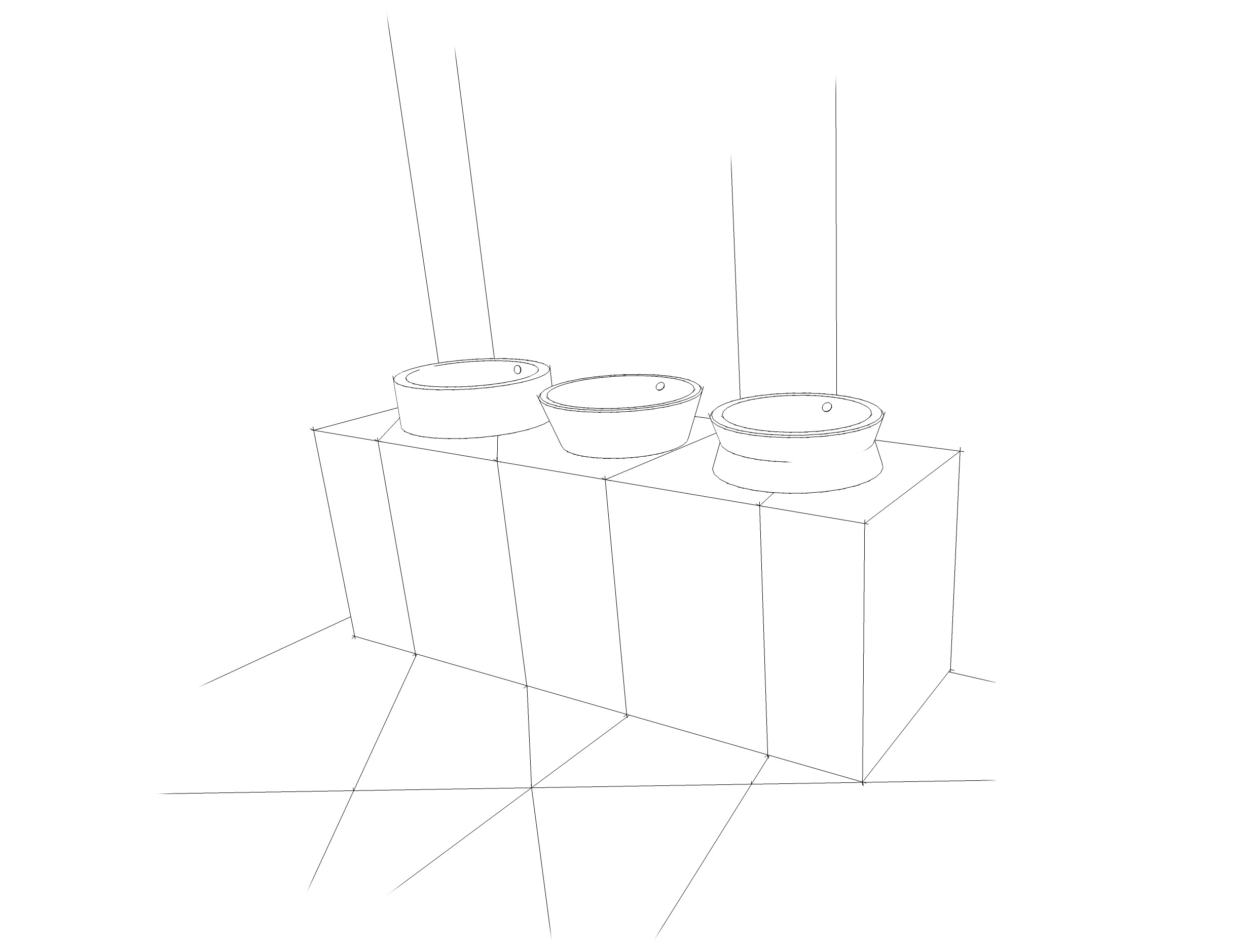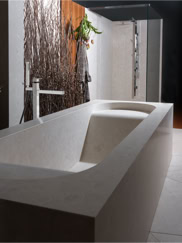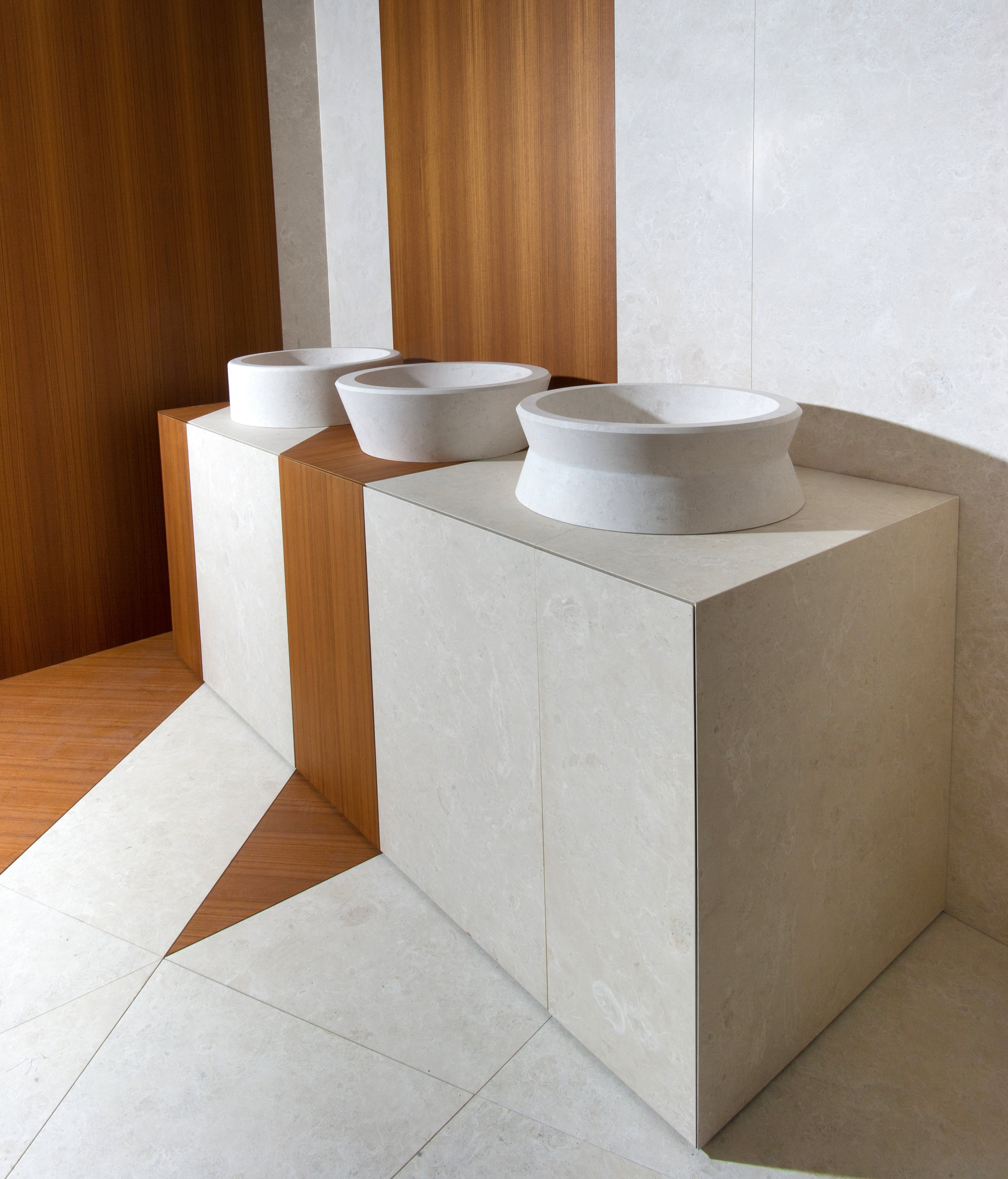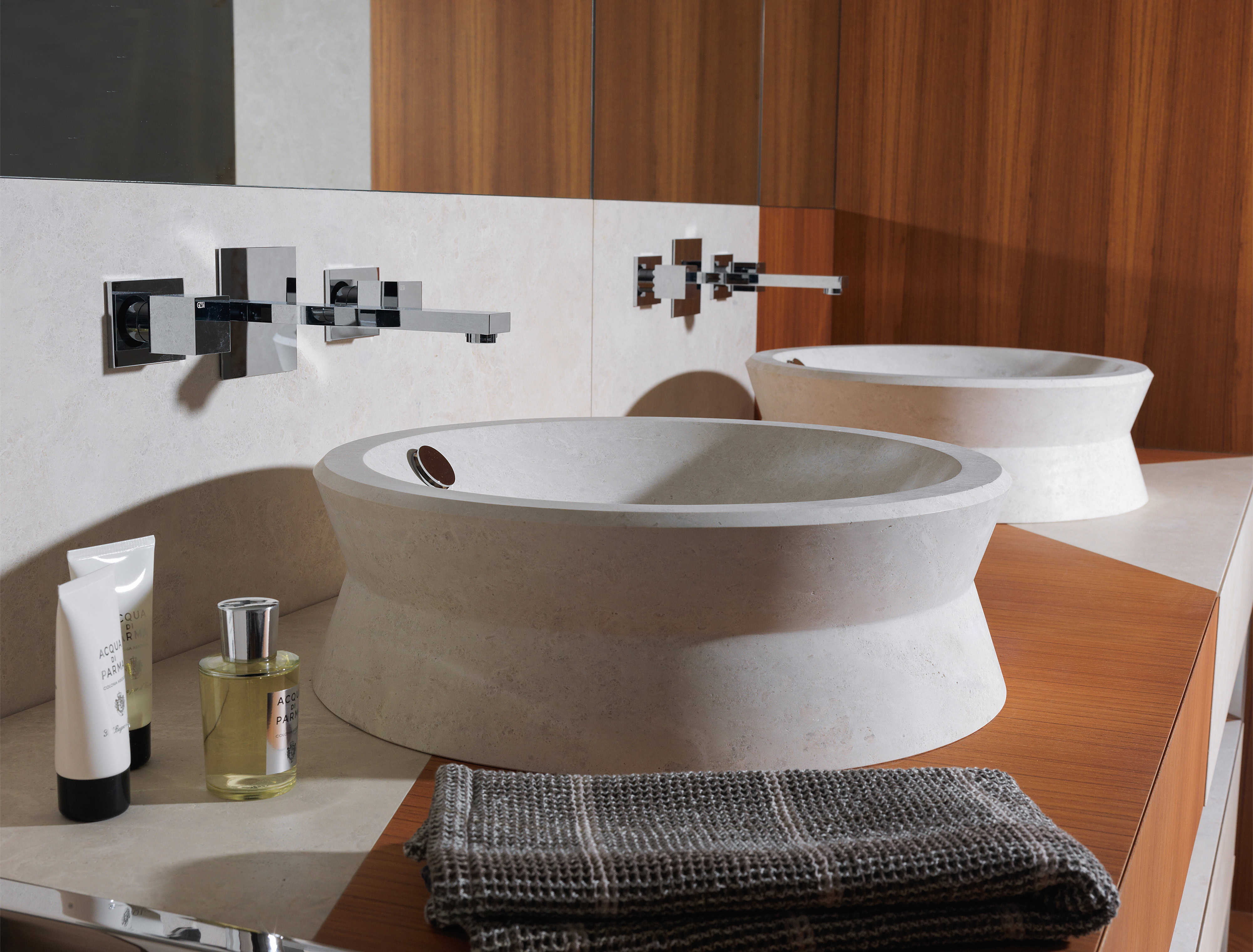 I lavabi da appoggio Fusion sono ricavati da un unico blocco di pietra in tre versioni, quasi a voler progredire nella trasformazione della materia, dalla forma più semplice a quella più complessa.