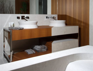 La collezione prevede l’impiego di materiali naturali esclusivi, come marmi, graniti e legno naturale, in coordinamento con rubinetteria, telai e complementi metallici con diverse finiture superficiali, consentendo di allestire ambienti secondo i desideri del Cliente, con tutto il calore dei prodotti naturali.