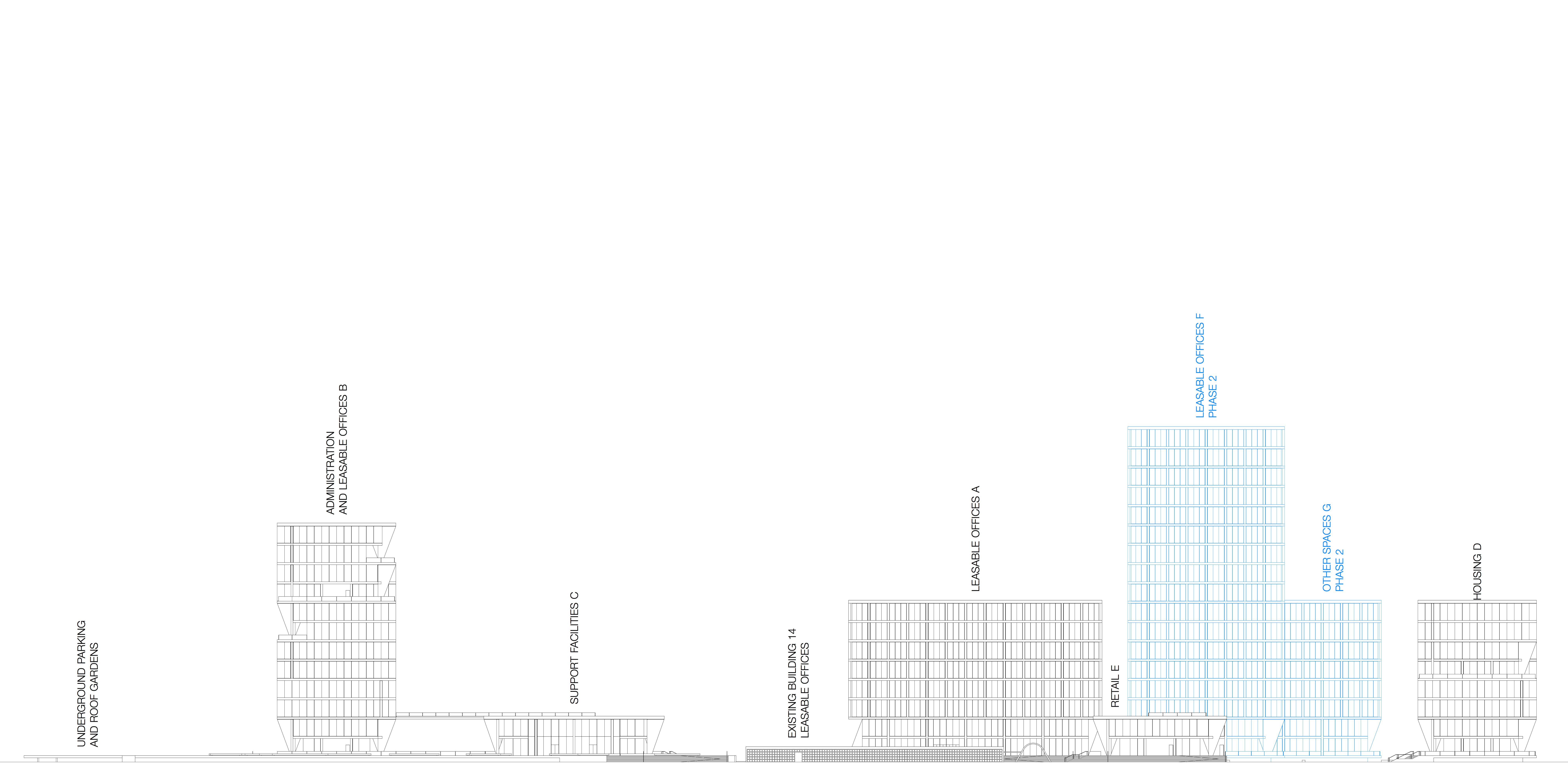 Tutti gli edifici sono connessi da spazi e percorsi rialzati, con grandi terrazze e grandi sbalzi volti ad alleggerirne la connessione a terra. Ai piani superiori le connessioni tra i vari edifici generano al piano terra grandi spazi aperti coperti, portici ombreggiati per una confortevole socialità. Terrazze e giardini trasformano le coperture degli edifici in ulteriori spazi da vivere.