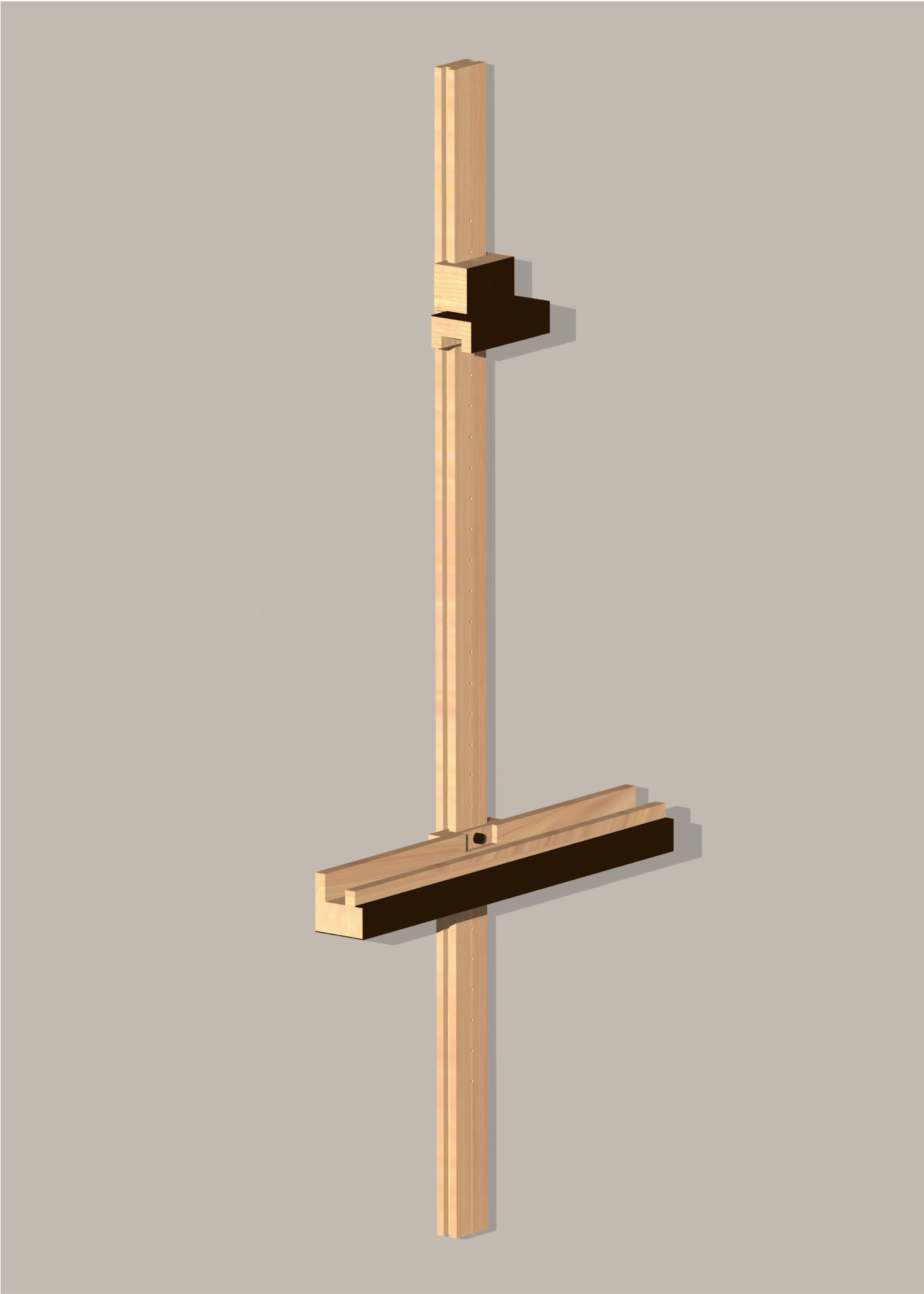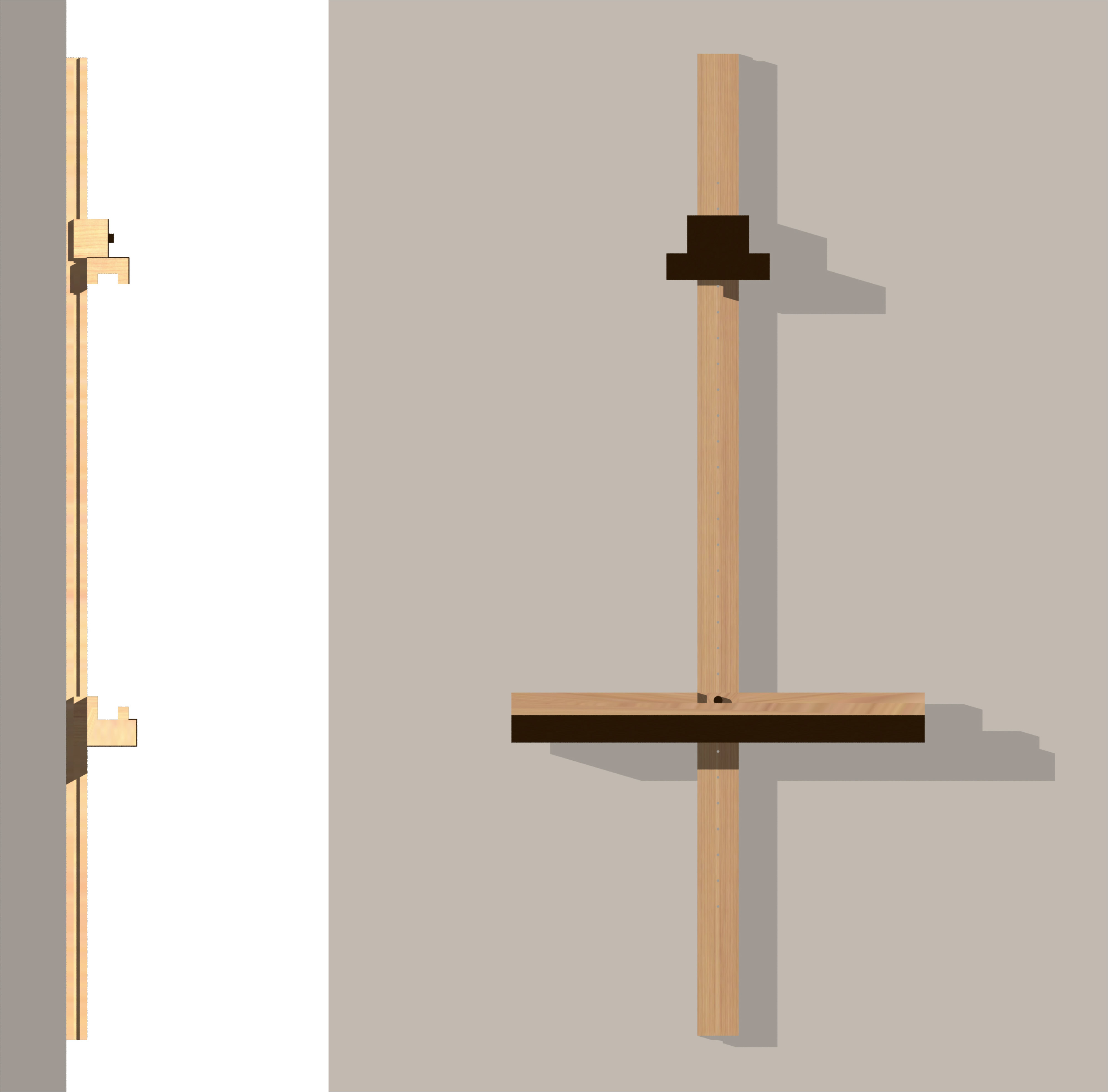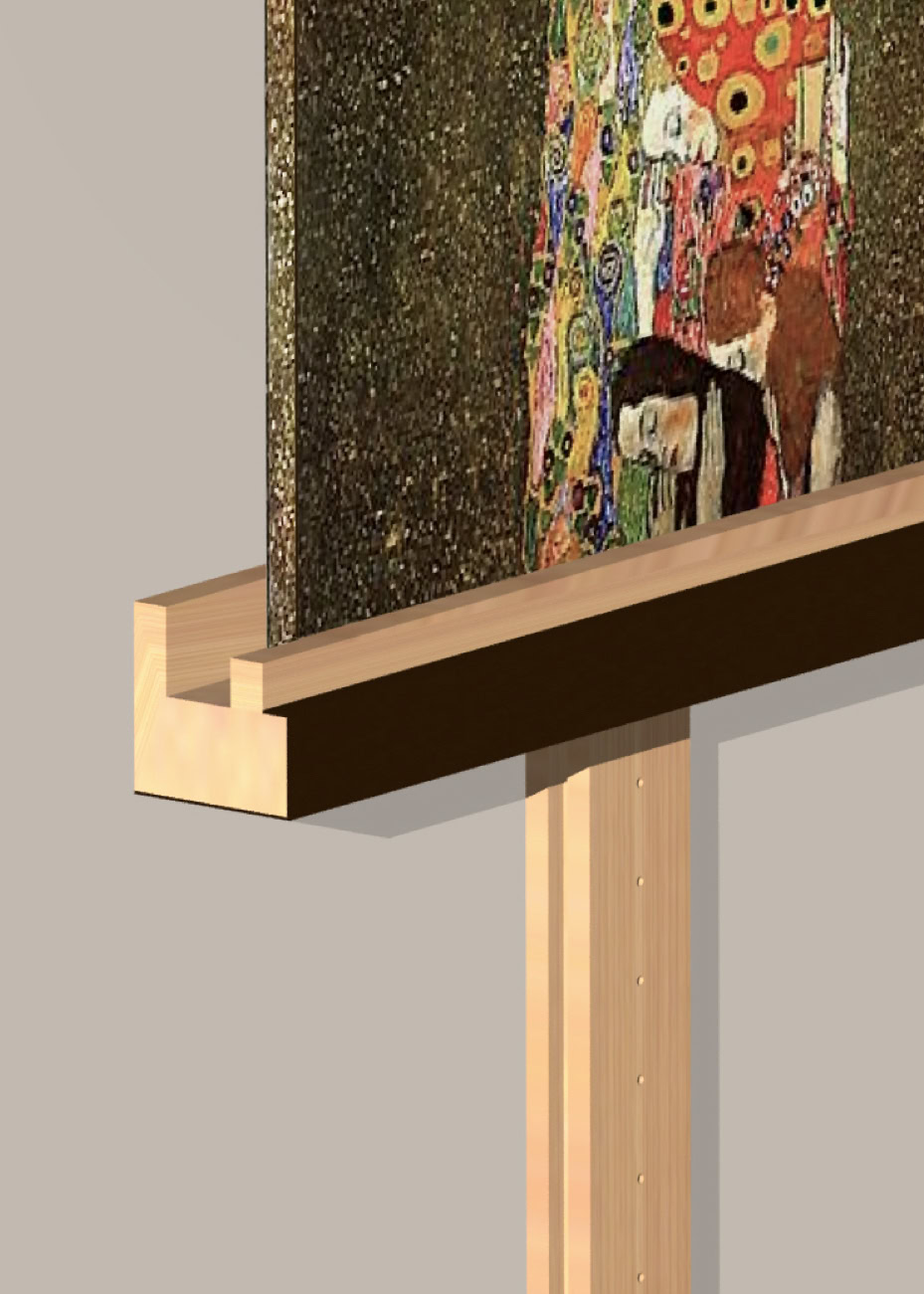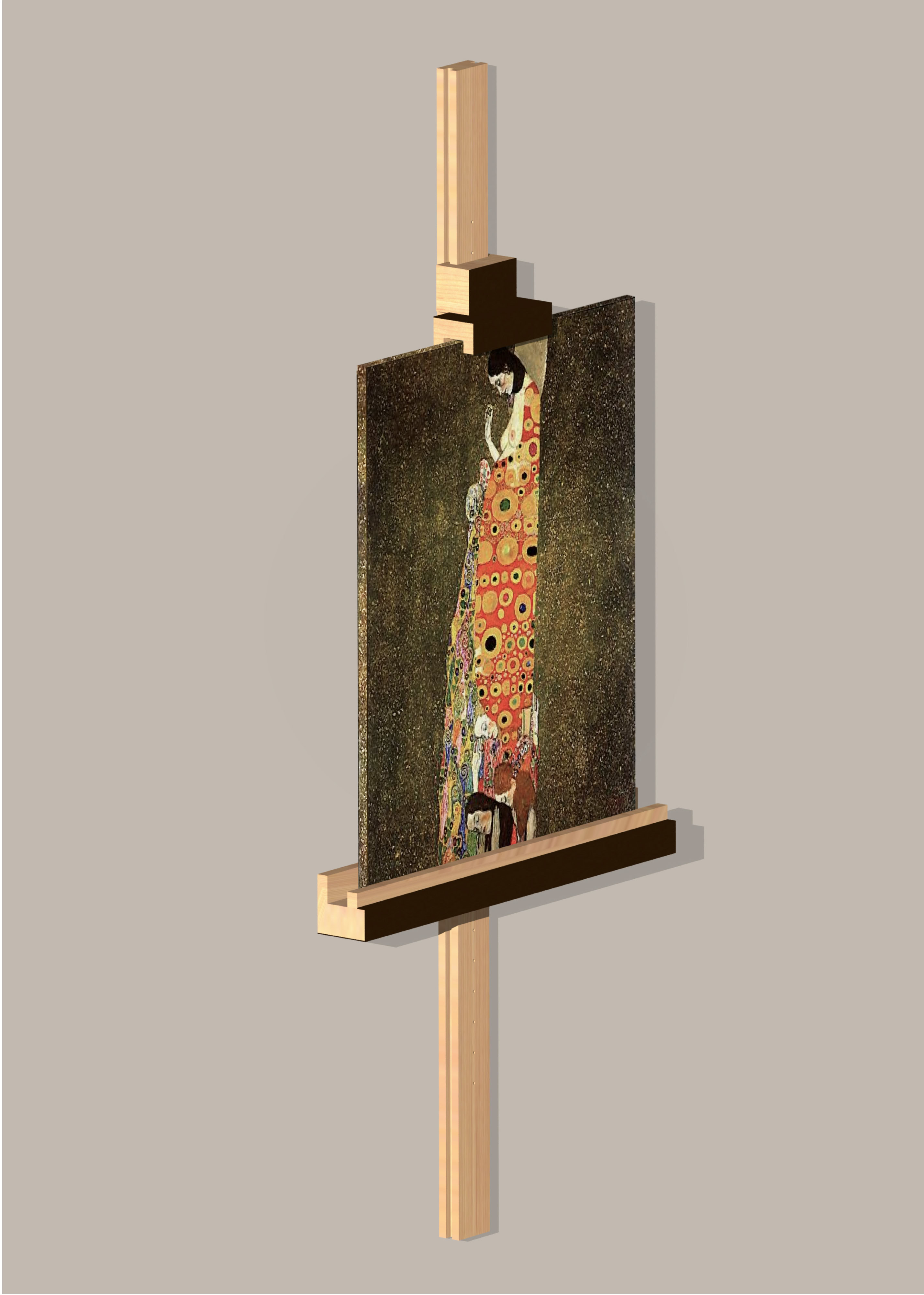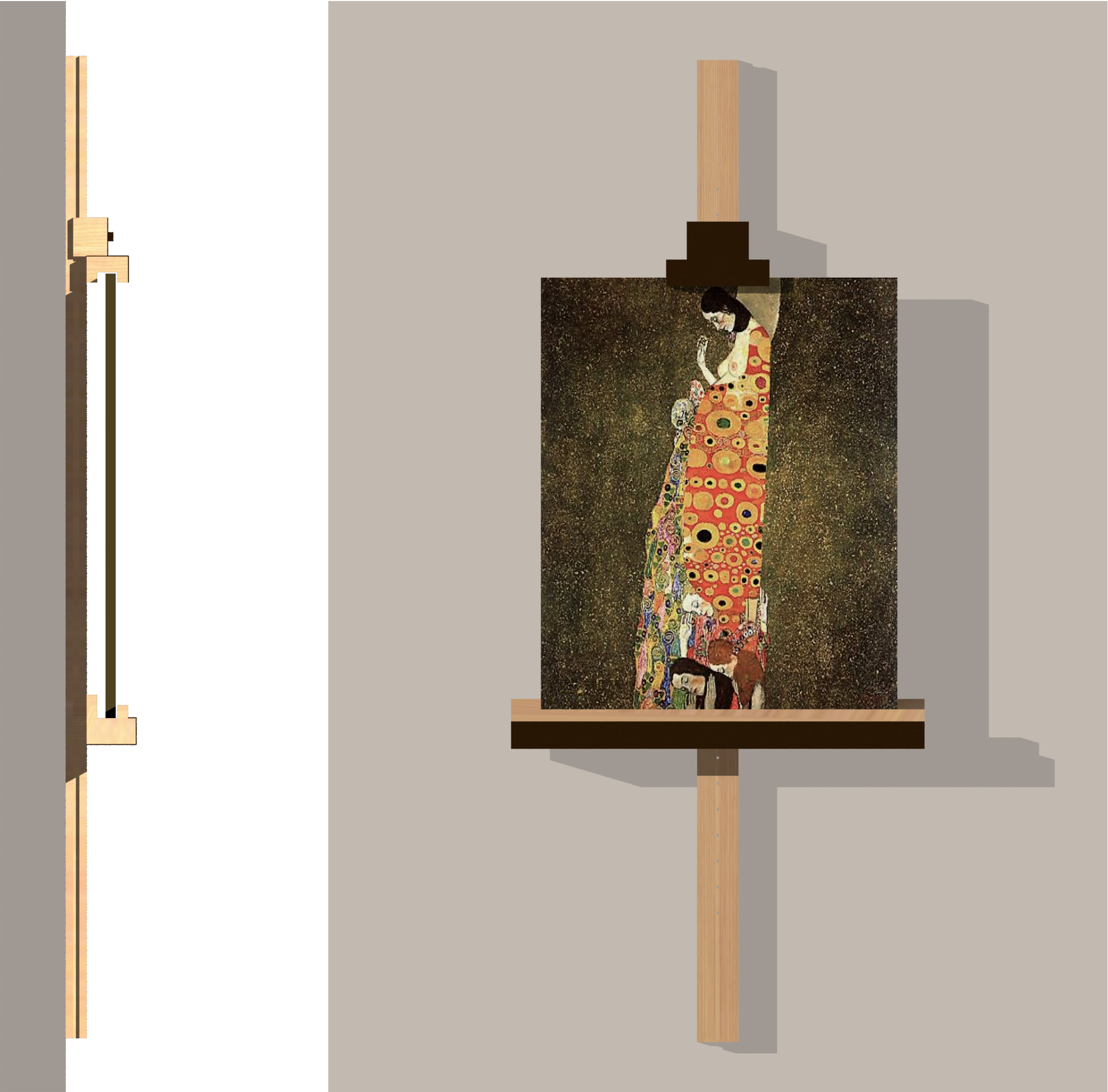 Espositore da parete per tele, in legno massello di ciliegio o rovere, con supporti di base e superiore regolabili in altezza lungo la barra verticale e parzialmente rivestiti in lamiera di ferro ossidata e cerata.