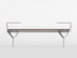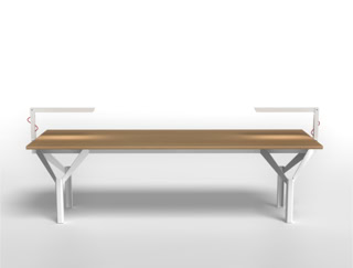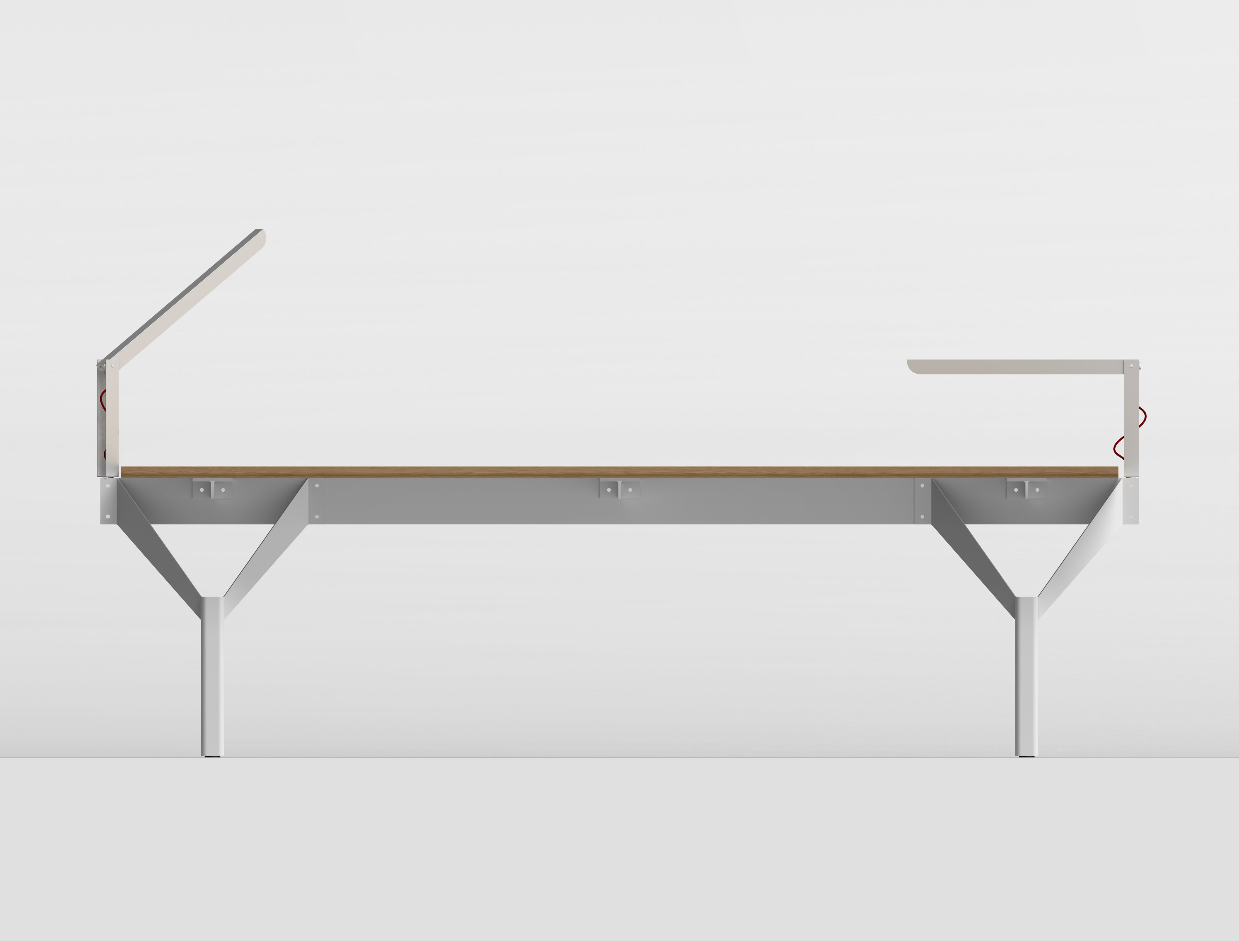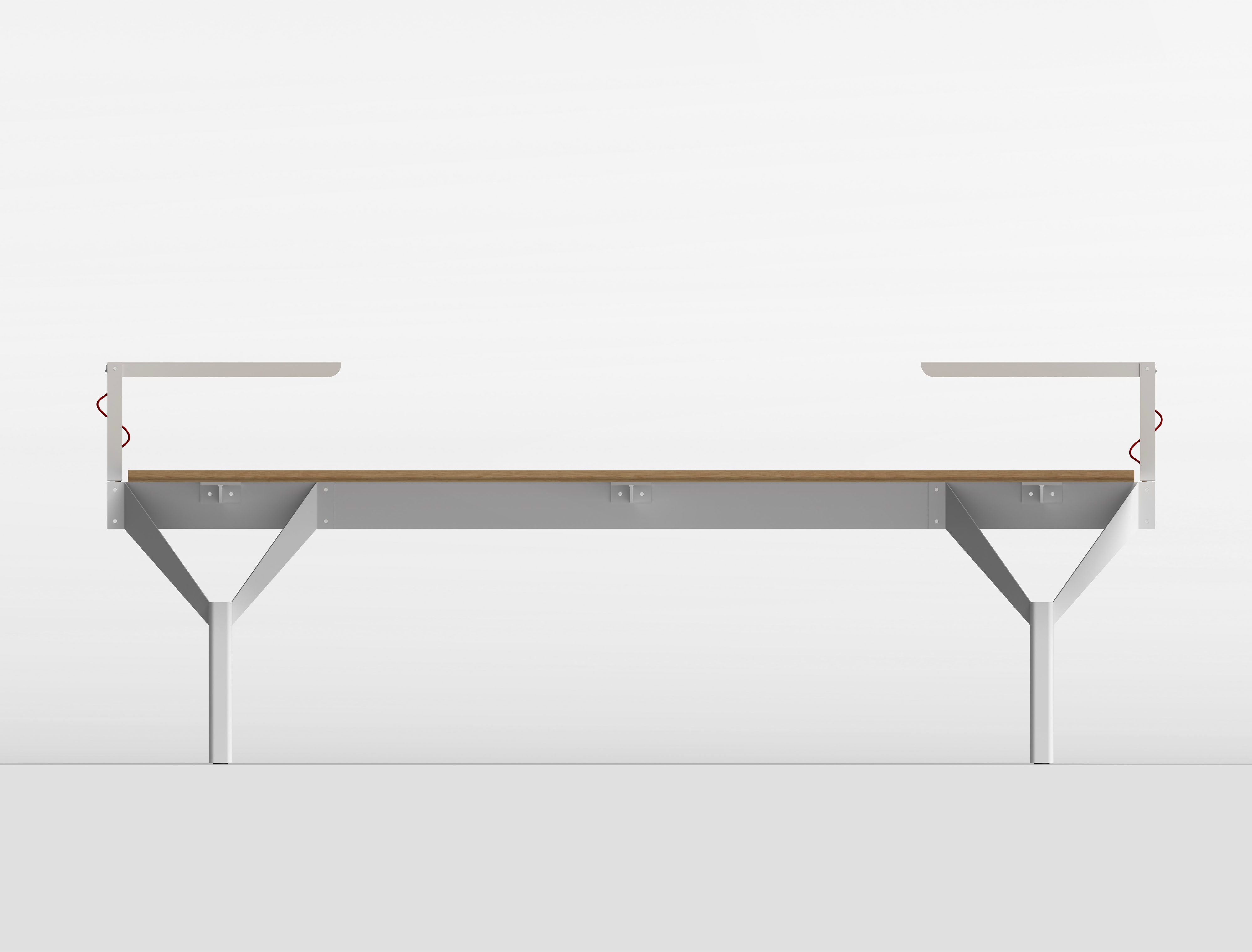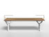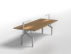 La base del tavolo è ottenuta dall’assemblaggio di una trave centrale e di lamiere in acciaio tagliate secondo un disegno predefinito e piegate. Tre supporti realizzati con profili in acciaio a “T” garantiscono la stabilità del piano orizzontale. È prevista una verniciatura di tutte le parti metalliche con effetto goffrato in colore bianco o nero.