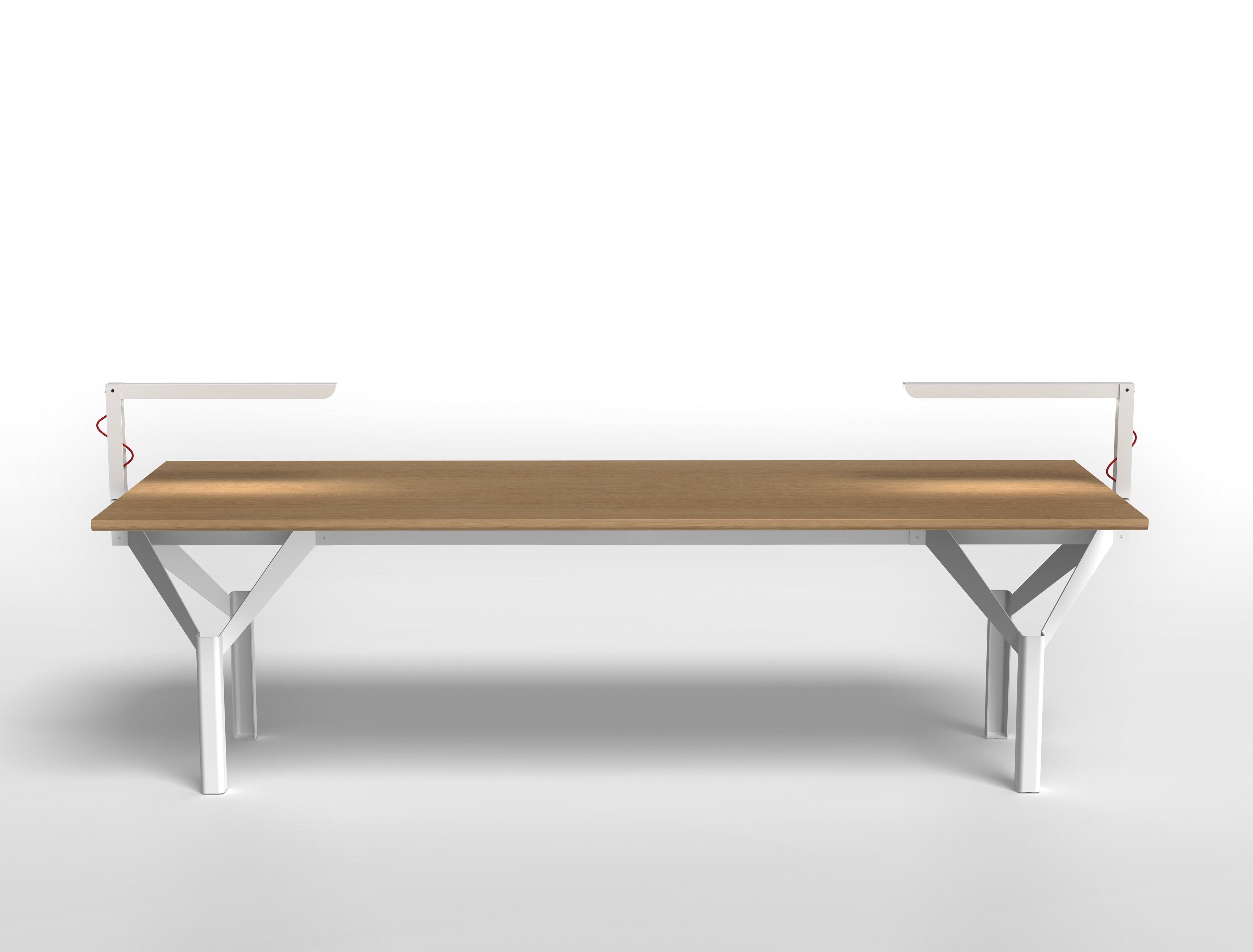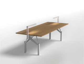 Il corpo illuminante è in lamiera di acciaio piegata e verniciata. La sorgente luminosa è una led strip con diffusore in PMMA. L’alimentazione avviene attraverso un cavo passante nella trave centrale della struttura portante del tavolo, dove è collocato il trasformatore elettronico.