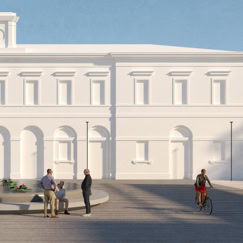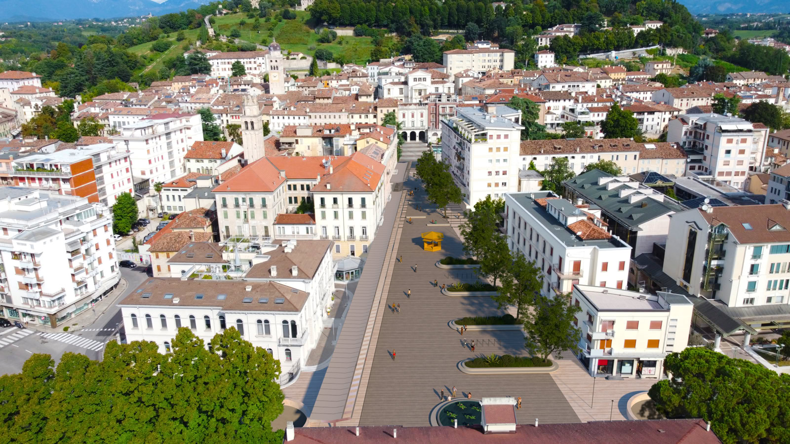 La proposta progettuale prevede il ridisegno complessivo dello spazio pubblico compreso tra la Scalinata degli Alpini e la Stazione. La composizione classica dell’impianto urbano compreso tra questi due poli rappresenta l’elemento di innegabile prevalenza sulla scena urbana della nuova Piazza fatta di pietra, acqua e alberi, dove le scelte progettuali hanno individuato interventi compatibili, dimensionalmente, funzionalmente ed in termini materici, con il genius loci e con il programma funzionale.