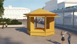 L’edicola è stata ripensata e riprogettata in chiave contemporanea con una qualità compositiva e costruttiva corrispondenti alla qualità della nuova Piazza. Posta in asse con l’ingresso alla Corte delle Rose ne rimarca la centralità, arricchendo la sequenza dei percorsi pubblici con nuove ed inedite visuali.