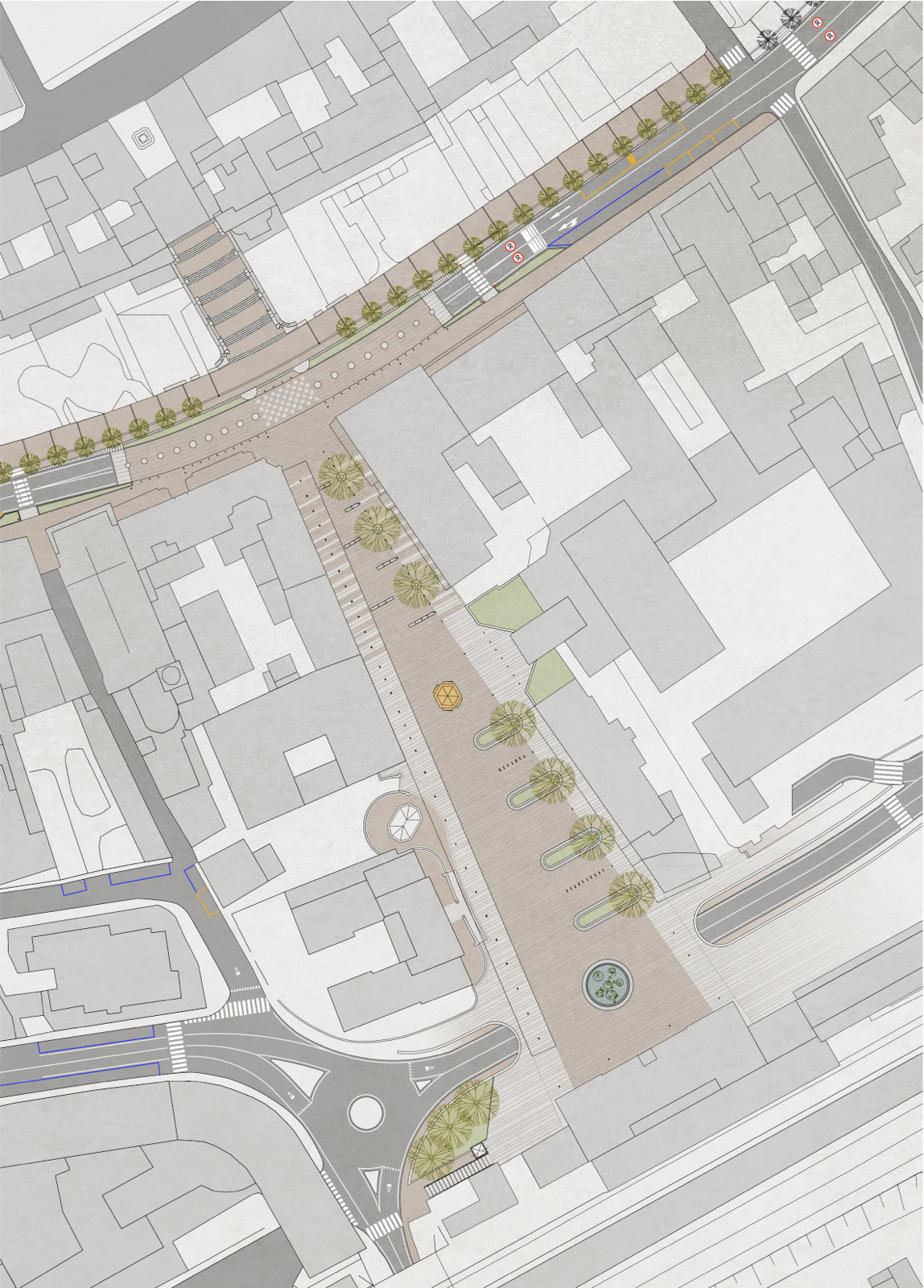 Quest’ultimo punto ridefinisce lo spazio esistente e trasforma la strada in Piazza, invertendo la gerarchia dei percorsi, con la rivendicazione e riappropriazione da parte dei pedoni della strada ed in generale degli spazi aperti ad essa connessi come spazio pubblico di qualità a dimensione umana. Nel nuovo assetto proposto gli spazi sono posti allo stesso livello degli attuali marciapiedi, dando continuità ed unità alla nuova Piazza.