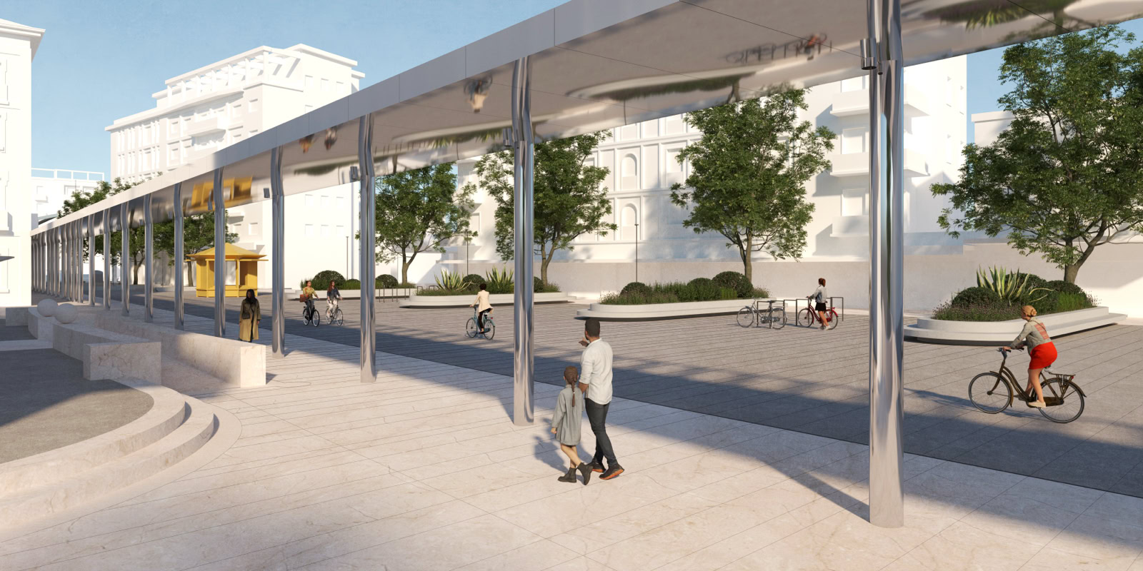 - un’ampia zona centrale di attraversamento ciclopedonale e di connessione tra la nuova Piazza e la scalinata.