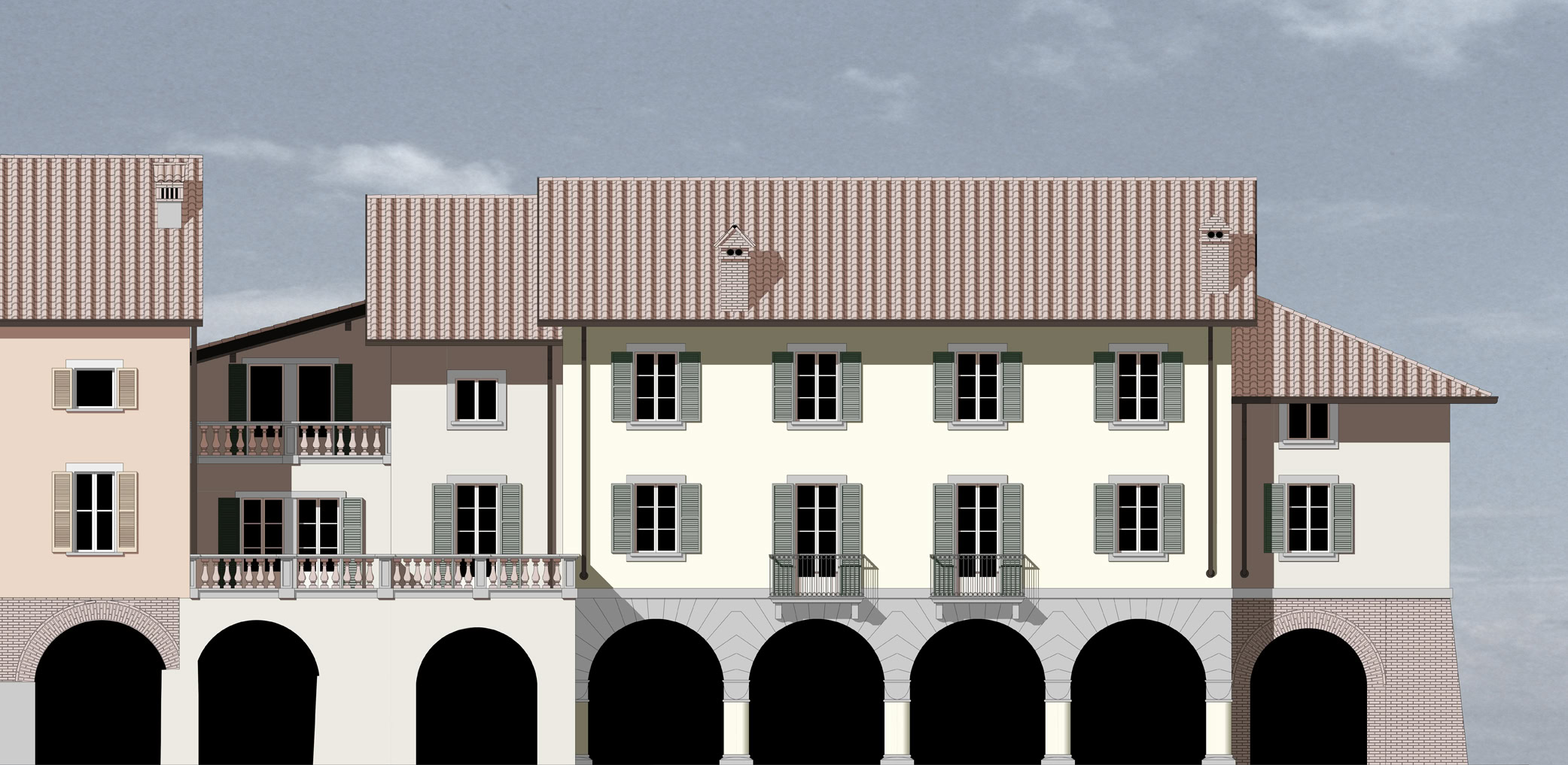 Nell’ambito del generale intervento di riqualificazione della scena urbana sulla piazza, è prevista la realizzazione di un nuovo portico, a completamento del porticato esistente.